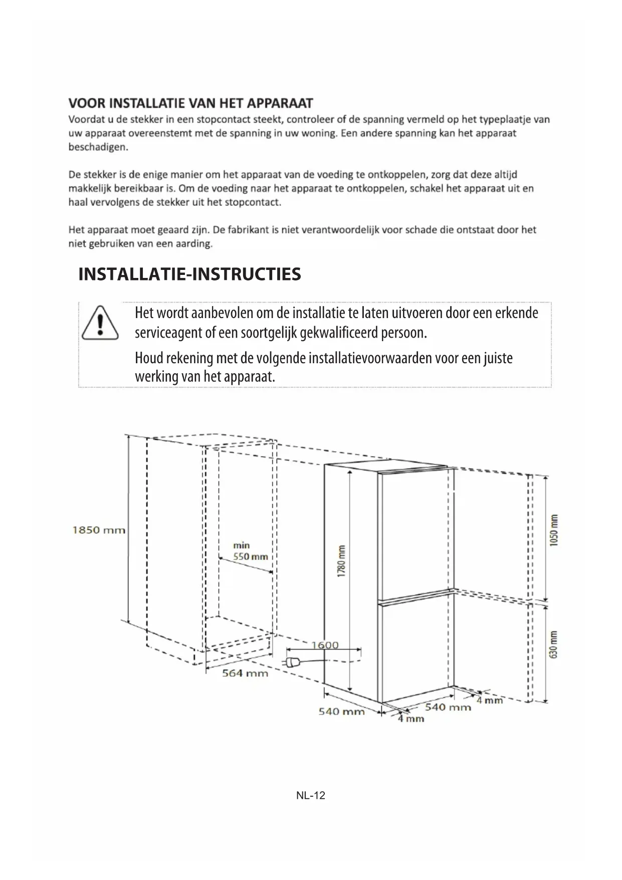 ±]NL-2" NL-3NL-4NL-5NL-6 #L,# $ x $*5''(,57','$#*)&')''(*$,)-3'(7'$,67'7'53#87#();=,3-7#)7'='%(''(,()-3'(7'$7' *)##)§,37)#+<)'3-'$#)'(,&&,-'$%',6*$5%)%(-9#(,(-'%(7'3'()%7'(*<')*6'$'()'9,,3,&'( x (),66'$<')#66#3##)9#(7'(')9,'7%(-%(7%'((%')%(-'?35%'(#$9,3'(*)'3'%(%-'('3§%7'3#$$' $'9'(*&%77'$'(9,,37#)5<')#66#3##)3'%(%-) x $##)*-''()'-3,)'$'9'(*&%77'$'(%(<')#66#3##),&''(9'3''37'§'3%(-)'9'3&%7'( x %)'3*)'9,,3=%+<)%-<'%7%*-'?,7'(?%<')9'36$##)*'(9#(<')#66#3##) x )#,8*)'5((%'),6<')9,')*)5,87'53;')+ $Q%*..(&V& ¦,'$#*)'(?'9#))'(,'$&%77'$'(-#**'(%(7'%*,$#)%' ¦,'$&%77'$'(?$##*-#**'(&,-'('('$7,,3''(7'*5(7%-'§,37'(9'3§%7'37,()3,$''3,87' ?5%='(9#(<'),'$+%3+5%)(%')?'*+<#7%-7=%(9,,37#)5<')63,75+),6''(5%*)'&#(%'3#87#() NL-7/ NL-8NL-9NL-10NL-11Het wordt aanbevolen om de installatie te laten uitvoeren door een erkende serviceagent of een soortgelijk gekwalificeerd persoon. Houd rekening met de volgende installatievoorwaarden voor een juiste werking van het apparaat. INSTALLATIE-INSTRUCTIES NL-12Installeer het apparaat in een droge en goed geventileerde ruimte. Houd uw apparaat uit de buurt van warmtebronnen, vochtige plaatsen en direct zonlicht. Zorg voor een gepaste ventilatie rondom het apparaat voor een efficiënte werking van het apparaat.