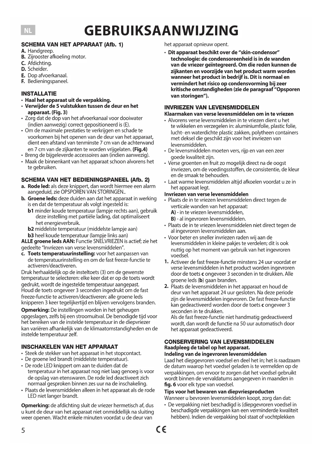 Plaats de levensmiddelen in het apparaat en houd de deur van het apparaat 24 uur gesloten. Na deze periode zijn de levensmiddelen ingevroren. De fast freeze-functie kan gedeactiveerd worden door de toets c ongeveer 3 seconden in te drukken. Als de fast freeze-functie niet handmatig gedeactiveerd wordt, dan wordt de functie na 50 uur automatisch door het apparaat gedeactiveerd.