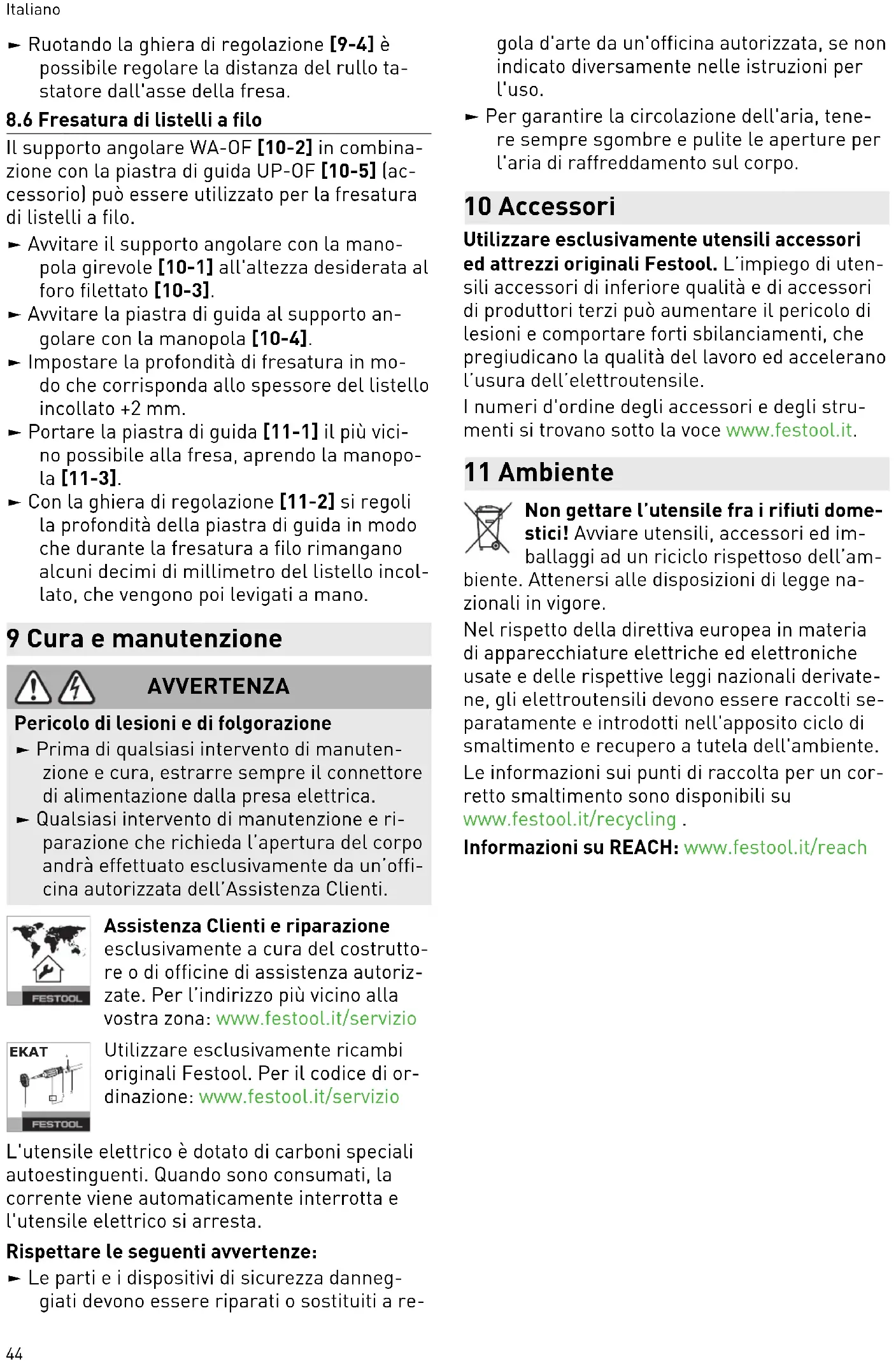 Met de hoekarm WA-OF [10-2] in verbinding met de geleideplaat UP-OF [10-5] (accessoire) kunnen overstekende kantstukken vlakge freesd worden. ► De hoekarm met de draaiknop [10-1] in de gewenste hoogte aan de schroefdraadbo ring [10-3] vastschroeven. ► De geleideplaat met de draaiknop [10-4] aan de hoekarm vastschroeven. ► De freesdiepte zo instellen dat deze de dikte van het kantstuk +2 mm bedraagt. Nederlands 50► De geleideplaat [11-1] door openen van de draaiknop [11-3] zo dicht mogelijk tegen de frees brengen. ► Met de stelknop [11-2] de diepte-instelling van de geleideplaat zo uitvoeren dat bij het vlakfrezen enkele tienden van millimeter van het kantstuk overblijven die achteraf met de hand afgeslepen worden. 9 Onderhoud en verzorging WAARSCHUWING Gevaar voor letsel, elektrische schokken ► Vóór alle onderhouds- en reinigingswerk zaamheden de stekker altijd uit het stop contact trekken! ► Alle onderhouds- en reparatiewerkzaam heden waarvoor het vereist is om de behui zing te openen, mogen alleen in een geau toriseerde onderhoudswerkplaats worden uitgevoerd. Klantenservice en reparatie alleen door fabrikant of door servicewerk plaatsen. Adres bij u in de buurt op: www.festool.nl/service Alleen originele Festool-reserveon derdelen gebruiken! Bestelnr. op: www.festool.nl/service EKAT