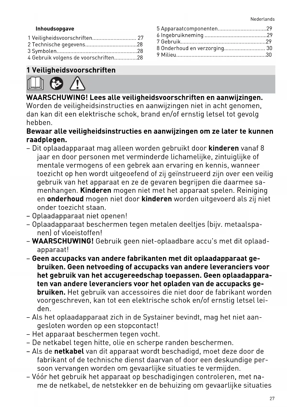7 Gebruik........................................................29 8 Onderhoud en verzorging........................... 30 9 Milieu...........................................................30 1 Veiligheidsvoorschriften WAARSCHUWING! Lees alle veiligheidsvoorschriften en aanwijzingen. Worden de veiligheidsinstructies en aanwijzingen niet in acht genomen, dan kan dit een elektrische schok, brand en/of ernstig letsel tot gevolg hebben. Bewaar alle veiligheidsinstructies en aanwijzingen om ze later te kunnen raadplegen. – Dit oplaadapparaat mag alleen worden gebruikt door kinderen vanaf 8 jaar en door personen met verminderde lichamelijke, zintuiglijke of mentale vermogens of een gebrek aan ervaring en kennis, wanneer toezicht op hen wordt uitgeoefend of zij geïnstrueerd zijn over een veilig gebruik van het apparaat en ze de gevaren begrijpen die daarmee sa menhangen. Kinderen mogen niet met het apparaat spelen. Reiniging en onderhoud mogen niet door kinderen worden uitgevoerd als zij niet onder toezicht staan. – Oplaadapparaat niet openen! – Oplaadapparaat beschermen tegen metalen deeltjes (bijv. metaalspa nen) of vloeistoffen! – WAARSCHUWING! Gebruik geen niet-oplaadbare accu's met dit oplaad apparaat! – Geen accupacks van andere fabrikanten met dit oplaadapparaat ge bruiken. Geen netvoeding of accupacks van andere leveranciers voor het gebruik van het accugereedschap toepassen. Geen oplaadappara ten van andere leveranciers voor het opladen van de accupacks ge bruiken. Het gebruik van accessoires die niet door de fabrikant worden voorgeschreven, kan tot een elektrische schok en/of ernstig letsel lei den. – Als het oplaadapparaat zich in de Systainer bevindt, mag het niet aan gesloten worden op een stopcontact! – Het apparaat beschermen tegen vocht. – De netkabel tegen hitte, olie en scherpe randen beschermen. – Als de netkabel van dit apparaat wordt beschadigd, moet deze door de fabrikant of de technische dienst daarvan of door een deskundige per soon vervangen worden om gevaarlijke situaties te vermijden. – Vóór het gebruik het apparaat op beschadigingen controleren, met na me de netkabel, de netstekker en de behuizing om gevaarlijke situaties Nederlands 27te vermijden. Bij beschadiging uitsluitend door een geautoriseerde on derhoudswerkplaats laten repareren. – Ventilatiesleuven van het oplaadapparaat niet afdekken. Het oplaad apparaat kan anders oververhit raken en niet meer goed functioneren. – Bij beschadiging en ondeskundig gebruik van het accupack kunnen dampen vrijkomen. De dampen kunnen de luchtwegen irriteren. Venti leer de ruimte en consulteer bij klachten een arts. 2 Technische gegevens Oplaadapparaat SCA 16 TCL 6 TCL 6 DUO Netspanning (ingang) 220 - 240 V~ 220 - 240 V~ 220 - 240 V~ Netfrequentie 50 - 60 Hz 50 - 60 Hz 50 - 60 Hz Laadspanning (uitgang) 10,8 - 18 V 10,8 - 18 V Uitgang 1: 10,8 - 18 V Uitgang 2: 10,8 - 18 V laadstroom max. 16 A max. 6 A Uitgang 1: max. 6 A Uitgang 2: max. 6 A Laadtijden voor BP- en BPC-accu's, ca. 4,2 Ah 76 min 76 min 76 min 3,0 Ah* / 3,1 Ah* 33 min 33 min 33 min 4,0 Ah* 32 min 32 min 32 min 5,0 Ah* / 5,2 Ah* 33 min 45 min 45 min 6,2 Ah* 32 min 53 min 53 min Toegestaan laadtempe ratuurbereik van de ac
