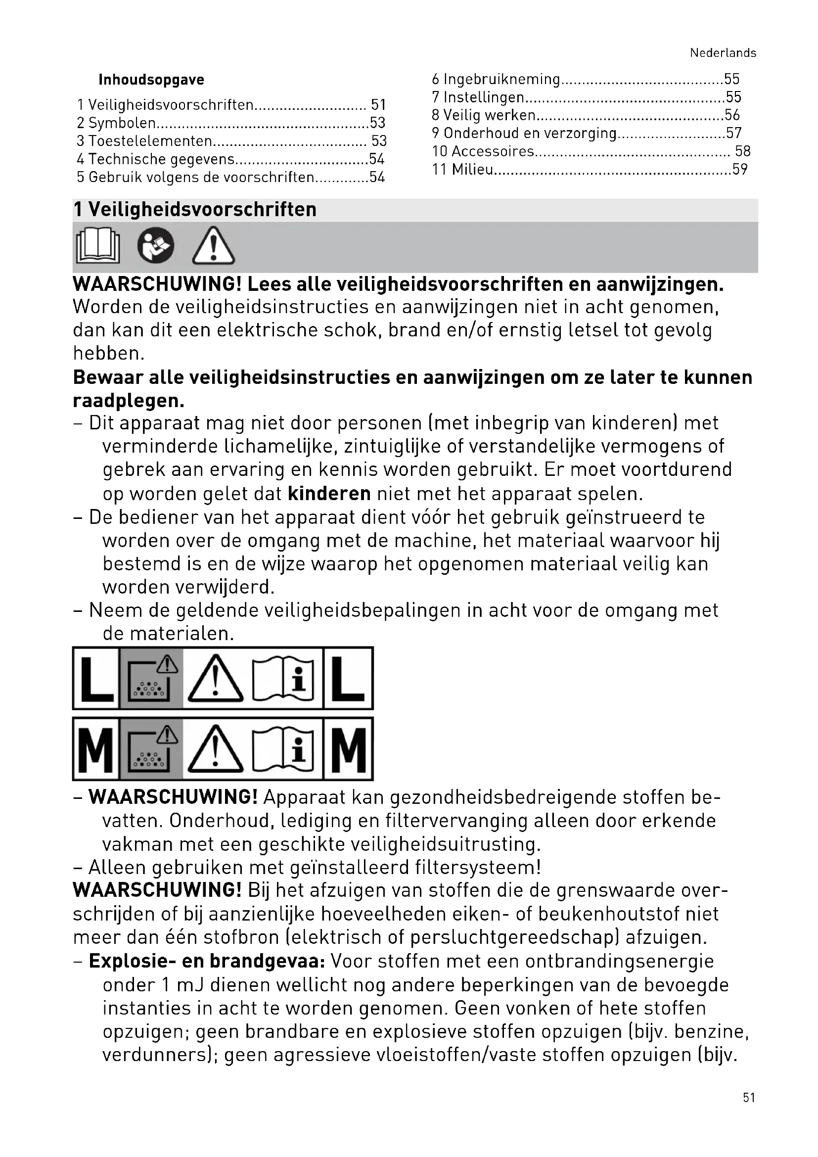 • 11 Milieu 1 Veiligheidsvoorschriften WAARSCHUWING! Lees alle veiligheidsvoorschriften en aanwijzingen. Worden de veiligheidsinstructies en aanwijzingen niet in acht genomen, dan kan dit een elektrische schok, brand en/of ernstig letsel tot gevolg hebben. Bewaar alle veiligheidsinstructies en aanwijzingen om ze later te kunnen raadplegen. – Dit apparaat mag niet door personen (met inbegrip van kinderen) met verminderde lichamelijke, zintuiglijke of verstandelijke vermogens of gebrek aan ervaring en kennis worden gebruikt. Er moet voortdurend op worden gelet dat kinderen niet met het apparaat spelen. – De bediener van het apparaat dient vóór het gebruik geïnstrueerd te worden over de omgang met de machine, het materiaal waarvoor hij bestemd is en de wijze waarop het opgenomen materiaal veilig kan worden verwijderd. – Neem de geldende veiligheidsbepalingen in acht voor de omgang met de materialen. – WAARSCHUWING! Apparaat kan gezondheidsbedreigende stoffen be vatten. Onderhoud, lediging en filtervervanging alleen door erkende vakman met een geschikte veiligheidsuitrusting. – Alleen gebruiken met geïnstalleerd filtersysteem! WAARSCHUWING! Bij het afzuigen van stoffen die de grenswaarde over schrijden of bij aanzienlijke hoeveelheden eiken- of beukenhoutstof niet meer dan één stofbron (elektrisch of persluchtgereedschap) afzuigen. – Explosie- en brandgevaa: Voor stoffen met een ontbrandingsenergie onder 1mJ dienen wellicht nog andere beperkingen van de bevoegde instanties in acht te worden genomen. Geen vonken of hete stoffen opzuigen; geen brandbare en explosieve stoffen opzuigen (bijv. benzine, verdunners); geen agressieve vloeistoffen/vaste stoffen opzuigen (bijv. Nederlands 51zuren, logen, oplosmiddelen). Deze mobiele stofafzuiging is geschikt voor het zuigen van lakstof. – De aansluitkabel niet beschadigen (bijv. door eroverheen te rijden, er aan te rukken, ). De kabel tegen hitte, olie en scherpe randen be schermen. De stekker niet aan het snoer uit het stopcontact trekken. – Controleer regelmatig de stekker en de kabel en laat deze bij beschadi ging door een geautoriseerde klantenservicewerkplaats vervangen. De aansluitkabel alleen vervangen door een type dat in de onderdelenlijst is aangegeven. – Het apparaat niet blootstellen aan regen. – Het apparaat uit veiligheidsoverwegingen alleen gebruiken met een ge aard stopcontact. – De contactdoos op het apparaat alleen gebruiken voor het in de handlei ding vermelde doel. – Alleen originele Festool-accessoires gebruiken. – Wanneer de mobiele stofzuiger niet wordt gebruikt en vóór onder houds- en reinigingswerkzaamheden de stekker uit het modulestop contact trekken. p. 59