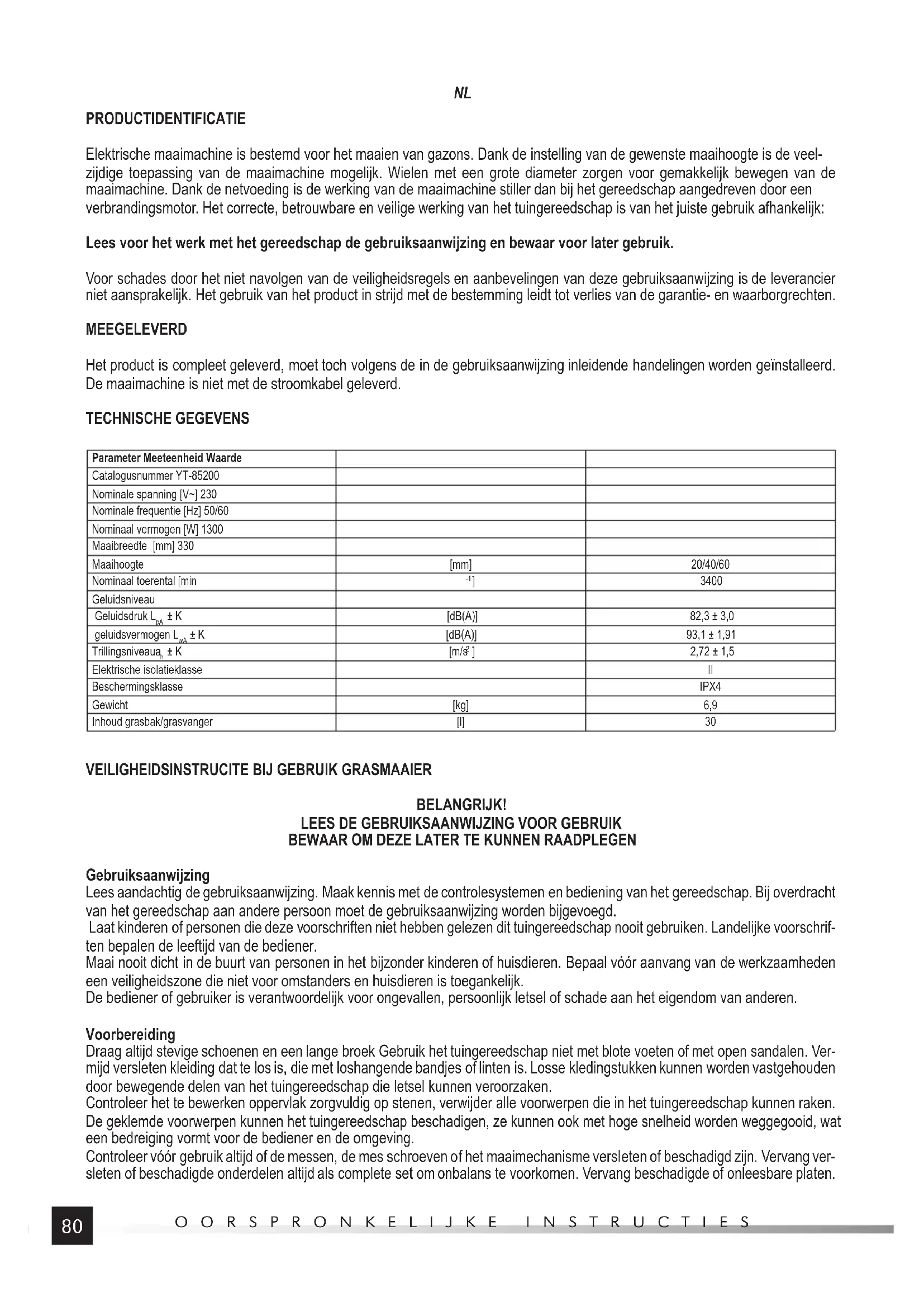OORSPRONKELIJKE INSTRUCTIES PRODUCTIDENTIFICATIE Elektrische maaimachine is bestemd voor het maaien van gazons. Dank de instelling van de gewenste maaihoogte is de veel- zijdige toepassing van de maaimachine mogelijk. Wielen met een grote diameter zorgen voor gemakkelijk bewegen van de maaimachine. Dank de netvoeding is de werking van de maaimachine stiller dan bij het gereedschap aangedreven door een verbrandingsmotor. Het correcte, betrouwbare en veilige werking van het tuingereedschap is van het juiste gebruik afhankelijk: Lees voor het werk met het gereedschap de gebruiksaanwijzing en bewaar voor later gebruik. Voor schades door het niet navolgen van de veiligheidsregels en aanbevelingen van deze gebruiksaanwijzing is de leverancier niet aansprakelijk. Het gebruik van het product in strijd met de bestemming leidt tot verlies van de garantie- en waarborgrechten. MEEGELEVERD Het product is compleet geleverd, moet toch volgens de in de gebruiksaanwijzing inleidende handelingen worden geïnstalleerd. De maaimachine is niet met de stroomkabel geleverd. TECHNISCHE GEGEVENS Parameter Meeteenheid Waarde Catalogusnummer YT-85200 Nominale spanning [V~] 230 Nominale frequentie [Hz] 50/60 Nominaal vermogen [W] 1300 Maaibreedte [mm] 330 Maaihoogte [mm] 20/40/60 Nominaal toerental [min