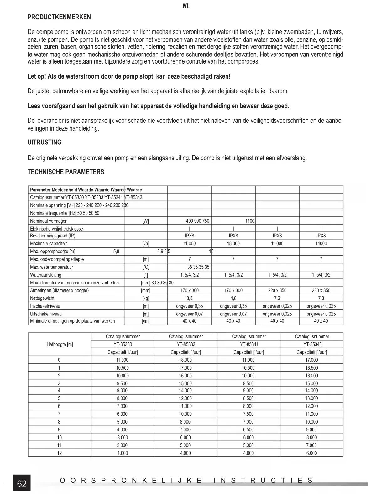 OORSPRONKELIJKE INSTRUCTIES PRODUCTKENMERKEN De dompelpomp is ontworpen om schoon en licht mechanisch verontreinigd water uit tanks (bijv. kleine zwembaden, tuinvijvers, enz.) te pompen. De pomp is niet geschikt voor het verpompen van andere vloeistoff en dan water, zoals olie, benzine, oplosmid- delen, zuren, basen, organische stoff en, vetten, riolering, fecaliën en met dergelijke stoff en verontreinigd water. Het overgepomp- te water mag ook geen mechanische onzuiverheden of andere schurende deeltjes bevatten. Het verpompen van verontreinigd water is alleen toegestaan met bijzondere zorg en voortdurende controle van het pompproces. Let op! Als de waterstroom door de pomp stopt, kan deze beschadigd raken! De juiste, betrouwbare en veilige werking van het apparaat is afhankelijk van de juiste exploitatie, daarom: Lees voorafgaand aan het gebruik van het apparaat de volledige handleiding en bewaar deze goed. De leverancier is niet aansprakelijk voor schade die voortvloeit uit het niet naleven van de veiligheidsvoorschriften en de aanbe- velingen in deze handleiding. UITRUSTING De originele verpakking omvat een pomp en een slangaansluiting. De pomp is niet uitgerust met een afvoerslang. TECHNISCHE PARAMETERS Parameter Meeteenheid Waarde Waarde Waarde Waarde Catalogusnummer YT-85330 YT-85333 YT-85341 YT-85343 Nominale spanning [V~] 220 - 240 220 - 240 230 230 Nominale frequentie [Hz] 50 50 50 50 Nominaal vermogen [W] 400 900 750 1100 Elektrische veiligheidsklasse I I I I Beschermingsgraad (IP) IPX8 IPX8 IPX8 IPX8 Maximale capaciteit [l/h] 11.000 18.000 11.000 14000 Max. oppomphoogte [m] 5,8 8,9 8,5 10 Max. onderdompelingsdiepte [m] 7 7 7 7 Max. watertemperatuur [