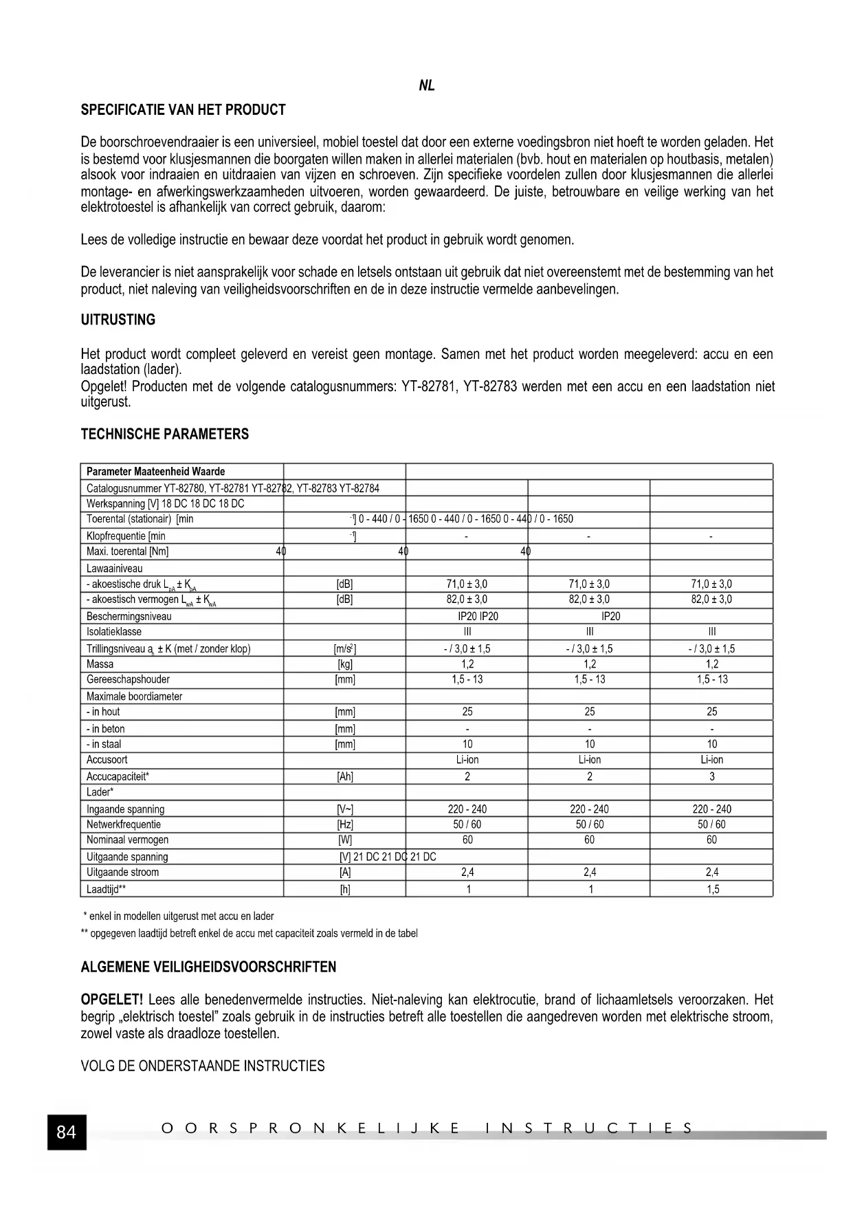 De boorschroevendraaier is een universieel, mobiel toestel dat door een externe voedingsbron niet hoeft te worden geladen. Het is bestemd voor klusjesmannen die boorgaten willen maken in allerlei materialen (bvb. hout en materialen op houtbasis, metalen) alsook voor indraaien en uitdraaien van vijzen en schroeven. Zijn specifieke voordelen zullen door klusjesmannen die allerlei montage- en afwerkingswerkzaamheden uitvoeren, worden gewaardeerd. De juiste, betrouwbare en veilige werking van het elektrotoestel is afhankelijk van correct gebruik, daarom: Lees de volledige instructie en bewaar deze voordat het product in gebruik wordt genomen. De leverancier is niet aansprakelijk voor schade en letsels ontstaan uit gebruik dat niet overeenstemt met de bestemming van het product, niet naleving van veiligheidsvoorschriften en de in deze instructie vermelde aanbevelingen. UITRUSTING Het product wordt compleet geleverd en vereist geen montage. Samen met het product worden meegeleverd: accu en een laadstation (lader). Opgelet! Producten met de volgende catalogusnummers: YT-82781, YT-82783 werden met een accu en een laadstation niet uitgerust. TECHNISCHE PARAMETERS Parameter Maateenheid Waarde Catalogusnummer YT-82780, YT-82781 YT-82782, YT-82783 YT-82784 Werkspanning [V] 18 DC 18 DC 18 DC Toerental (stationair) [min