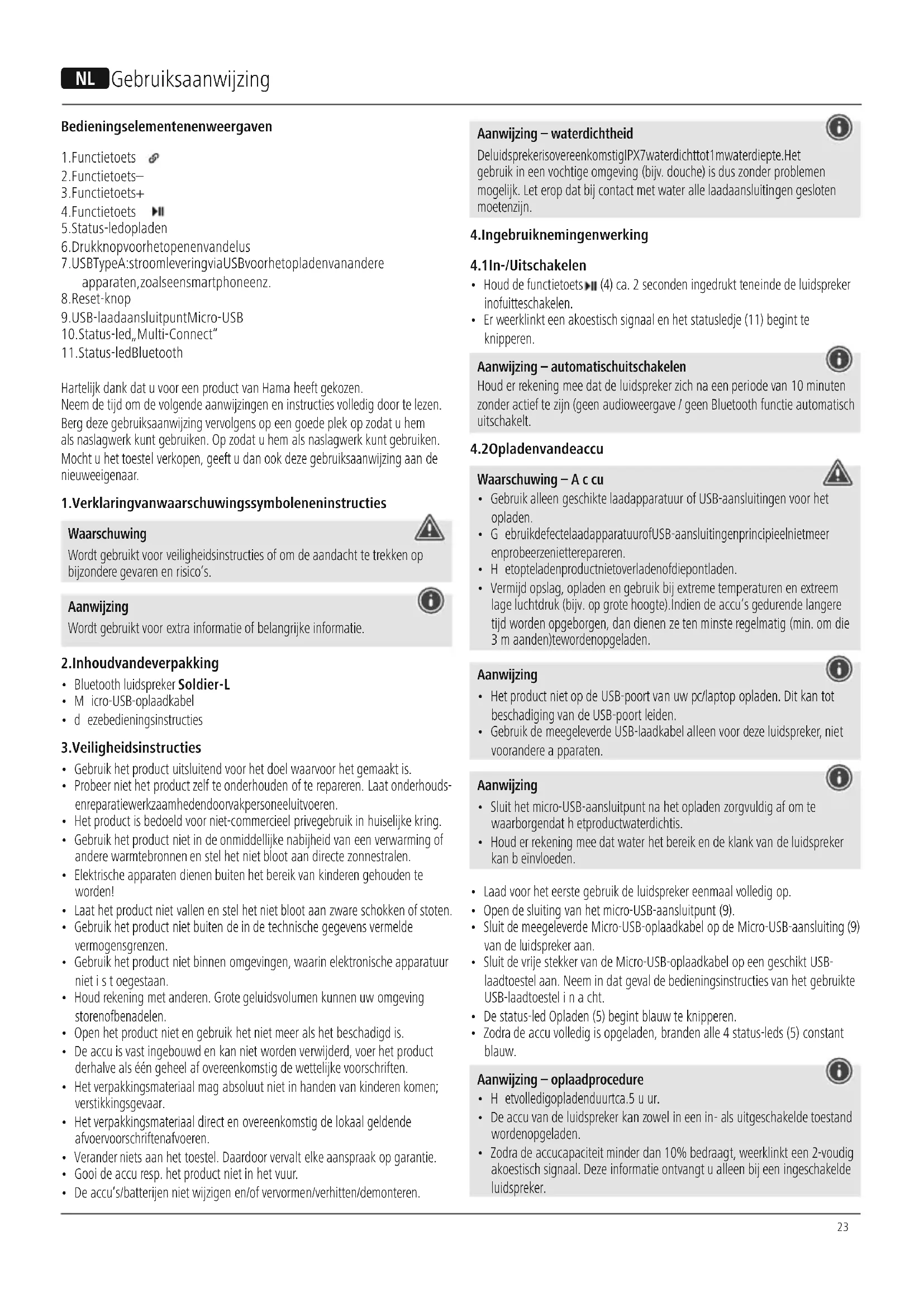 - Deaccu‘s/batterijen niet wijzigen en/of vervormen/verhitten/demonteren. Aanwijzing–waterdichtheid De luidspreker is overeenkomstig IPX7 waterdicht tot 1mwaterdiepte. Het gebruikineen vochtige omgeving (bijv.douche) is duszonder problemen mogelijk. Let erop dat bijcontactmet water alle laadaansluitingen gesloten moeten zijn.