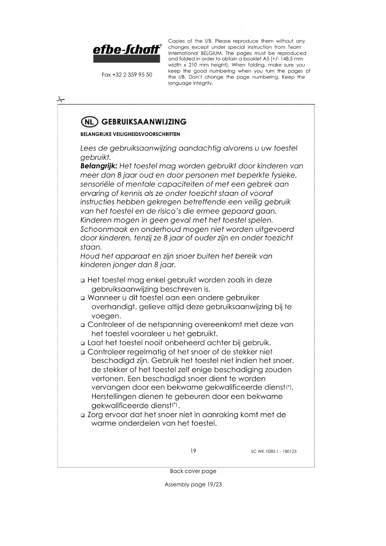 Om ons milieu en onze gezondheid te beschermen, moet afgedankte elektrische en elektronische apparatuur in overeenstemming met welbepaalde regels weggegooid worden. Dit vergt zowel de inzet van de leveranciers als van de gebruikers. Om deze reden mag uw apparaat, zoals op het typeplaatje of op de verpakking aangegeven door het symbool , niet met het gewone huisvuil weggegooid worden. De gebruiker heeft het recht het toestel gratis naar een gemeentelijk centrum van gescheiden inzameling te brengen waar het Copies of the I/B. Please reproduce them without any changes except under special instruction from Team International BELGIUM. The pages must be reproduced and folded in order to obtain a booklet A5 (+/- 148.5 mm width x 210 mm height). When folding, make sure you keep the good numbering when you turn the pages of the I/B. Don’t change the page numbering. Keep the language integrity. 23 SC WK 1080.1 - 180123