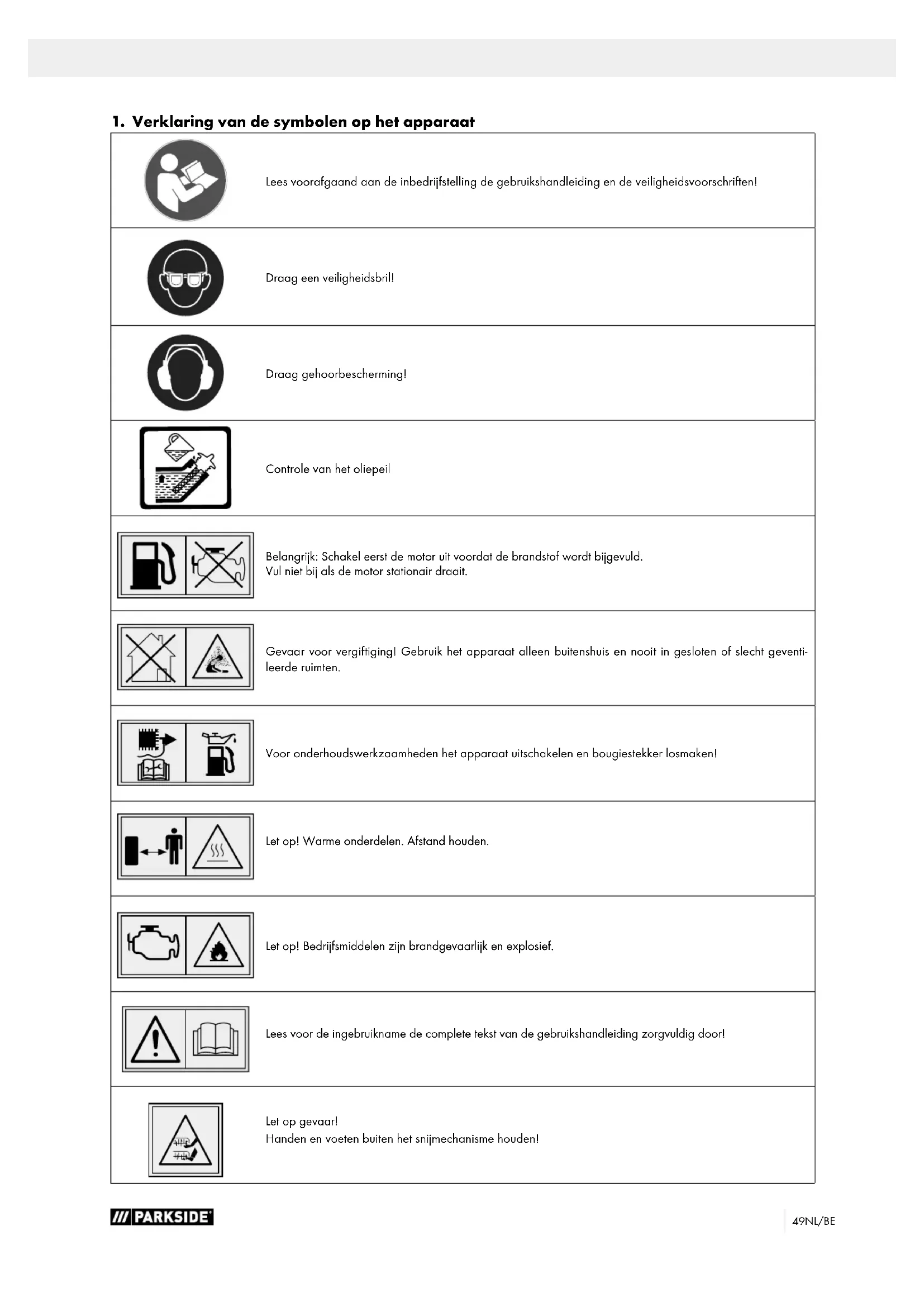 Lees voorafgaand aan de inbedrijfstelling de gebruikshandleiding en de veiligheidsvoorschriften! Draag een veiligheidsbril! Draag gehoorbescherming! Controle van het oliepeil Belangrijk: Schakel eerst de motor uit voordat de brandstof wordt bijgevuld. Vul niet bij als de motor stationair draait. Gevaar voor vergiftiging! Gebruik het apparaat alleen buitenshuis en nooit in gesloten of slecht geventi- leerde ruimten. Voor onderhoudswerkzaamheden het apparaat uitschakelen en bougiestekker losmaken! Let op! Warme onderdelen. Afstand houden. Let op! Bedrijfsmiddelen zijn brandgevaarlijk en explosief. Lees voor de ingebruikname de complete tekst van de gebruikshandleiding zorgvuldig door! Let op gevaar! Handen en voeten buiten het snijmechanisme houden!50 NL/BE Let op! Gevaar voor verwonding door weggeslingerde voorwerpen! Gegarandeerd geluidsvermogensniveau van het apparaat Het product voldoet aan de geldende EU-bepalingen. STOP MOTOR Het apparaat stopt bij het loslaten van de beugel voor de veiligheidsschakelaar. In deze gebruiksaanwijzing hebben wij plaatsen, die van toepassing zijn op uw veiligheid, van dit teken voorzien. Volume van de vangkorf Gewicht in kg Werkbreedte Tankinhoud Motorolie GEVAAR! Signaalwoord voor aanduiding van een direct aanwezige, gevaarlijke situatie die, indien deze niet wordt vermeden, de dood of ernstige verwondingen tot gevolgd heeft.51NL/BE WAARSCHU- WING! Signaalwoord voor aanduiding van een mogelijke gevaarlijke situatie die, indien deze niet wordt verme- den, tot de dood of ernstige verwondingen kan leiden. VOORZICHTIG! Signaalwoord voor aanduiding van een mogelijke gevaarlijke situatie die, indien deze niet wordt verme- den, tot geringe of matige verwondingen kan leiden. AANWIJZING Signaalwoord voor aanduiding van een mogelijke gevaarlijke situatie die, indien deze niet wordt verme- den, materiële schade aan producten of eigendommen tot gevolg kan hebben.52 NL/BE