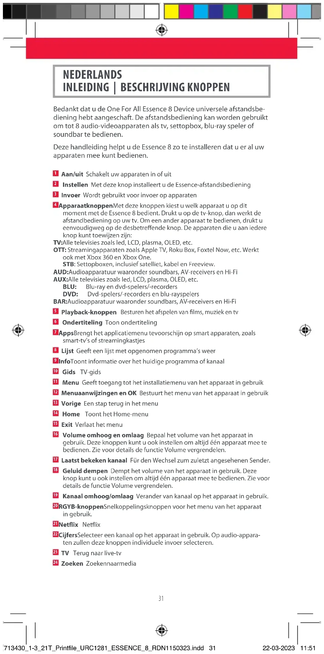 - Als een of meer knoppen niet werken zoals u verwacht, begint u opnieuw bij stap 2. De afstandsbediening start met de volgende code in het geheugen. INSTELLEN SIMPLESET 713430_1-3_21T_Printfile_URC1281_ESSENCE_8_RDN1150323.indd 32713430_1-3_21T_Printfile_URC1281_ESSENCE_8_RDN1150323.indd 32 22-03-2023 11:5122-03-2023 11:5133 INSTELLEN