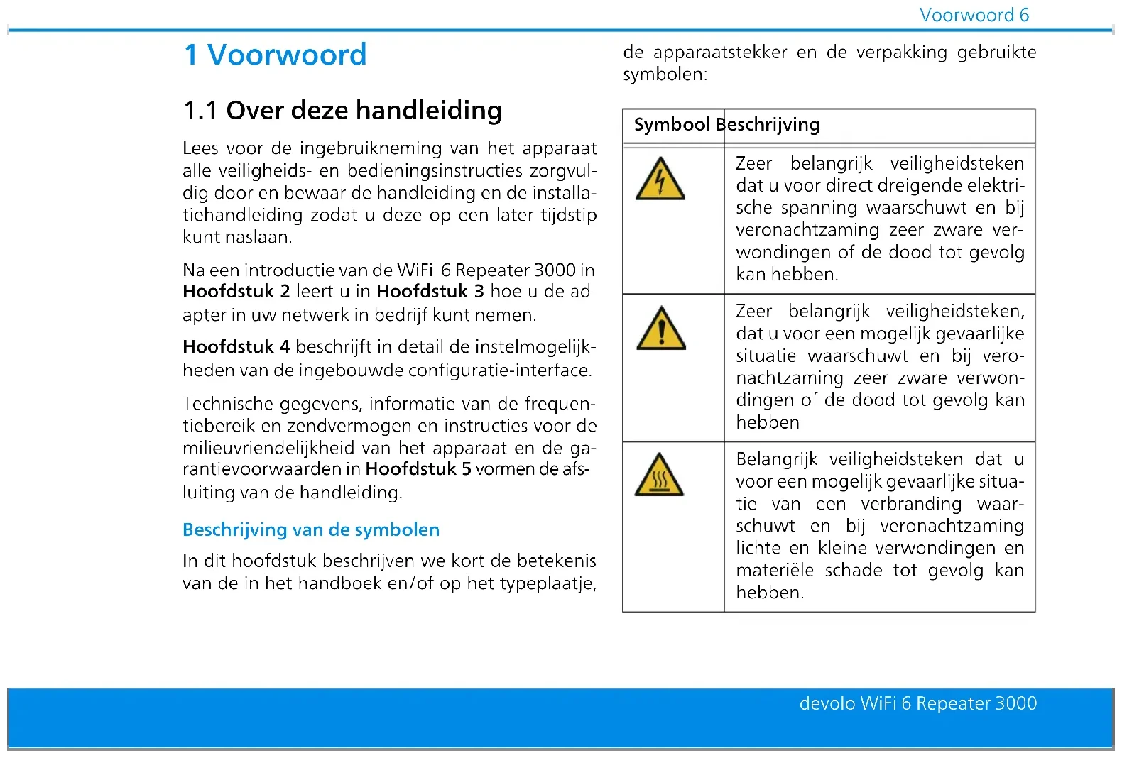 Lees voor de ingebruikneming van het apparaat alle veiligheids- en bedieningsinstructies zorgvul- dig door en bewaar de handleiding en de installa- tiehandleiding zodat u deze op een later tijdstip kunt naslaan. Na een introductie van de WiFi 6 Repeater 3000 in Hoofdstuk 2 leert u in Hoofdstuk 3 hoe u de ad- apter in uw netwerk in bedrijf kunt nemen. Hoofdstuk 4 beschrijft in detail de instelmogelijk- heden van de ingebouwde configuratie-interface. Technische gegevens, informatie van de frequen- tiebereik en zendvermogen en instructies voor de milieuvriendelijkheid van het apparaat en de ga- rantievoorwaarden in Hoofdstuk 5 vormen de afs- luiting van de handleiding. Beschrijving van de symbolen In dit hoofdstuk beschrijven we kort de betekenis van de in het handboek en/of op het typeplaatje, de apparaatstekker en de verpakking gebruikte symbolen: Symbool Beschrijving Zeer belangrijk veiligheidsteken dat u voor direct dreigende elektri- sche spanning waarschuwt en bij veronachtzaming zeer zware ver- wondingen of de dood tot gevolg kan hebben. Zeer belangrijk veiligheidsteken, dat u voor een mogelijk gevaarlijke situatie waarschuwt en bij vero- nachtzaming zeer zware verwon- dingen of de dood tot gevolg kan hebben Belangrijk veiligheidsteken dat u voor een mogelijk gevaarlijke situa- tie van een verbranding waar- schuwt en bij veronachtzaming lichte en kleine verwondingen en materiële schade tot gevolg kan hebben.7 Voorwoord devolo WiFi 6 Repeater 3000 Belangrijk veiligheidsteken dat u voor een mogelijk gevaarlijke situa- tie van struikelblokken waarschuwt en bij veronachtzaming en verwon- dingen schade tot gevolg kan heb- ben. Belangrijke instructie die beter kan worden gevolgd en mogelijk tot materiële schade kan leiden. Het apparaat mag alleen in droge en gesloten ruimten worden ge- bruikt. Alleen van toepassing op appara- ten met WiFi in de 5 GHz-band: WiFi-verbindingen in de 5 GHz- band van 5,15 tot 5,35 GHz zijn uit- sluitend bestemd voor gebruik in gesloten ruimten. Symbool Beschrijving Het apparaat is een product met beschermingsklasse II. Alle elek- trisch geleidende (uit metaal be- staande) behuizingsdelen welke tijdens gebruik en tijdens onder- houd in geval van een fout conditie onder spanning kunnen komen te staan, worden door middel van ver- sterkte isolatie gescheiden van on- der spanning staande elementen. Met de CE-markering verklaart de producent/distributeur dat het product voldoet aan alle geldende Europese voorschriften en dat het de voorgeschreven conformiteits- beoordelingsprocedures heeft on- dergaan. Symbool BeschrijvingVoorwoord 8 devolo WiFi 6 Repeater 3000 Dient voor het voorkomen van af- val van elektrische en elektronische apparaten en het reduceren van dergelijk afval door hergebruik, recycling en andere vormen van ge- bruik. Deze richtlijn legt de minima- le normen vast voor de behandeling van afgedankte elek- trische- en elektronische apparaten in de EU, EVA en VK. Aanvullende tips en achtergronden over de configuratie van uw appa- raat. Kenmerkt het afgesloten verloop van de handeling Symbool Beschrijving9 Voorwoord devolo WiFi 6 Repeater 3000
