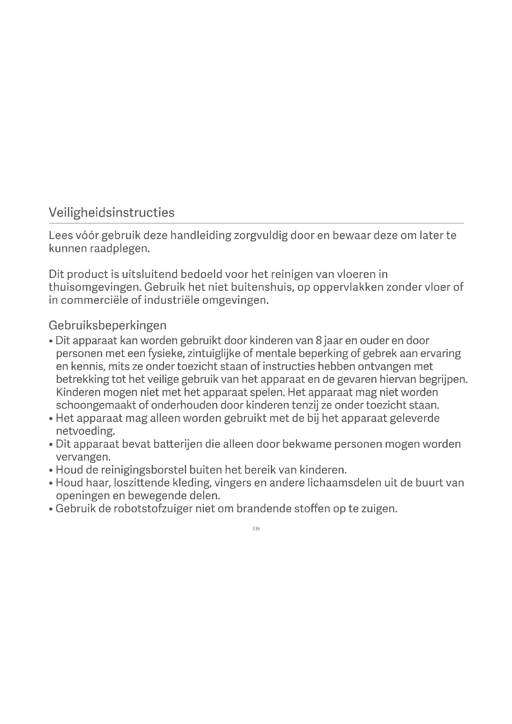 - Gebruik de robotstofzuiger niet om brandende stoffen op te zuigen. Lees vóór gebruik deze handleiding zorgvuldig door en bewaar deze om later te kunnen raadplegen. Dit product is uitsluitend bedoeld voor het reinigen van vloeren in thuisomgevingen. Gebruik het niet buitenshuis, op oppervlakken zonder vloer of in commerciële of industriële omgevingen. 336• Pak de robotstofzuiger niet op aan het deksel van de laserradar.