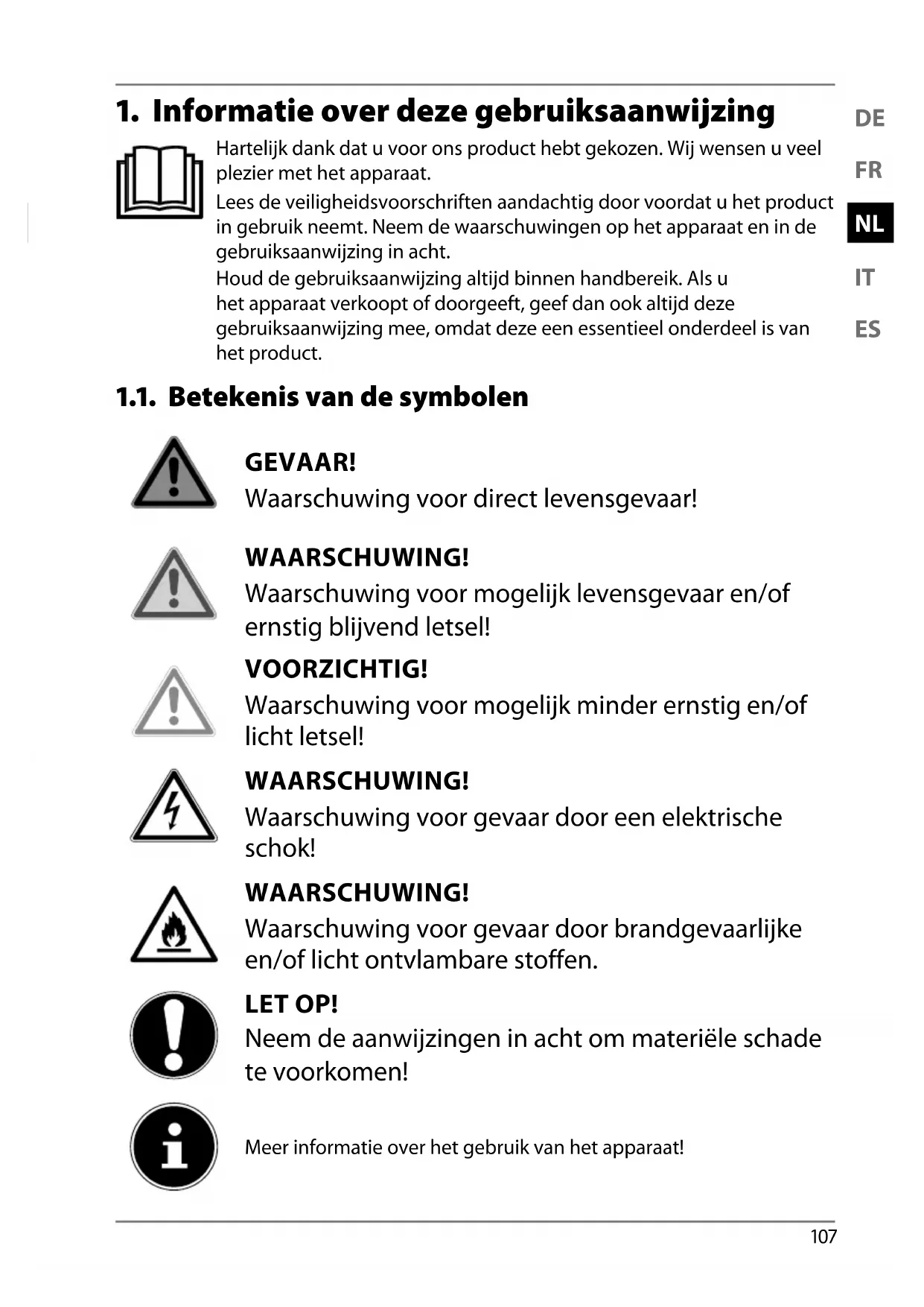 . Informatie over deze gebruiksaanwijzing Hartelijk dank dat u voor ons product hebt gekozen. Wij wensen u veel plezier met het apparaat. Lees de veiligheidsvoorschriften aandachtig door voordat u het product in gebruik neemt. Neem de waarschuwingen op het apparaat en in de gebruiksaanwijzing in acht. Houd de gebruiksaanwijzing altijd binnen handbereik. Als u het apparaat verkoopt of doorgeeft, geef dan ook altijd deze gebruiksaanwijzing mee, omdat deze een essentieel onderdeel is van het product. .. Betekenis van de symbolen GEVAAR! Waarschuwing voor direct levensgevaar! WAARSCHUWING! Waarschuwing voor mogelijk levensgevaar en/of ernstig blijvend letsel! VOORZICHTIG! Waarschuwing voor mogelijk minder ernstig en/of licht letsel! WAARSCHUWING! Waarschuwing voor gevaar door een elektrische schok! WAARSCHUWING! Waarschuwing voor gevaar door brandgevaarlijke en/of licht ontvlambare stoffen. LET OP! Neem de aanwijzingen in acht om materiële schade te voorkomen! Meer informatie over het gebruik van het apparaat!108 Neem de aanwijzingen in de gebruiksaanwijzing in acht! Neem de onderhoudsaanwijzingen in acht!
