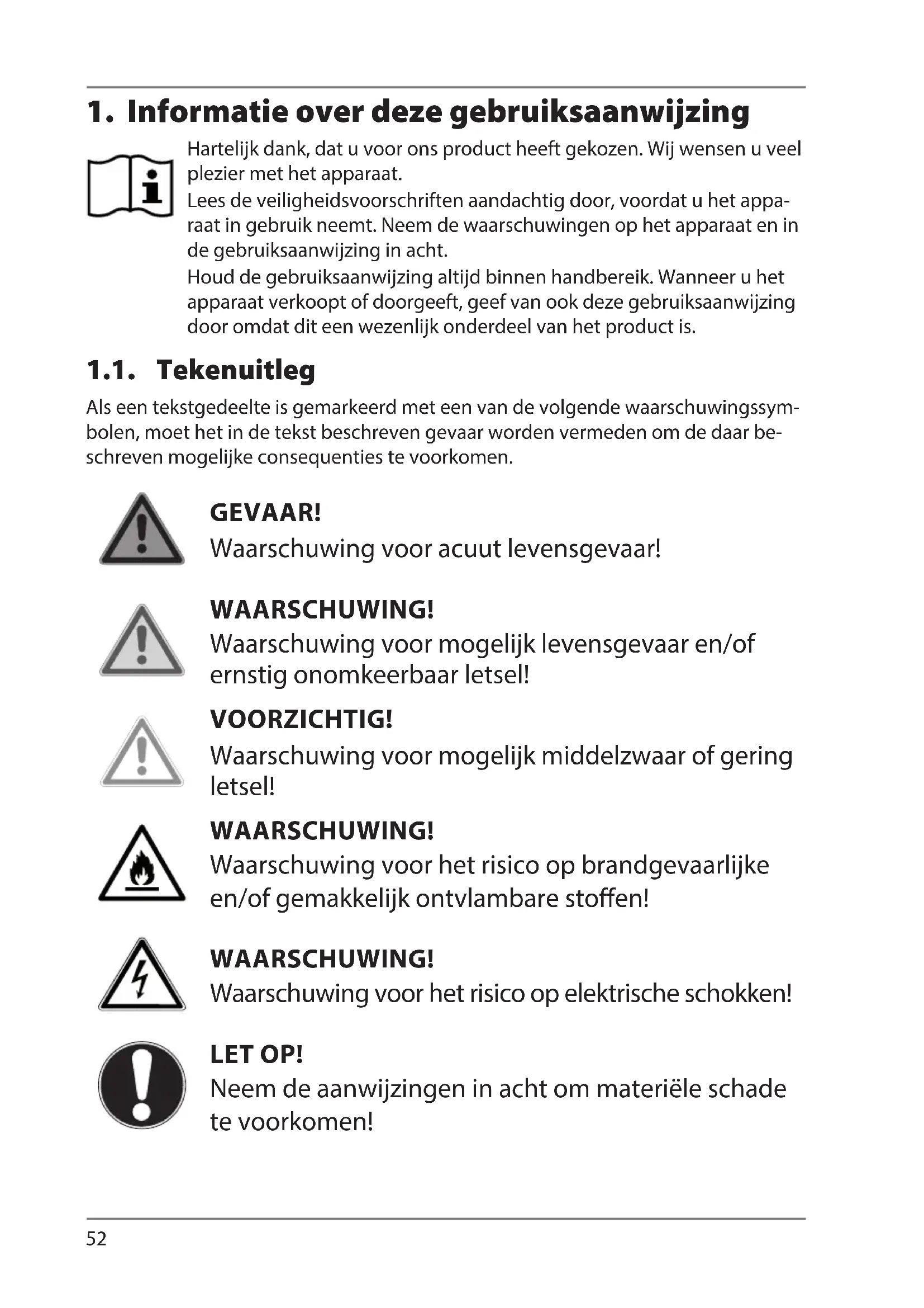 Hartelijk dank, dat u voor ons product heeft gekozen. Wij wensen u veel plezier met het apparaat. Lees de veiligheidsvoorschriften aandachtig door, voordat u het appa- raat in gebruik neemt. Neem de waarschuwingen op het apparaat en in de gebruiksaanwijzing in acht. Houd de gebruiksaanwijzing altijd binnen handbereik. Wanneer u het apparaat verkoopt of doorgeeft, geef van ook deze gebruiksaanwijzing door omdat dit een wezenlijk onderdeel van het product is. 1.1. Tekenuitleg Als een tekstgedeelte is gemarkeerd met een van de volgende waarschuwingssym- bolen, moet het in de tekst beschreven gevaar worden vermeden om de daar be- schreven mogelijke consequenties te voorkomen. GEVAAR! Waarschuwing voor acuut levensgevaar! WAARSCHUWING! Waarschuwing voor mogelijk levensgevaar en/of ernstig onomkeerbaar letsel! VOORZICHTIG! Waarschuwing voor mogelijk middelzwaar of gering letsel! WAARSCHUWING! Waarschuwing voor het risico op brandgevaarlijke en/of gemakkelijk ontvlambare stoffen! WAARSCHUWING! Waarschuwing voor het risico op elektrische schokken! LET OP! Neem de aanwijzingen in acht om materiële schade te voorkomen!53