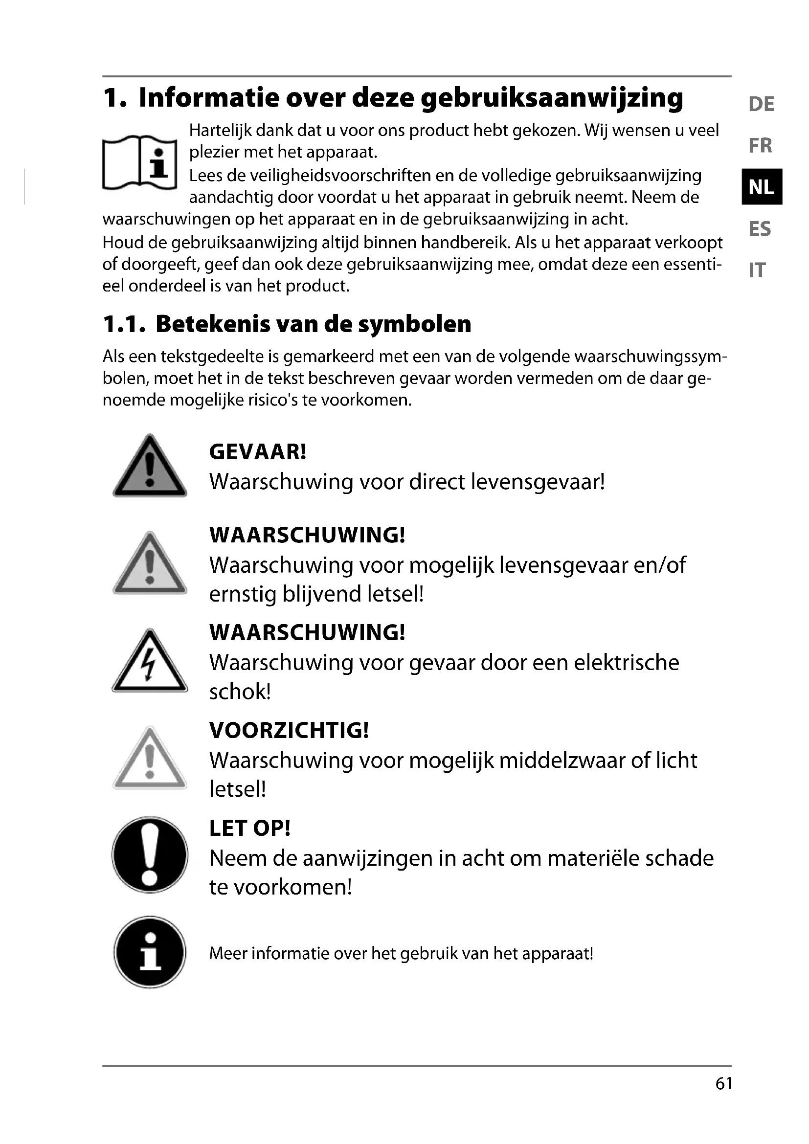Hartelijk dank dat u voor ons product hebt gekozen. Wij wensen u veel plezier met het apparaat. Lees de veiligheidsvoorschriften en de volledige gebruiksaanwijzing aandachtig door voordat u het apparaat in gebruik neemt. Neem de waarschuwingen op het apparaat en in de gebruiksaanwijzing in acht. Houd de gebruiksaanwijzing altijd binnen handbereik. Als u het apparaat verkoopt of doorgeeft, geef dan ook deze gebruiksaanwijzing mee, omdat deze een essenti- eel onderdeel is van het product. 1.1. Betekenis van de symbolen Als een tekstgedeelte is gemarkeerd met een van de volgende waarschuwingssym- bolen, moet het in de tekst beschreven gevaar worden vermeden om de daar ge- noemde mogelijke risico's te voorkomen. GEVAAR! Waarschuwing voor direct levensgevaar! WAARSCHUWING! Waarschuwing voor mogelijk levensgevaar en/of ernstig blijvend letsel! WAARSCHUWING! Waarschuwing voor gevaar door een elektrische schok! VOORZICHTIG! Waarschuwing voor mogelijk middelzwaar of licht letsel! LET OP! Neem de aanwijzingen in acht om materiële schade te voorkomen! Meer informatie over het gebruik van het apparaat!62 CE-markering Producten die zijn gemarkeerd met dit symbool, voldoen aan de ei- sen van de EU-richtlijnen (zie het hoofdstuk ‘Conformiteitsinforma- tie’). Symbool voor wisselstroom Apparaat op een milieuvriendelijke manier afvoeren (zie “12. Afval- verwerking” op blz. 79)