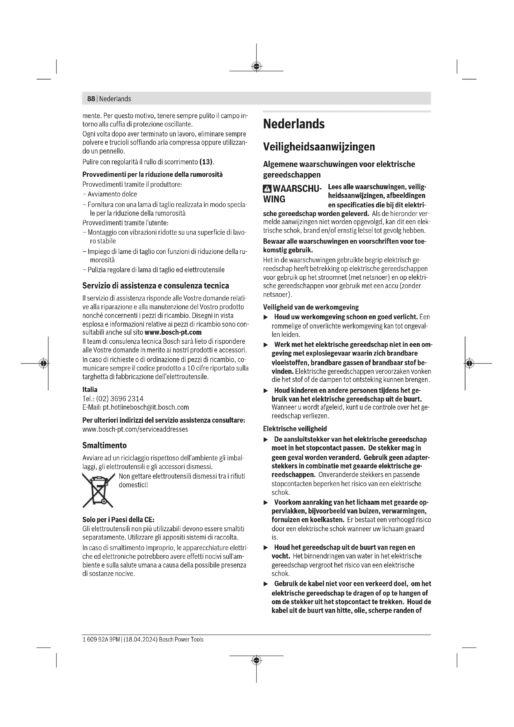 kg 16,8 16,8 Isolatieklasse /II /II Afmetingen voor geschikte zaagbladen Zaagbladdiameter D mm 216 216 Zaagbladdikte mm 1,2−1,8 1,2−1,8 Asgatdiameter d mm 30 25,4 A) Gewicht zonder netsnoer en zonder netstekker De gegevens gelden voor een nominale spanning [U] van 220V. Bij afwijkende spanningen en in landspecifieke uitvoeringen kunnen deze gege- vens variëren. Toegestane werkstukafmetingen (maximaal/minimaal): (zie „Toegestane werkstukafmetingen“, Pagina98) Waarden kunnen afhankelijk van product variëren en onderhevig zijn aan toepassings- en omgevingsvoorwaarden. Meer informatie vindt u op www.bosch-professional.com/wac. Informatie over geluid Geluidsemissiewaarden bepaald conform ENIEC62841-3-9. Het A-gewogen geluidsniveau van het elektrische gereed- schap bedraagt typisch: geluidsdrukniveau95dB(A); geluidsvermogenniveau109dB(A). Onzekerheid K=3dB. Draag gehoorbescherming! De in deze gebruiksaanwijzing vermelde geluidsemissie- waarde is gemeten met een volgens ENgenormeerde meet- methode en kan worden gebruikt om elektrische gereed- schappen met elkaar te vergelijken. Het is ook geschikt voor een voorlopige inschatting van de geluidsemissie. De aangegeven geluidsemissiewaarde representeert de voornaamste toepassingen van het elektrische gereedschap. Als het elektrische gereedschap echter wordt gebruikt voor andere toepassingen, met afwijkende inzetgereedschappen of onvoldoende onderhoud, dan kan de geluidsemissiewaar- de afwijken. Dit kan de geluidsemissie gedurende de gehele arbeidsperiode duidelijk verhogen. Voor een nauwkeurige schatting van de geluidsemissies moet ook rekening worden gehouden met de tijd waarin het gereedschap uitgeschakeld is, of waarin het gereedschap wel loopt, maar niet werkelijk wordt gebruikt. Dit kan de ge- luidsemissies gedurende de gehele arbeidsperiode duidelijk verminderen. Montage u Voorkom per ongeluk starten van het elektrische ge- reedschap. Tijdens de montage en bij alle werkzaam- heden aan het elektrische gereedschap mag de stek- ker niet zijn aangesloten op de stroomvoorziening. Meegeleverd Neem hiervoor goed nota van de afbeelding van de leveromvang aan het begin van de gebruiks- aanwijzing. Controleer vóór de eerste ingebruikname van het elektrische gereedschap of alle hierna vermelde onderdelen zijn meege- leverd: – Afkortzaagmachine met gemonteerd zaagblad – Klemwiel (45) – Verstelbare aanslagrail (28) Bosch Power Tools 1 609 92A 9PM | (18.04.2024)94 | Nederlands – Lijmklem (41) – Binnenzeskantsleutel/platte schroevendraaier (43) – Stofzak (37) – Werkstuksteunen (26) (2 stuks) Aanwijzing: Controleer het elektrische gereedschap op eventuele schade. Voordat u het elektrische gereedschap verder gebruikt, dient u veiligheidsvoorzieningen en licht beschadigde onder- delen zorgvuldig te controleren op hun juiste werking vol- gens de voorschriften. Controleer of de bewegende onder- delen goed werken en niet vastklemmen en of er onderdelen beschadigd zijn. Alle onderdelen moeten juist gemonteerd zijn en aan alle voorwaarden voldoen om een correcte wer- king te waarborgen. Laat beschadigde veiligheidsvoorzieningen en onderdelen door een erkend en gespecialiseerd bedrijf op deskundige wijze repareren of vervangen. Montage van onderdelen – Neem alle meegeleverde onderdelen voorzichtig uit de verpakking. – Verwijder al het verpakkingsmateriaal van het elektrische gereedschap en de meegeleverde accessoires. – Let erop dat het elektrische gereedschap zich in de trans- portstand bevindt, om de werkzaamheden bij de montage van de meegeleverde machine-elementen gemakkelijker te maken. Werkstuksteunen monteren (zie afbeeldingA1) De werkstuksteunen(26) kunnen links, rechts of voor op het elektrische gereedschap worden geplaatst. Het flexibele steeksysteem biedt u een groot aantal verlengings- en ver- bredingsmogelijkheden (zie afbeeldingG). – Steek desgewenst de werkstuksteun(26) in de opnamen(47) op het elektrische gereedschap of in de opnamen(48) van de tweede werkstuksteun. u Draag het elektrische gereedschap nooit aan de werk- stuksteunen. Gebruik bij het transporteren van het elektrische ge- reedschap alleen de transportvoorzieningen. Klemwiel monteren (zie afbeeldingA2) Het klemwiel(45) fixeert de ingestelde verticale verstek- hoek en is noodzakelijk voor een veilige werking. – Schroef de zeskantmoer van het tapeind(49) af. – Schroef het klemwiel(45) rechtsom op het tapeind(49) en draai het vast. Verstelbare aanslagrail monteren (zie afbeeldingA3) De verstelbare aanslagrail(28) moet vóór het zagen worden gemonteerd. – Schuif de aanslagrail(28) rechts van het zaagblad in de hiervoor bestemde groef en draai de vergrendelschroef(44) vast. Het afgeplatte deel van de aanslagrail moet daarbij naar binnen naar het zaagblad wijzen. Stationaire of flexibele montage u Om een veilig gebruik te waarborgen, dient u het elek- trische gereedschap vóór het gebruik op een vlakke en stabiele ondergrond (bijv. een werkbank) te mon- teren. Montage op een werkoppervlak (zie afbeelding B1−B2) – Bevestig het elektrische gereedschap met een geschikte schroefverbinding op het werkoppervlak. Daartoe dienen de boorgaten (15).