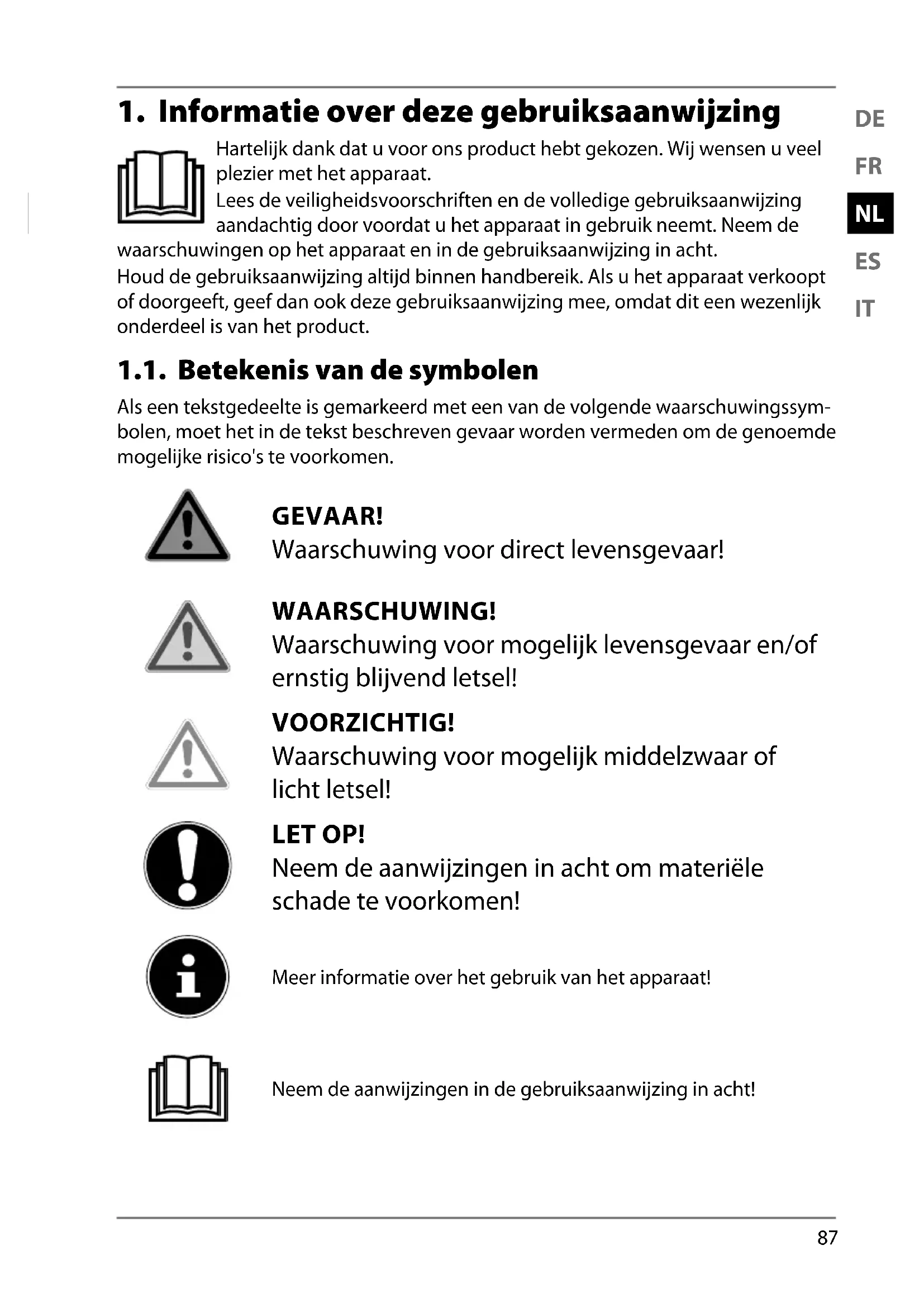 Hartelijk dank dat u voor ons product hebt gekozen. Wij wensen u veel plezier met het apparaat. Lees de veiligheidsvoorschriften en de volledige gebruiksaanwijzing aandachtig door voordat u het apparaat in gebruik neemt. Neem de waarschuwingen op het apparaat en in de gebruiksaanwijzing in acht. Houd de gebruiksaanwijzing altijd binnen handbereik. Als u het apparaat verkoopt of doorgeeft, geef dan ook deze gebruiksaanwijzing mee, omdat dit een wezenlijk onderdeel is van het product. 1.1. Betekenis van de symbolen Als een tekstgedeelte is gemarkeerd met een van de volgende waarschuwingssym- bolen, moet het in de tekst beschreven gevaar worden vermeden om de genoemde mogelijke risico's te voorkomen. GEVAAR! Waarschuwing voor direct levensgevaar! WAARSCHUWING! Waarschuwing voor mogelijk levensgevaar en/of ernstig blijvend letsel! VOORZICHTIG! Waarschuwing voor mogelijk middelzwaar of licht letsel! LET OP! Neem de aanwijzingen in acht om materiële schade te voorkomen! Meer informatie over het gebruik van het apparaat! Neem de aanwijzingen in de gebruiksaanwijzing in acht!88 WAARSCHUWING! Waarschuwing voor gevaar door een elektrische schok! WAARSCHUWING! Waarschuwing voor gevaar door brandgevaarlij- ke en/of licht ontvlambare stoffen! WAARSCHUWING! Waarschuwing voor gevaar door explosiegevaar- lijke stoffen!