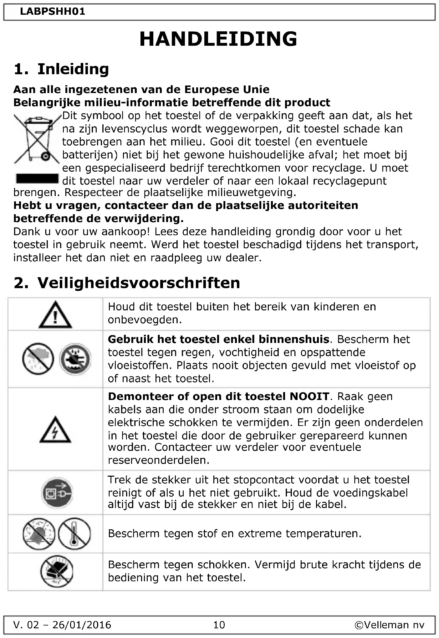 rimpel en ruis (20 Hz - 20 MHz) spanning .............................................. ≤ 10 mV rms/150 mV p-p stroom................................................. ≤ 10 mV rms/150 mV p-p temperatuurcoëfficiënt @ 40 °C (± % uitgang + offset) spanning ..................................................................... ≤ 0.05 % stroom..........................................................................≤ 0.1 % afmetingen ............................................................... 185 x 88 x 38 mm gewicht...................................................................................... 370g voedingskabel ..................... CEE 7/16-eurostekker type C naar C7-stekker kabellengte ............................................................................. 1.20 m Gebruik dit toestel enkel met originele accessoires. Velleman nv is niet aansprakelijk voor schade of kwetsuren bij (verkeerd) gebruik van dit toestel. Voor meer informatie over dit product en de laatste versie van deze handleiding, zie www.velleman.eu. De informatie in deze handleiding kan te allen tijde worden gewijzigd zonder voorafgaande kennisgeving. © AUTEURSRECHT Velleman nv heeft het auteursrecht voor deze handleiding. Alle wereldwijde rechten voorbehouden. Het is niet toegestaan om deze handleiding of gedeelten ervan over te nemen, te kopiëren, te vertalen, te bewerken en op te slaan op een elektronisch medium zonder voorafgaande schriftelijke toestemming van de rechthebbende.LABPSHH01