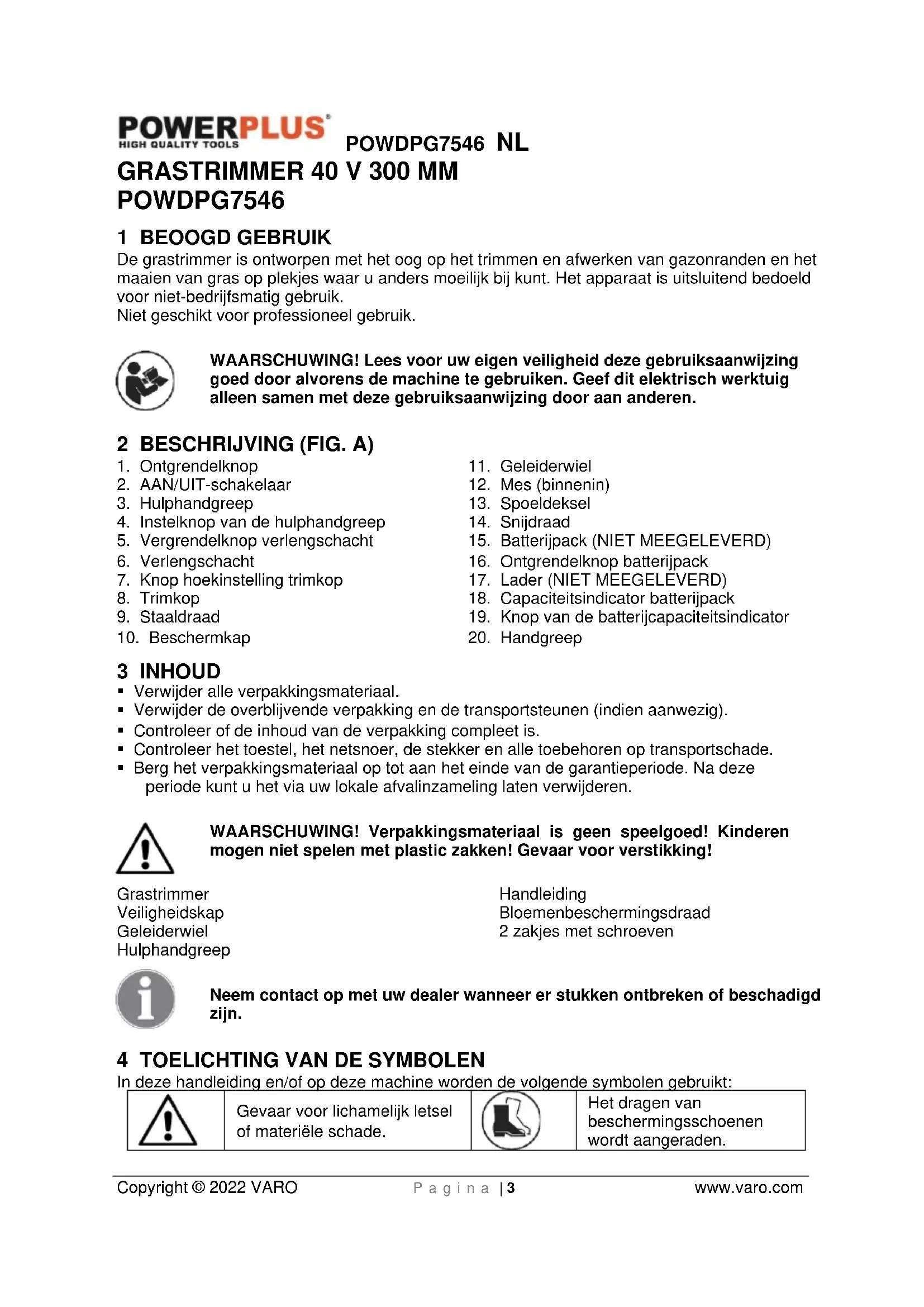 - Uw toestel moet minstens 1x per maand opgeladen worden, opdat de werking van dit toestel optimaal blijft. 16 MILIEU Indien u, na zekere tijd, beslist uw machine te vervangen, werp deze dan niet weg bij uw huishoudelijk afval maar doe dit op een milieuvriendelijke wijze. Afval geproduceerd door elektrische machines mag niet op dezelfde manier behandeld worden als het gewone huishoudelijke afval. Breng het naar een recyclagecentrum op plaatsen waar zulke gepaste installaties bestaan. Raadpleeg de plaatselijke instanties of de verkoper voor adviezen over inzameling en verwerking.POWDPG7546 NL Copyright © 2022 VARO P a g i n a | 13 www.varo.com 17 CONFORMITEITSVERKLARING VARO – Vic. Van Rompuy N.V. - Joseph Van Instraat 9 - BE2500 Lier - BELGIUM, verklaart dat, Product: Grastrimmer 20 V - Batterijgevoed Handelsmerk: PowerPlus Model: POWDPG7546 voldoet aan de essentiële eisen en aan de overige relevante bepalingen van de van toepassing zijnde Europese Richtlijnen, gebaseerd op de toepassing van Europese geharmoniseerde normen. Elke niet-toegelaten modificatie van het apparaat maakt deze verklaring nietig. Europese Richtlijnen (inclusief, indien van toepassing, hun wijzigingen tot op de datum van ondertekening): 2011/65/EU 2006/42/EC 2014/30/EU 2000/14/EC Annex VI LwA Measured 90 dB(A) Guaranteed 92 dB(A) Notified Body TÜV SÜD Europese geharmoniseerde normen (inclusief, indien van toepassing, hun wijzigingen tot op de datum van ondertekening): EN60335-1 : 2012 EN50636-2-91 : 2014 EN55014-1 : 2017 EN55014-2 : 2015 Beheerder van de technische documentatie: Philippe Vankerkhove, VARO – Vic. Van Rompuy N.V. Ondergetekende handelt in opdracht van de bedrijfsleider, Ludo Mertens Regelgevings- en compliancemanager 05/01/2022, Lier - BelgiumPOWDPG7546 FR Copyright © 2022 VARO P a g e | 1 www.varo.com