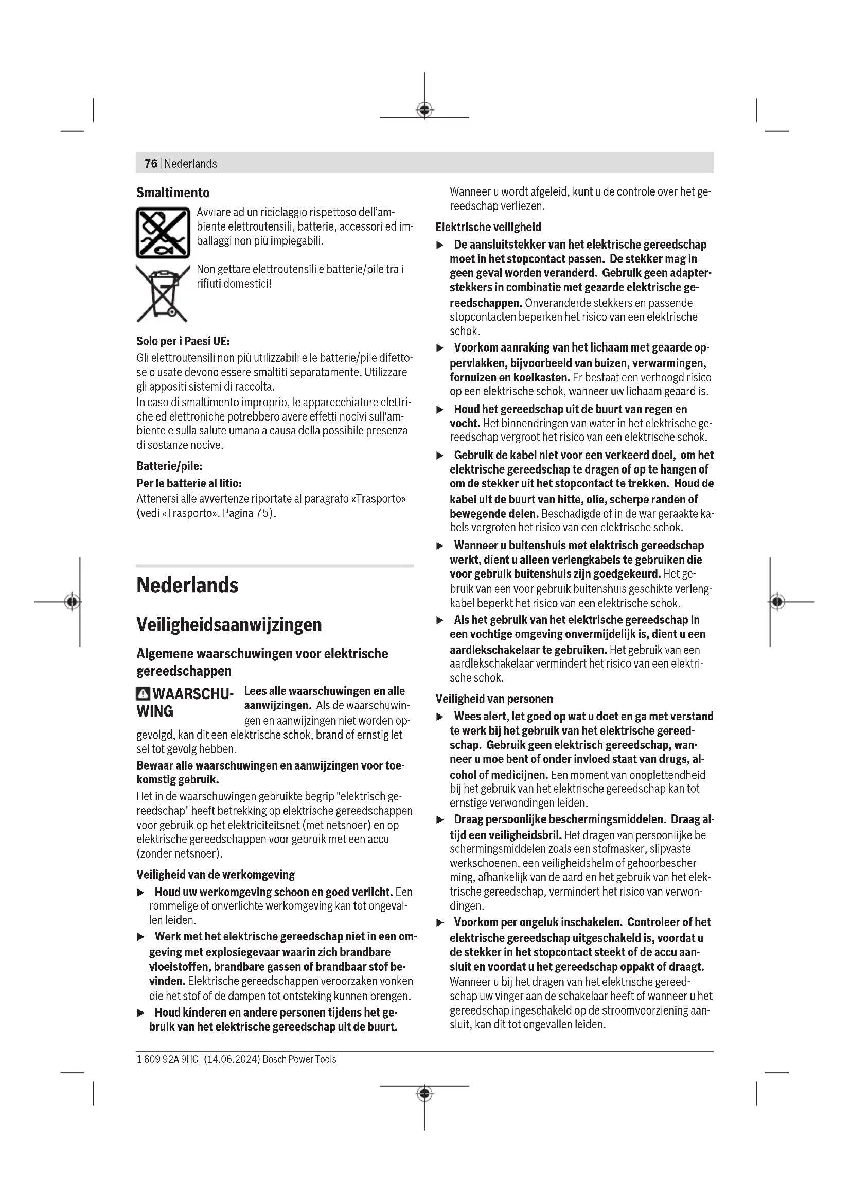 idonea alla rispettiva applicazione. Superficie troppo dura In caso di calcestruzzo con inclusioni dure, tentare di eseguire il fissaggio in un altro punto. Altrimenti, ricorrere a metodi di fissaggio alternativi, ad es. fissaggio con tasselli. Il chiodo non si fissa nell’accia- io. Superficie in acciaio troppo sottile Ricorrere a metodi di fissaggio alternativi, ad es. fissaggio con viti. Il chiodo non fuoriesce dall’elemento di contatto o elemento di contatto in posi- zione premuta. Inceppamento nell’elemento di contatto (dovuto ad es. a corpi estranei o sporcizia) Sbloccare l’inceppamento (vedi «Sblocco degli inceppamenti/ reset», Pagina73). Tasso di errore troppo elevato Superficie troppo dura Ricorrere a metodi di fissaggio alternativi, ad es. fissaggio con tasselli. Punzone usurato Portare l’elettroutensile in riparazione presso un Centro Assi- stenza Clienti per elettroutensili Bosch autorizzato. I chiodi non scivolano nel cari- catore. Caricatore sporco Pulire il caricatore(12), ad es. con un pennello. Servizio di assistenza e consulenza tecnica Il servizio di assistenza risponde alle Vostre domande relati- ve alla riparazione e alla manutenzione del Vostro prodotto nonché concernenti i pezzi di ricambio. Disegni in vista esplosa e informazioni relative ai pezzi di ricambio sono con- sultabili anche sul sito www.bosch-pt.com Il team di consulenza tecnica Bosch sarà lieto di rispondere alle Vostre domande in merito ai nostri prodotti e accessori. In caso di richieste o di ordinazione di pezzi di ricambio, co- municare sempre il codice prodotto a 10cifre riportato sulla targhetta di fabbricazione dell’elettroutensile. Italia Tel.: (02) 3696 2314 E-Mail: pt.hotlinebosch@it.bosch.com Per ulteriori indirizzi del servizio assistenza consultare: www.bosch-pt.com/serviceaddresses Trasporto Le batterie al litio consigliate sono soggette ai requisiti di leg- ge relativi alle merci pericolose. Le batterie possono essere trasportate su strada dall’utilizzatore senza ulteriori precau- zioni. In caso di spedizione tramite terzi (ad es. per via aerea o tra- mite spedizioniere), devono essere rispettati requisiti speci- fici per l’imballaggio e l’etichettatura. In tale caso, per la pre- parazione dell’articolo da spedire si deve consultare uno specialista in merci pericolose. Inviare le batterie soltanto se la relativa carcassa non è dan- neggiata. Coprire con nastro adesivo i contatti scoperti ed imballare la batteria in modo che non possa spostarsi nell’imballaggio. Andranno altresì rispettate eventuali ulte- riori norme nazionali complementari. Bosch Power Tools 1 609 92A 9HC | (14.06.2024)76 | Nederlands Smaltimento Avviare ad un riciclaggio rispettoso dell’am- biente elettroutensili, batterie, accessori ed im- ballaggi non più impiegabili. Non gettare elettroutensili e batterie/pile tra i rifiuti domestici! Solo per i Paesi UE: Gli elettroutensili non più utilizzabili e le batterie/pile difetto- se o usate devono essere smaltiti separatamente. Utilizzare gli appositi sistemi di raccolta. In caso di smaltimento improprio, le apparecchiature elettri- che ed elettroniche potrebbero avere effetti nocivi sull'am- biente e sulla salute umana a causa della possibile presenza di sostanze nocive. Batterie/pile: Per le batterie al litio: Attenersi alle avvertenze riportate al paragrafo «Trasporto» (vedi «Trasporto», Pagina75). Nederlands Veiligheidsaanwijzingen Algemene waarschuwingen voor elektrische gereedschappen WAARSCHU- WING Lees alle waarschuwingen en alle aanwijzingen. Als de waarschuwin- gen en aanwijzingen niet worden op- gevolgd, kan dit een elektrische schok, brand of ernstig let- sel tot gevolg hebben. Bewaar alle waarschuwingen en aanwijzingen voor toe- komstig gebruik. Het in de waarschuwingen gebruikte begrip "elektrisch ge- reedschap" heeft betrekking op elektrische gereedschappen voor gebruik op het elektriciteitsnet (met netsnoer) en op elektrische gereedschappen voor gebruik met een accu (zonder netsnoer). Veiligheid van de werkomgeving u Houd uw werkomgeving schoon en goed verlicht. Een rommelige of onverlichte werkomgeving kan tot ongeval- len leiden. u Werk met het elektrische gereedschap niet in een om- geving met explosiegevaar waarin zich brandbare vloeistoffen, brandbare gassen of brandbaar stof be- vinden. Elektrische gereedschappen veroorzaken vonken die het stof of de dampen tot ontsteking kunnen brengen. u Houd kinderen en andere personen tijdens het ge- bruik van het elektrische gereedschap uit de buurt. Wanneer u wordt afgeleid, kunt u de controle over het ge- reedschap verliezen. Elektrische veiligheid u De aansluitstekker van het elektrische gereedschap moet in het stopcontact passen. De stekker mag in geen geval worden veranderd. Gebruik geen adapter- stekkers in combinatie met geaarde elektrische ge- reedschappen. Onveranderde stekkers en passende stopcontacten beperken het risico van een elektrische schok. u Voorkom aanraking van het lichaam met geaarde op- pervlakken, bijvoorbeeld van buizen, verwarmingen, fornuizen en koelkasten. Er bestaat een verhoogd risico op een elektrische schok, wanneer uw lichaam geaard is. u Houd het gereedschap uit de buurt van regen en vocht. Het binnendringen van water in het elektrische ge- reedschap vergroot het risico van een elektrische schok. u Gebruik de kabel niet voor een verkeerd doel, om het elektrische gereedschap te dragen of op te hangen of om de stekker uit het stopcontact te trekken. Houd de kabel uit de buurt van hitte, olie, scherpe randen of bewegende delen. Beschadigde of in de war geraakte ka- bels vergroten het risico van een elektrische schok. u Wanneer u buitenshuis met elektrisch gereedschap werkt, dient u alleen verlengkabels te gebruiken die voor gebruik buitenshuis zijn goedgekeurd. Het ge- bruik van een voor gebruik buitenshuis geschikte verleng- kabel beperkt het risico van een elektrische schok. u Als het gebruik van het elektrische gereedschap in een vochtige omgevin
