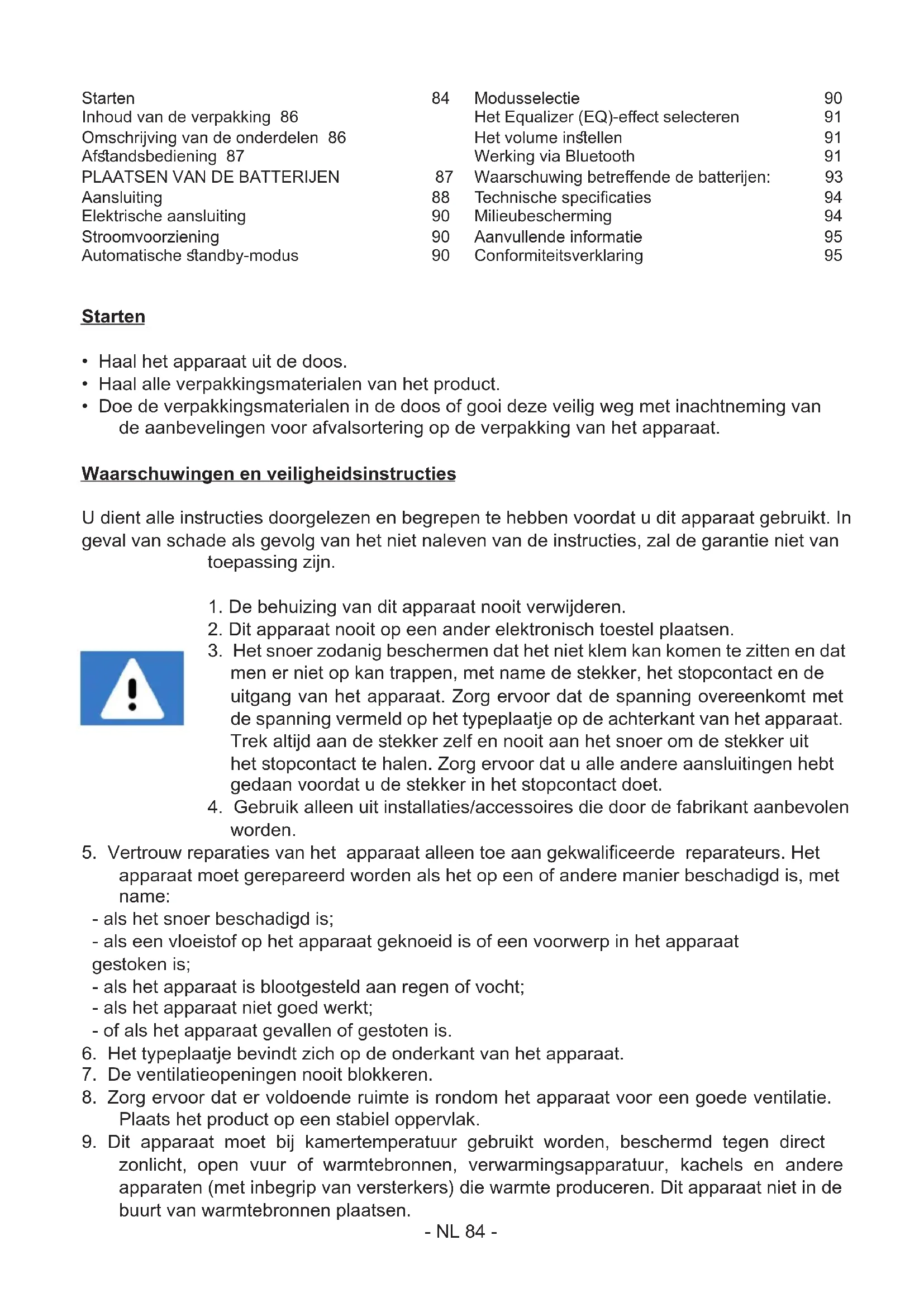 Aansluiting 88 Elektrische aansluiting 90 Stroomvoorziening 90 Automatische andby-modus 90 Modusselectie 90 Het Equalizer (EQ)-eect selecteren 91 Het volume inellen 91 Werking via Bluetooth 91 Waarschuwing betreende de batterijen: 93 Technische specicaties 94 Milieubescherming 94 Aanvullende informatie 95 Conformiteitsverklaring 95- NL 85 -