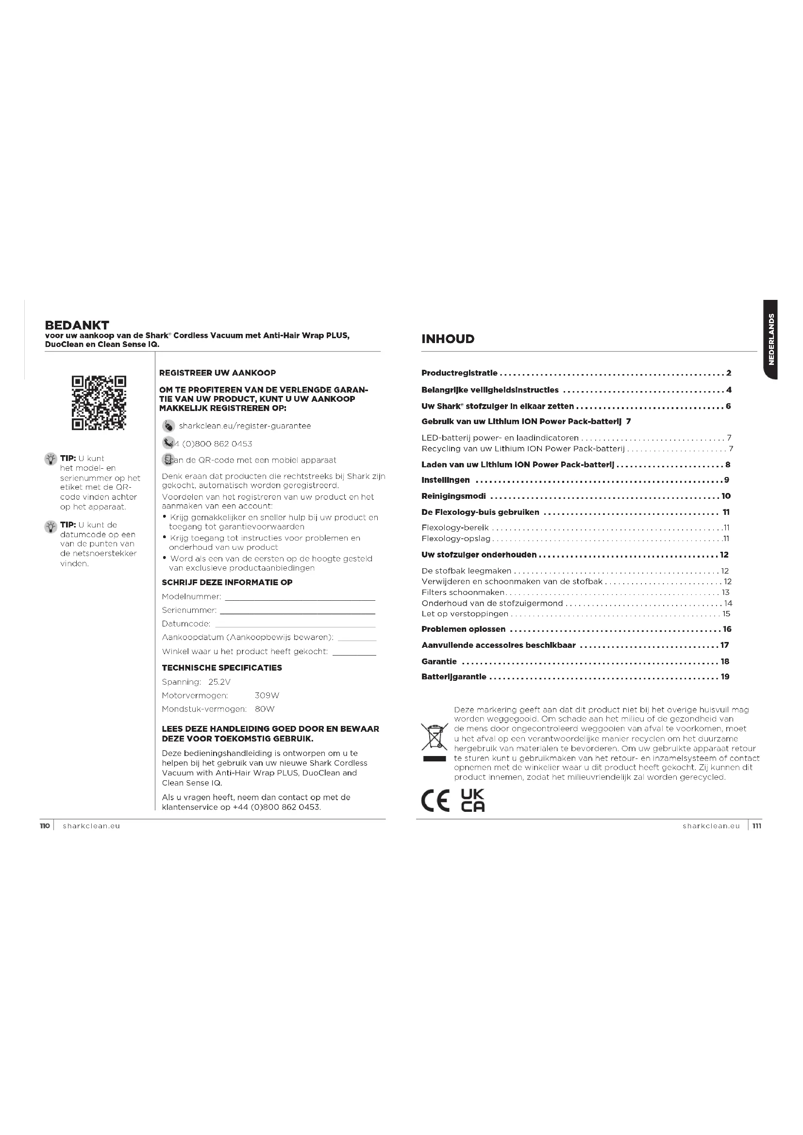 OM TE PROFITEREN VAN DE VERLENGDE GARAN- TIE VAN UW PRODUCT, KUNT U UW AANKOOP MAKKELIJK REGISTREREN OP: sharkclean.eu/register-guarantee +44 (0)800 862 0453 Scan de QR-code met een mobiel apparaat BEDANKT voor uw aankoop van de Shark® Cordless Vacuum met Anti-Hair Wrap PLUS, DuoClean en Clean Sense IQ. LEES DEZE HANDLEIDING GOED DOOR EN BEWAAR DEZE VOOR TOEKOMSTIG GEBRUIK. Deze bedieningshandleiding is ontworpen om u te helpen bij het gebruik van uw nieuwe Shark Cordless Vacuum with Anti-Hair Wrap PLUS, DuoClean and Clean Sense IQ Als u vragen heeft, neem dan contact op met de klantenservice op +44 (0)800 862 0453 Voordelen van het registreren van uw product en het aanmaken van een account: