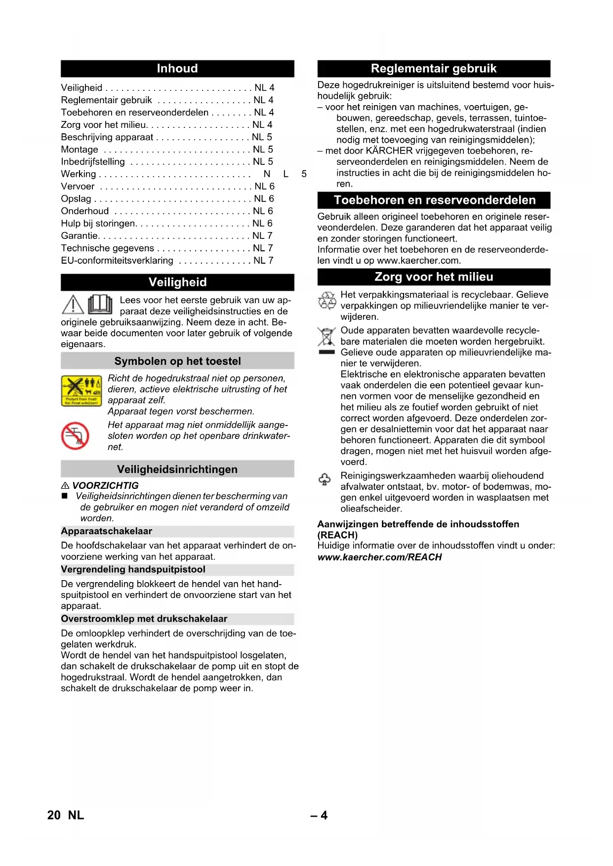 91 dB(A) Dichiarazione di conformità UE Prodotto: Idropulitrice Modello: 1.600-xxx Direttive UE pertinenti 2006/42/CE (+2009/127/CE) 2014/30/UE 2011/65/UE 2000/14/CE Norme armonizzate applicate EN 60335–1 EN 60335–2–79 EN 62233: 2008 EN 55014–1: 2017 EN 55014–2: 2015 EN 61000–3–2: 2014 EN 61000–3–3: 2013 EN IEC 63000: 2018 Procedura di valutazione della conformità applicata 2000/14/CE: Allegato V Livello di potenza sonora dB(A) Misurato: 89 Garantito: 91 Winnenden, 2020/08/01 Chairman of the Board of Management Director Regulatory Affairs & Certification 19IT– 4 Lees voor het eerste gebruik van uw ap- paraat deze veiligheidsinstructies en de originele gebruiksaanwijzing. Neem deze in acht. Be- waar beide documenten voor later gebruik of volgende eigenaars. 몇 VOORZICHTIG Veiligheidsinrichtingen dienen ter bescherming van de gebruiker en mogen niet veranderd of omzeild worden. De hoofdschakelaar van het apparaat verhindert de on- voorziene werking van het apparaat. De vergrendeling blokkeert de hendel van het hand- spuitpistool en verhindert de onvoorziene start van het apparaat. De omloopklep verhindert de overschrijding van de toe- gelaten werkdruk. Wordt de hendel van het handspuitpistool losgelaten, dan schakelt de drukschakelaar de pomp uit en stopt de hogedrukstraal. Wordt de hendel aangetrokken, dan schakelt de drukschakelaar de pomp weer in. Deze hogedrukreiniger is uitsluitend bestemd voor huis- houdelijk gebruik: – voor het reinigen van machines, voertuigen, ge- bouwen, gereedschap, gevels, terrassen, tuintoe- stellen, enz. met een hogedrukwaterstraal (indien nodig met toevoeging van reinigingsmiddelen); – met door KÄRCHER vrijgegeven toebehoren, re- serveonderdelen en reinigingsmiddelen. Neem de instructies in acht die bij de reinigingsmiddelen ho- ren. Gebruik alleen origineel toebehoren en originele reser- veonderdelen. Deze garanderen dat het apparaat veilig en zonder storingen functioneert. Informatie over het toebehoren en de reserveonderde- len vindt u op www.kaercher.com. Aanwijzingen betreffende de inhoudsstoffen (REACH) Huidige informatie over de inhoudsstoffen vindt u onder: www.kaercher.com/REACH Inhoud Veiligheid . . . . . . . . . . . . . . . . . . . . . . . . . . . . NL 4 Reglementair gebruik . . . . . . . . . . . . . . . . . . NL 4 Toebehoren en reserveonderdelen . . . . . . . . NL 4 Zorg voor het milieu. . . . . . . . . . . . . . . . . . . . NL 4 Beschrijving apparaat . . . . . . . . . . . . . . . . . . NL 5 Montage . . . . . . . . . . . . . . . . . . . . . . . . . . . . NL 5 Inbedrijfstelling . . . . . . . . . . . . . . . . . . . . . . . NL 5 Werking . . . . . . . . . . . . . . . . . . . . . . . . . . . . .NL5 Vervoer . . . . . . . . . . . . . . . . . . . . . . . . . . . . . NL 6 Opslag . . . . . . . . . . . . . . . . . . . . . . . . . . . . . . NL 6 Onderhoud . . . . . . . . . . . . . . . . . . . . . . . . . . NL 6 Hulp bij storingen. . . . . . . . . . . . . . . . . . . . . . NL 6 Garantie. . . . . . . . . . . . . . . . . . . . . . . . . . . . . NL 7 Technische gegevens . . . . . . . . . . . . . . . . . . NL 7 EU-conformiteitsverklaring . . . . . . . . . . . . . . NL 7 Veiligheid Symbolen op het toestel Richt de hogedrukstraal niet op personen, dieren, actieve elektrische uitrusting of het apparaat zelf. Apparaat tegen vorst beschermen. Het apparaat mag niet onmiddellijk aange- sloten worden op het openbare drinkwater- net. Veiligheidsinrichtingen Apparaatschakelaar Vergrendeling handspuitpistool Overstroomklep met drukschakelaar Reglementair gebruik Toebehoren en reserveonderdelen Zorg voor het milieu Het verpakkingsmateriaal is recyclebaar. Gelieve verpakkingen op milieuvriendelijke manier te ver- wijderen. Oude apparaten bevatten waardevolle recycle- bare materialen die moeten worden hergebruikt. Gelieve oude apparaten op milieuvriendelijke ma- nier te verwijderen. Elektrische en elektronische apparaten bevatten vaak onderdelen die een potentieel gevaar kun- nen vormen voor de menselijke gezondheid en het milieu als ze foutief worden gebruikt of niet correct worden afgevoerd. Deze onderdelen zor- gen er desalniettemin voor dat het apparaat naar behoren functioneert. Apparaten die dit symbool dragen, mogen niet met het huisvuil worden afge- voerd. Reinigingswerkzaamheden waarbij oliehoudend afvalwater ontstaat, bv. motor- of bodemwas, mo- gen enkel uitgevoerd worden in wasplaatsen met olieafscheider. 20 NL– 5 Het leveringspakket van het apparaat staat op de ver- pakking afgebeeld. Controleer bij het uitpakken of de in- houd volledig is. Mochten er eventueel accessoires ontbreken of mocht u transportschade constateren, neem dan contact op met uw leverancier. Afbeeldingen zie pagina 2 1 Wateraansluiting met ingebouwde zeef 2 Koppelinggedeelte voor wateraansluiting 3 Hogedrukaansluiting 4 Accessoiresvak 5 Handgreep 6 Stroomleiding met stekker 7 Kabelclip 8 Bewaarplaats voor stroomkabel 9 Hoofdschakelaar „0/OFF“ / „I/ON“ 10 Handpistool 11 Vergrendeling handspuitpistool 12 Klemmen voor hogedrukslang 13 Veiligheidshuls 14 Straalpijpverlenging 15 Spuitlans met drukregeling (Vario Power) De werkdruk kan traploos van „SOFT“ tot „HARD“ worden verhoogd. Om de werkdruk te wijzigen, hendel van het hogedrukpistool loslaten en straal- buis in de gewenste stand draaien. 16 Hogedrukslang 17 Watertoevoerslang 18 Slangkoppeling 19 Slangkoppeling (Aqua Stop) 20 Kraanaansluiting voor binnenkranen Losse onderdelen die bij het apparaat geleverd werden, moeten voor de inbedrijfstelling gemonteerd worden. Afbeeldingen: zie pagina 3 Afbeelding De meegeleverde koppeling aan het wateraansluit- punt van het apparaat schroeven. Afbeelding Klem voor hogedrukslang uit het handspuitpistool trekken. Afbeelding Hogedrukslang in handspuitpistool steken. Klem indrukken tot hij vastklikt. Veilige verbinding controleren door aan de hogedrukslang te trekken. Zet het apparaat op een effen oppervlak. Afbeelding Hogedrukslang met de hogedrukaansluiting van