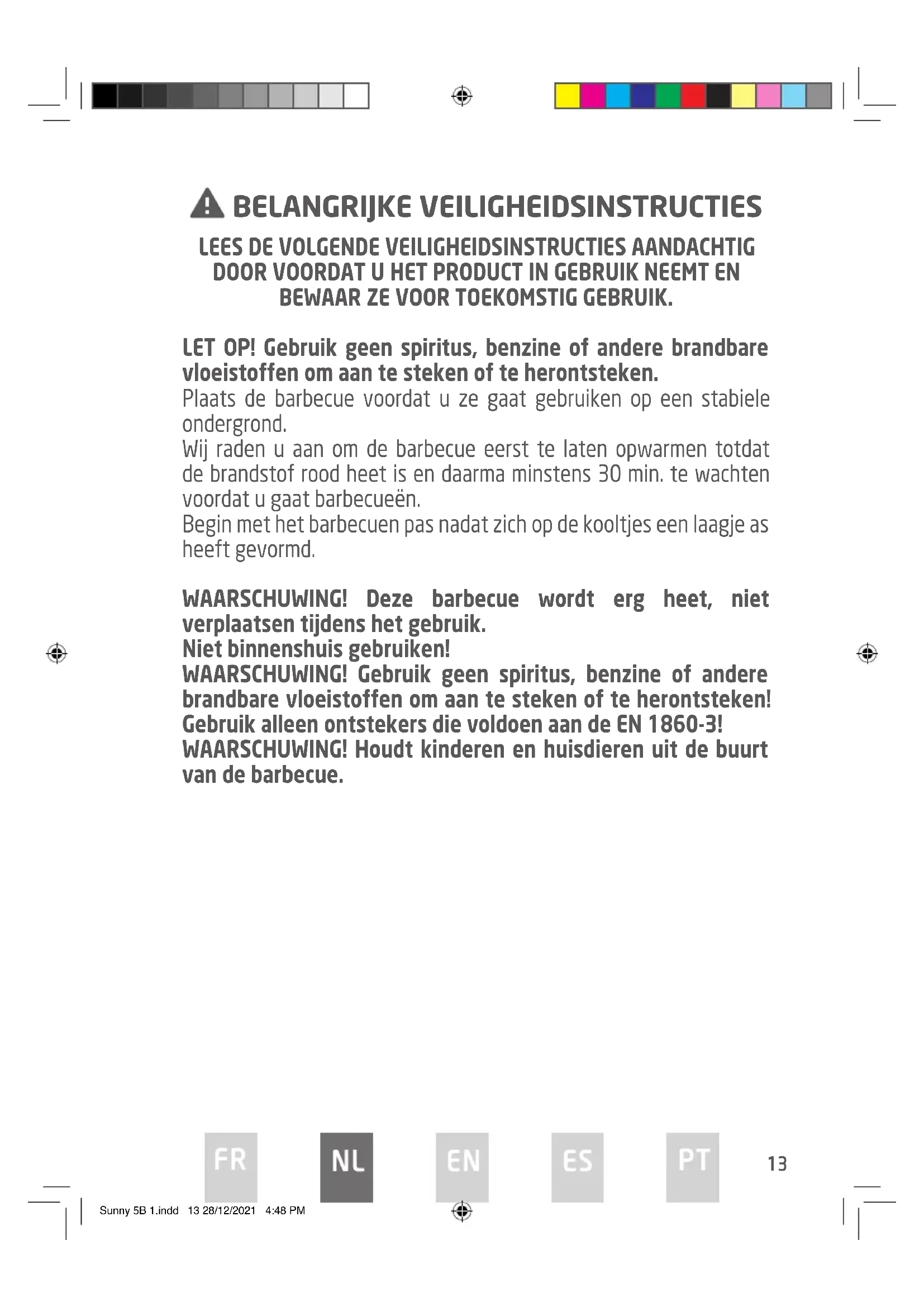 DOOR VOORDAT U HET PRODUCT IN GEBRUIK NEEMT EN BEWAAR ZE VOOR TOEKOMSTIG GEBRUIK. LET OP! Gebruik geen spiritus, benzine of andere brandbare vloeistoffen om aan te steken of te herontsteken. Plaats de barbecue voordat u ze gaat gebruiken op een stabiele ondergrond. Wij raden u aan om de barbecue eerst te laten opwarmen totdat de brandstof rood heet is en daarma minstens 30 min. te wachten voordat u gaat barbecueën. Begin met het barbecuen pas nadat zich op de kooltjes een laagje as heeft gevormd. WAARSCHUWING! Deze barbecue wordt erg heet, niet verplaatsen tijdens het gebruik. Niet binnenshuis gebruiken! WAARSCHUWING! Gebruik geen spiritus, benzine of andere brandbare vloeistoffen om aan te steken of te herontsteken! Gebruik alleen ontstekers die voldoen aan de EN 1860-3! WAARSCHUWING! Houdt kinderen en huisdieren uit de buurt van de barbecue. BELANGRIJKE VEILIGHEIDSINSTRUCTIES Sunny 5B 1.indd 13 28/12/2021 4:48 PM14 Gebruik de barbecue niet in een besloten en/of woonruimte, zoals een huis,tent, caravan, camper, boot. Levensgevaar door koolstofmonoxidevergiftiging.