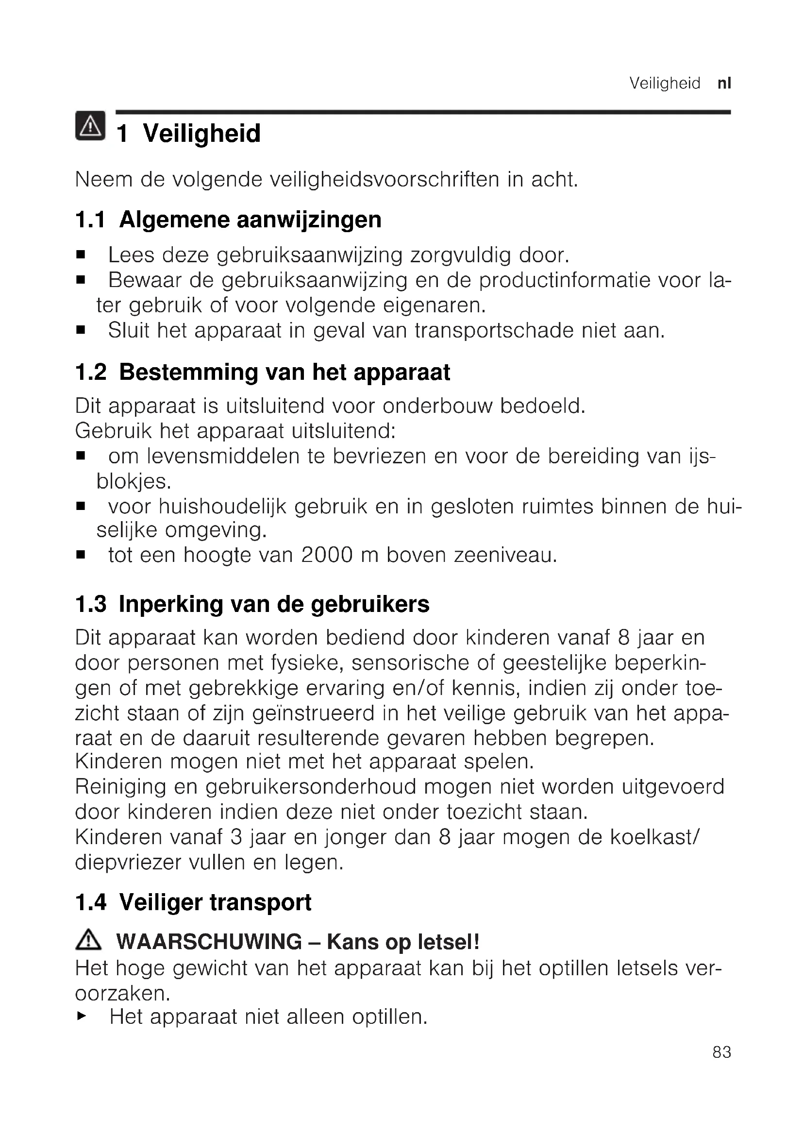 1 Veiligheid Neem de volgende veiligheidsvoorschriften in acht. 1.1 Algemene aanwijzingen ¡ Lees deze gebruiksaanwijzing zorgvuldig door. ¡ Bewaar de gebruiksaanwijzing en de productinformatie voor la- ter gebruik of voor volgende eigenaren. ¡ Sluit het apparaat in geval van transportschade niet aan. 1.2 Bestemming van het apparaat Dit apparaat is uitsluitend voor onderbouw bedoeld. Gebruik het apparaat uitsluitend: ¡ om levensmiddelen te bevriezen en voor de bereiding van ijs- blokjes. ¡ voor huishoudelijk gebruik en in gesloten ruimtes binnen de hui- selijke omgeving. ¡ tot een hoogte van 2000m boven zeeniveau. 1.3 Inperking van de gebruikers Dit apparaat kan worden bediend door kinderen vanaf 8 jaar en door personen met fysieke, sensorische of geestelijke beperkin- gen of met gebrekkige ervaring en/of kennis, indien zij onder toe- zicht staan of zijn geïnstrueerd in het veilige gebruik van het appa- raat en de daaruit resulterende gevaren hebben begrepen. Kinderen mogen niet met het apparaat spelen. Reiniging en gebruikersonderhoud mogen niet worden uitgevoerd door kinderen indien deze niet onder toezicht staan. Kinderen vanaf 3 jaar en jonger dan 8 jaar mogen de koelkast/ diepvriezer vullen en legen. 1.4 Veiliger transport WAARSCHUWING‒Kans op letsel! Het hoge gewicht van het apparaat kan bij het optillen letsels ver- oorzaken. ▶ Het apparaat niet alleen optillen.nl Veiligheid
