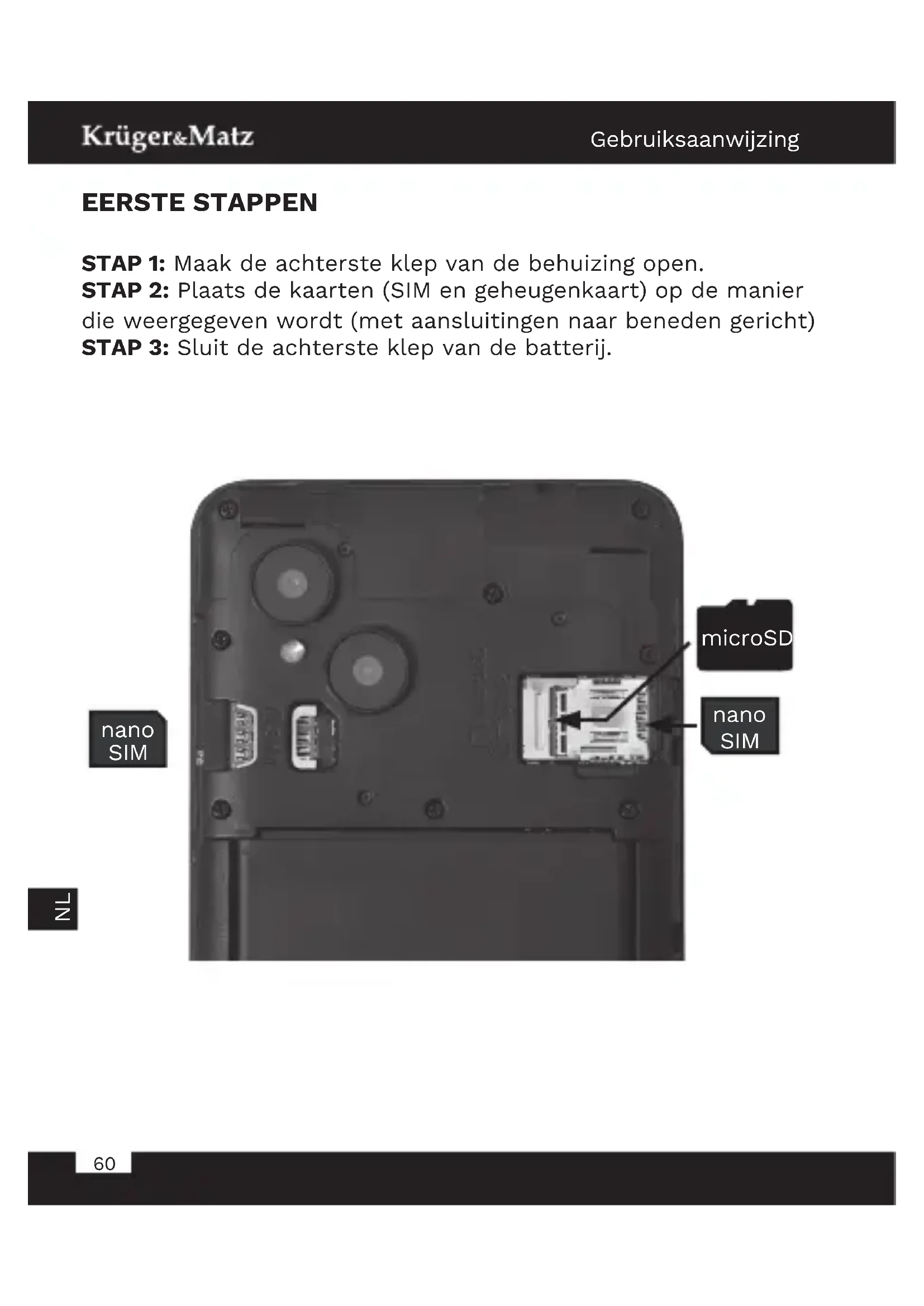EERSTE STAPPEN STAP 1: Maak de achterste klep van de behuizing open. STAP 2: Plaats de kaarten (SIM en geheugenkaart) op de manier die weergegeven wordt (met aansluitingen naar beneden gericht) STAP 3: Sluit de achterste klep van de batterij. microSD nano SIM nano SIMGebruiksaanwijzing