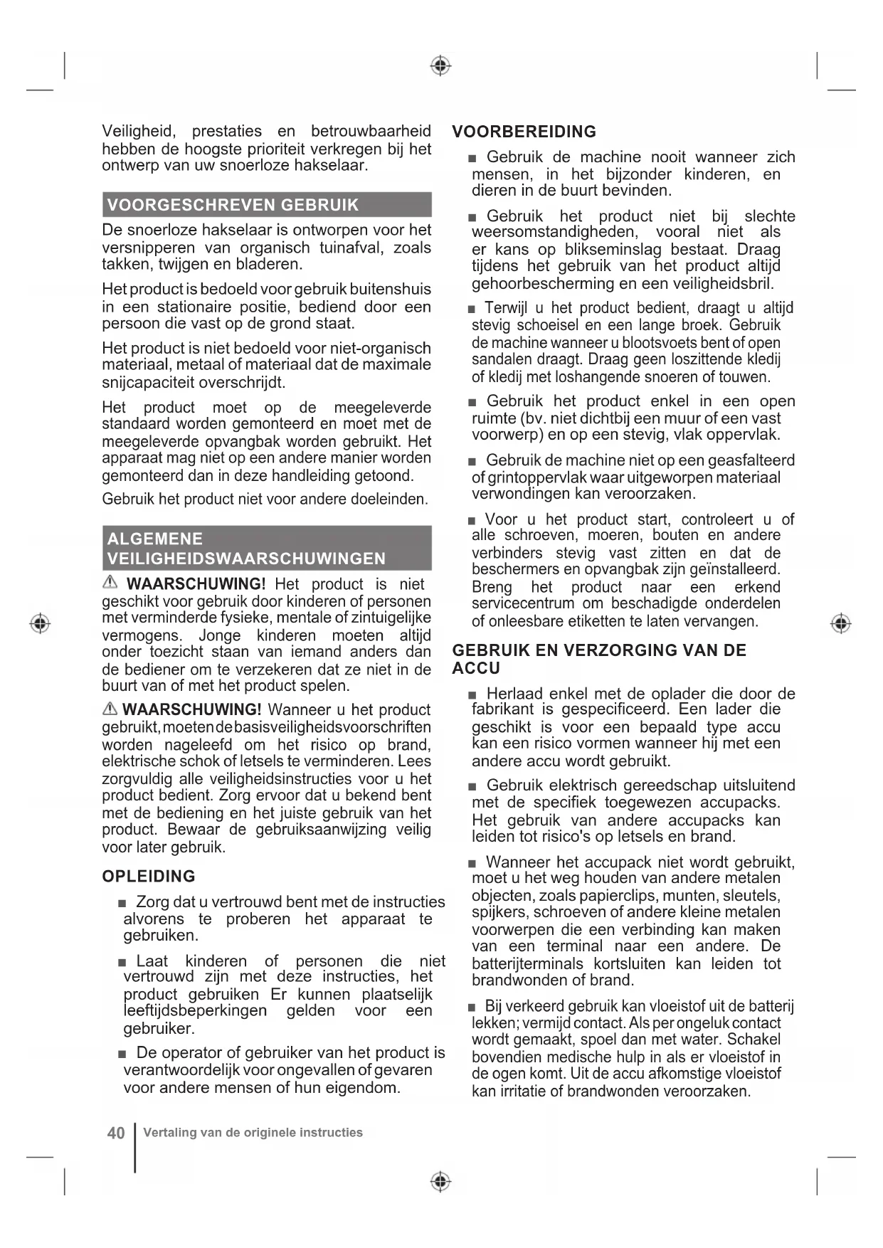 Vertaling van de originele instructiesEXTRA WAARSCHUWINGEN BATTERIJVEILIGHEID ■ Dompel uw accu of oplader nooit onder in vloeistof en laat er nooit vloeistof instromen, zulks om het risico op brand, persoonlijk letsel en productschade door kortsluiting te verminderen. Bijtende of geleidende vloeistoffen, zoals zeewater, bepaalde industriële chemicaliën en bleekmiddelen of chloorhoudende producten, etc., kunnen kortsluiting veroorzaken. ■ Laad de accu op op een locatie met een omgevingstemperatuur van 10 °C tot 38 °C. ■ Bewaar de accu op een locatie met een omgevingstemperatuur van 0 °C tot 20°C. ■ Gebruik de accu op een locatie met een omgevingstemperatuur van 0 °C tot 40 °C. ONDERHOUD ■ Gebruik alleen originele vervangingsonderdelen, accessoires en hulpstukken van de fabrikant. Doet u dat niet, dan kan dat mogelijke verwondingen veroorzaken, bijdragen tot slechte prestaties en kan uw garantie vervallen. ■ Alvorens het product te reinigen, inspecteren of onderhouden, dienen de messen volledig tot stilstand te zijn gekomen en de accu zijn verwijderd. Nadat u zekere tijd hebt gehakseld, wordt het snijmechanisme warm. Laat het afkoelen alvorens te reinigen, inspecteren of instellen. ■ De snijmessen zijn uiterst scherp. Om letsels te voorkomen, dient u uiterst voorzichtig te zijn tijdens het onderhoud of wanneer u in de buurt van de snijbladen of in een geopende holte werkt wanneer de opvangbak is verwijderd. Draag altijd stevige veiligheidshandschoenen. ■ Houd rekening met het feit dat de messen nog steeds kunnen bewegen wanneer de stroom is uitgeschakeld of de vergrendelschakelaar is geactiveerd. ■ Om de beste prestaties van uw product te verzekeren, moet het schoon worden gehouden. ■ Reinig het product altijd onmiddellijk na gebruik. Waar mogelijk, gebruikt u een harde borstel in de voedings- en uitlaattrechter en een droge doek aan de buitenkant van het product. ■ Laat geen materiaal droog en hard worden op een van de oppervlakken van het product, en in het bijzonder op de messen. Dit zal het verhakselvermogen rechtstreeks beïnvloeden. ■ Zorg ervoor dat de laadtrechter en de uitlaatklep schoon worden gehouden en vrij van alle afval. ■ Zorg ervoor dat alle moeren, bouten en schroeven (behalve de stelschroef) goed zijn aangedraaid en stevig vastzitten. ■ Laat beschadigde of versleten onderdelen altijd herstellen of vervangen door gekwalificeerd personeel in een geautoriseerd onderhoudscentrum. ■ Probeer de vergrendelschakelaar op de opvangbak of aan het voorste deksel van de snijmessen te overbruggen. ■ Laat op geen elk moment remvloeistoffen, benzine, producten op petroleumbasis, penetrerende oliën, etc. in contact komen met kunststof onderdelen. Gebruik nooit remvloeistoffen, benzine, producten op petroleumbasis of oplosmiddelen om het apparaat te reinigen. De meeste soorten plastic zijn gevoelig voor schade, veroorzaakt door verschillende soorten commerciële oplosmiddelen en kunnen door hun gebruik worden beschadigd. ■ U mag de onderhoudswerken uitvoeren die in deze gebruiksaanwijzing zijn beschreven. Voor andere reparaties moet het product door een erkend servicecentrum worden gerepareerd.
