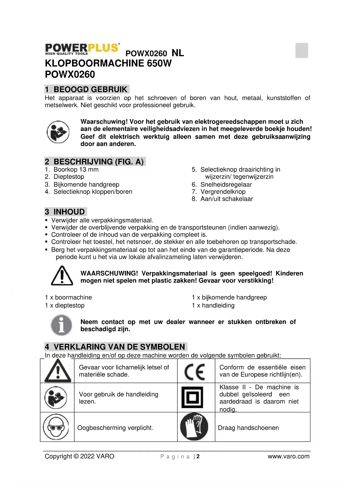Copyright © 2022 VARO P a g i n a | 2 www.varo.com KLOPBOORMACHINE 650W POWX0260 1 BEOOGD GEBRUIK Het apparaat is voorzien op het schroeven of boren van hout, metaal, kunststoffen of metselwerk. Niet geschikt voor professioneel gebruik. Waarschuwing! Voor het gebruik van elektrogereedschappen moet u zich aan de elementaire veiligheidsadviezen in het meegeleverde boekje houden! Geef dit elektrisch werktuig alleen samen met deze gebruiksaanwijzing door aan anderen. 2 BESCHRIJVING (FIG. A)