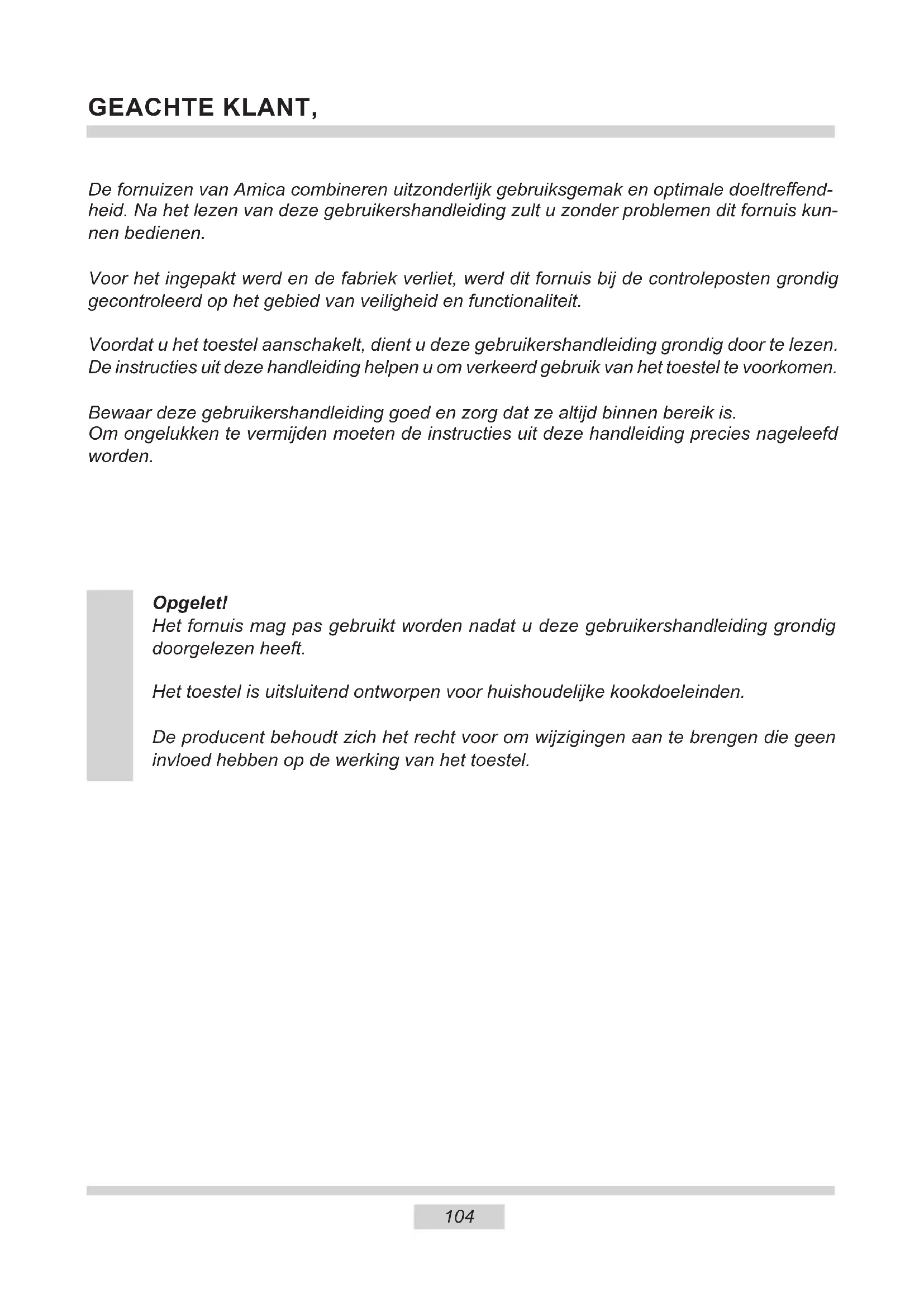 NL105 VEILIGHEIDSINSTRUCTIES Attentie. Dit apparaat en de bereikbare onderdelen ervan worden tijdens het gebruik heet. Wees bijzonder voorzich- tig bij het aanraken van de verwarmingselementen. Zorg dat kinderen die jonger zijn dan 8 jaar niet bij het apparaat kunnen komen, tenzij ze onder permanent toezicht staan. Dit apparaat mag gebruikt worden door kinderen van 8 jaar en ouder en personen met lichamelijke of geestelijke beperkingen of personen zonder ervaring met of kennis van het apparaat, als dit gebruik plaatsvindt onder toezicht of in overeenstemming met de gebruiksaanwijzing van het apparaat, door personen die verantwoordelijk zijn voor hun veiligheid. Zorg ervoor dat kinderen niet met het apparaat kunnen spelen. Kinderen mogen de kookplaat niet zonder toezicht schoonmaken of onderhoudswerkzaamheden ver- richten. Attentie. Het koken van vetten of olie op de kookplaat zonder toezicht kan erg gevaarlijk zijn en leiden tot brand. Probeer het vuur NOOIT met water te blussen, maar schakel het apparaat uit en bedek de vlammen met een deksel of een niet-brandbare deken. Attentie. Brandgevaar: geen voorwerpen verzamelen op de kookoppervlakte. Tijdens het gebruik wordt het toestel heet. Wees voorzichtig en raak de hete onderdelen in de oven niet aan. Als dit apparaat gebruikt wordt, kunnen de bereikbare onder- delen heet worden. Laat geen kinderen bij de oven komen.106 VEILIGHEIDSINSTRUCTIES Attentie. Gebruik geen schurende schoonmaakmiddelen of scherpe metalen voorwerpen voor het schoonmaken van het glas van de deur, omdat deze krassen kunnen veroorzaken op het oppervlak. Dit kan leiden tot barsten van het glas. Attentie. Om elektrocutie te vermijden dient u het toestel uit te schakelen vooraleer u het lampje vervangt. Het is aan te raden het deksel te reinigen vooraleer u het opent. U laat het oppervlak van de kookplaat best eerst af- koelen voordat u het deksel sluit. Gebruik geen stoomreinigers voor het schoonmaken van het fornuis. Gevaar voor verbranding! Bij het openen van de ovendeur kan hete stoom ontsnappen. Wees voorzichtig met het ope- nen van de deur tijdens of na aoop van het koken. Buig u bij het openen niet over de deur. Vergeet niet dat stoom bij bepaalde temperaturen onzichtbaar kan zijn. Opgelet. Het kookproces moet onder toezicht plaatsvin- den. Kortdurend koken moet onder continu toezicht plaat- svinden. WAARSCHUWING. Gebruik uitsluitend schermen voor de kookplaat die zijn ontworpen door de producent van het apparaat of die door de producent in de gebruiksaanwij- zing worden aanbevolen. Het toepassen van ongeschikte schermen kan ongevallen veroorzaken.107 VEILIGHEIDSINSTRUCTIES Attentie: Het kook- en braadtoestel genereert warmte, vocht en verbrandingsproducten in de ruimte waarin het geïnstalleerd is. Zorg ervoor dat de keuken goed geventileerd is, vooral wanneer het toestel wordt gebruikt. Langdurig intensief gebruik kan extra ventilatie vereisen, zoals het verhogen van de capaciteit van de mechanische ventilatie, indien toegepast, of extra ventilatie om de verbrandingsproducten veilig naar buiten af te voeren zodat de luchtuitwisseling in de ruimte gewaarborgd blijft. Raadpleeg een specialist alvorens extra ventilatie te installeren. Attentie: Het toestel mag alleen gebruikt worden om te koken en te bakken/braden. Het mag niet gebruikt worden voor andere doeleinden, zoals ruimteverwarming. Het toestel is bedoeld voor typische functies in een huishoudelijke omgeving (bv. koken) door niet-deskundige gebruikers. Voorbeelden van huishoudelijke omgevingen - huizen en ats, - winkels, kantoren en andere soortgelijke werkplekken, - boerderijen/landbouwbedrijven, - hotels, motels en andere woonomgevingen waar het toestel wordt gebruikt door niet-deskundige gebruikers.108 VEILIGHEIDSINSTRUCTIES Wees bijzonder voorzichtig als er kinderen in de buurt van het fornuis zijn, want ze kennen de bedieningsprincipes van het fornuis niet. De hete branders van de gaskookplaat, de ovenkamer, het rooster, de ruit van de deur, en potten en pannen met hete vloeistoen kunnen brandwonden veroorzaken! Zorg ervoor, dat de elektrische kabels van gemechaniseerde keukentoestellen, bv. mixers, de hete onderdelen van het fornuis niet raken. Plaats geen lichtontvlambare materialen in de schuif, want deze kunnen ontvlammen terwijl de oven werkt. Laat het fornuis niet achter zonder toezicht terwijl u kookt. Oliën en vetten kunnen ont- vlammen als gevolg van oververhitting. Let op het kookpunt, zodat de branders niet onderlopen. Als het fornuis beschadigd is, mag u het pas opnieuw gebruiken na herstelling door een vakman. Open de kraan op de gasaansluiting of het ventiel op de gases niet voordat u gecontro- leerd hebt of alle kranen gesloten zijn. Zorg ervoor dat de branders niet onderlopen of vuil worden. Reinig en droog vuile branders onmiddellijk nadat ze afgekoeld zijn. Plaats geen potten of pannen rechtstreeks op de branders. Plaats geen potten of pannen van meer dan 10 kg op het rooster boven een brander, en geen potten en pannen met een gezamenlijk gewicht van meer dan 40 kg op het volledige rooster. Sla niet op de draaiknoppen of branders. Plaats geen potten of pannen met een gewicht van meer dan 15 kg op de open deur van de oven Het is verboden om aanpassingen of herstellingen aan het fornuis te laten uitvoeren door ongeschoolde personen. Het is verboden om de kranen van het fornuis open te draaien zonder dat u een aange- stoken lucifer of een aansteker bij de hand hebt. Het is verboden om de vlam van de brander te doven door erop te blazen Het is aan te raden het deksel te reinigen vooraleer u het opent. U laat het oppervlak van de kookplaat best eerst afkoelen voordat u het deksel sluit. Het glazen deksel kan barsten als het opgewarmd wordt. Doof eerst alle branders voordat u het deksel sluit. (Fornuizen met een glazen deksel – zie “Kenmerken van het toestel”).109 VEILIGHEIDSINSTRUCTIES Het is verboden om zelfstandig het fornuis aan te passen aan een ander soort gas, het fornuis naar