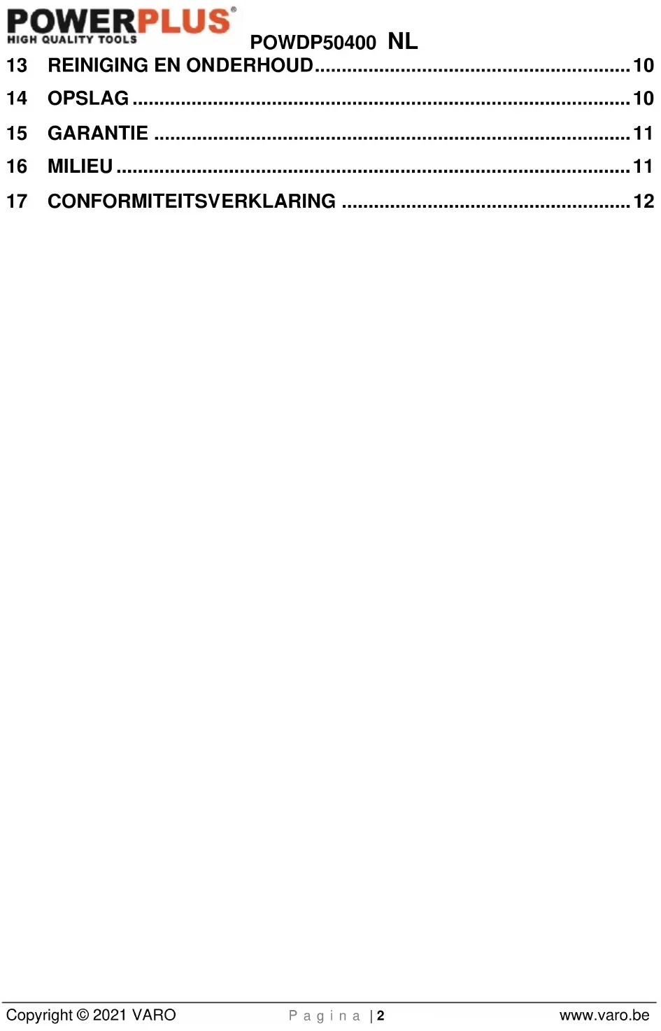 - Bewaar de machine niet in plastic of Nylon zakken om te vermijden dat er zich vocht ophoopt.POWDP50400 NL Copyright © 2021 VARO P a g i n a | 11 www.varo.be 15 GARANTIE
