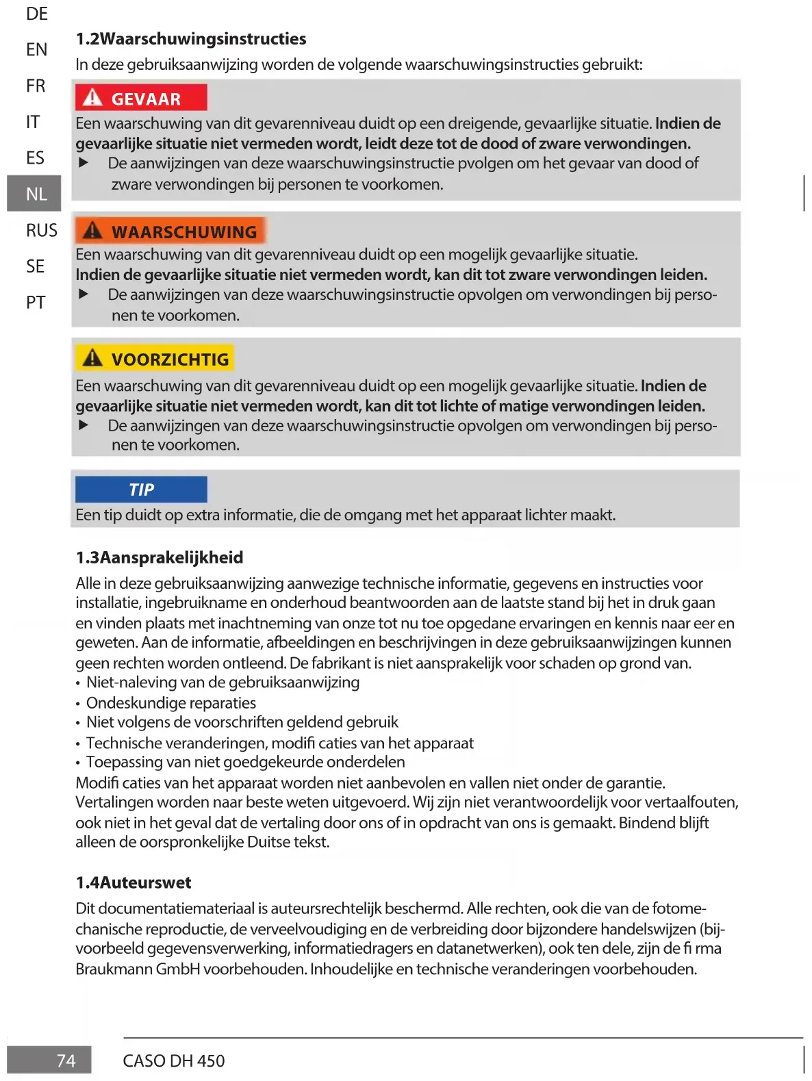 RUS CASO DH 450 2 Veiligheid In dit hoofdstuk krijgt u belangrijke veiligheidsinstructies betre ende de omgang met het appa- raat. Dit apparaat beantwoordt aan de voorgeschreven veiligheidsvoorschriften. Een ondeskundig gebruik kan echter tot materiële schade en schade aan personen leiden.