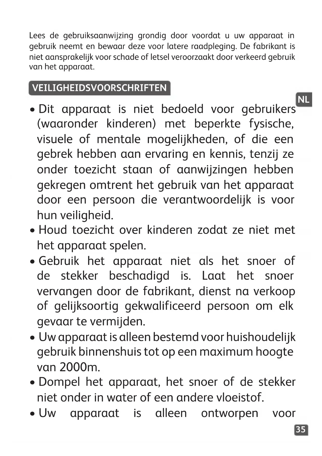 - Uw apparaat is alleen bestemd voor huishoudelijk gebruik binnenshuis tot op een maximum hoogte van 2000m.