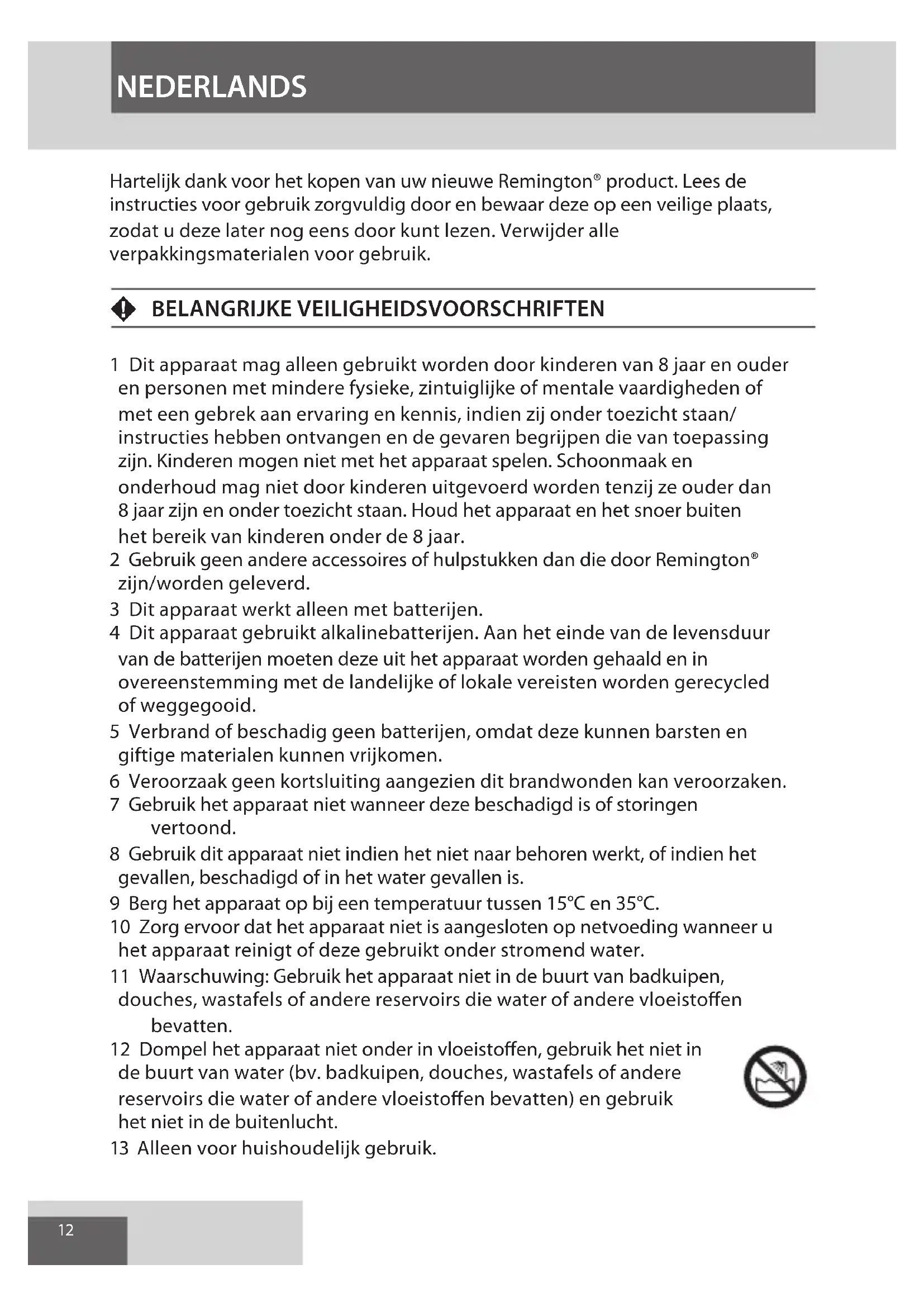1 Dit apparaat mag alleen gebruikt worden door kinderen van 8 jaar en ouder en personen met mindere fysieke, zintuiglijke of mentale vaardigheden of met een gebrek aan ervaring en kennis, indien zij onder toezicht staan/ instructies hebben ontvangen en de gevaren begrijpen die van toepassing zijn. Kinderen mogen niet met het apparaat spelen. Schoonmaak en onderhoud mag niet door kinderen uitgevoerd worden tenzij ze ouder dan 8 jaar zijn en onder toezicht staan. Houd het apparaat en het snoer buiten het bereik van kinderen onder de 8 jaar. 2 Gebruik geen andere accessoires of hulpstukken dan die door Remington® zijn/worden geleverd. 3 Dit apparaat werkt alleen met batterijen. 4 Dit apparaat gebruikt alkalinebatterijen. Aan het einde van de levensduur van de batterijen moeten deze uit het apparaat worden gehaald en in overeenstemming met de landelijke of lokale vereisten worden gerecycled of weggegooid. 5 Verbrand of beschadig geen batterijen, omdat deze kunnen barsten en giftige materialen kunnen vrijkomen. 6 Veroorzaak geen kortsluiting aangezien dit brandwonden kan veroorzaken. 7 Gebruik het apparaat niet wanneer deze beschadigd is of storingen vertoond. 8 Gebruik dit apparaat niet indien het niet naar behoren werkt, of indien het gevallen, beschadigd of in het water gevallen is. 9 Berg het apparaat op bij een temperatuur tussen 15°C en 35°C. 10 Zorg ervoor dat het apparaat niet is aangesloten op netvoeding wanneer u het apparaat reinigt of deze gebruikt onder stromend water. 11 Waarschuwing: Gebruik het apparaat niet in de buurt van badkuipen, douches, wastafels of andere reservoirs die water of andere vloeistoen bevatten. 12 Dompel het apparaat niet onder in vloeistoen, gebruik het niet in de buurt van water (bv. badkuipen, douches, wastafels of andere reservoirs die water of andere vloeistoen bevatten) en gebruik het niet in de buitenlucht. 13 Alleen voor huishoudelijk gebruik. NEDERLANDS13