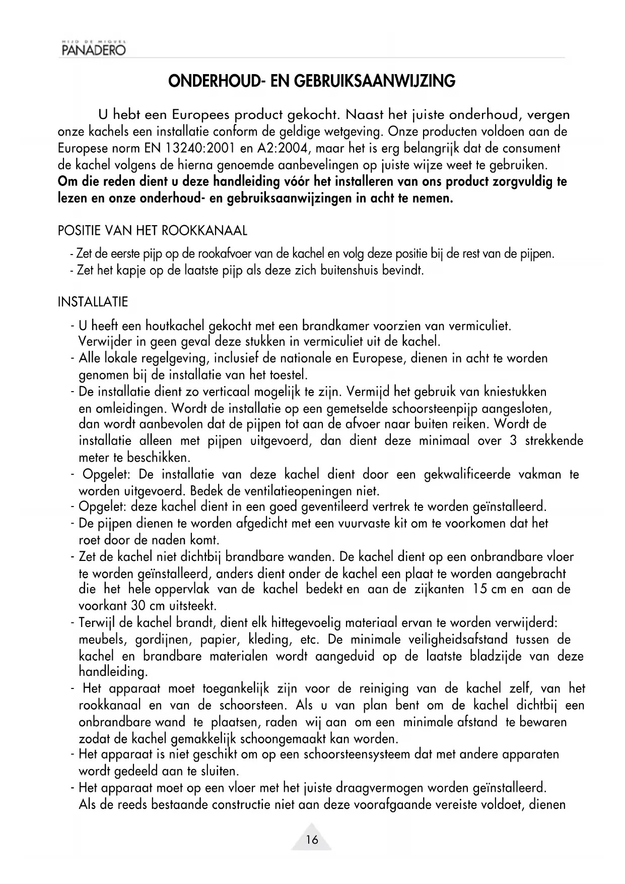 U hebt een Europees product gekocht. Naast het juiste onderhoud, vergen onze kachels een installatie conform de geldige wetgeving. Onze producten voldoen aan de Europese norm EN 13240:2001 en A2:2004, maar het is erg belangrijk dat de consument de kachel volgens de hierna genoemde aanbevelingen op juiste wijze weet te gebruiken. Om die reden dient u deze handleiding vóór het installeren van ons product zorgvuldig te lezen en onze onderhoud- en gebruiksaanwijzingen in acht te nemen.