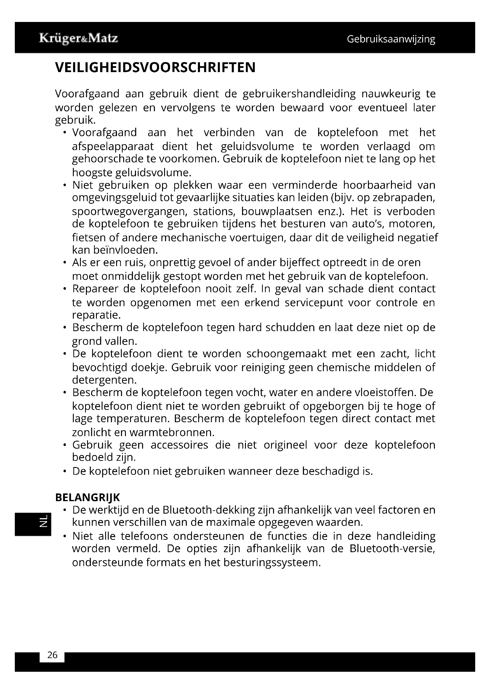 VEILIGHEIDSVOORSCHRIFTEN Voorafgaand aan gebruik dient de gebruikershandleiding nauwkeurig te worden gelezen en vervolgens te worden bewaard voor eventueel later gebruik. Voorafgaand aan het verbinden van de koptelefoon met het afspeelapparaat dient het geluidsvolume te worden verlaagd om gehoorschade te voorkomen. Gebruik de koptelefoon niet te lang op het hoogste geluidsvolume. Niet gebruiken op plekken waar een verminderde hoorbaarheid van omgevingsgeluid tot gevaarlijke situaties kan leiden (bijv. op zebrapaden, spoortwegovergangen, stations, bouwplaatsen enz.). Het is verboden de koptelefoon te gebruiken tijdens het besturen van auto’s, motoren,