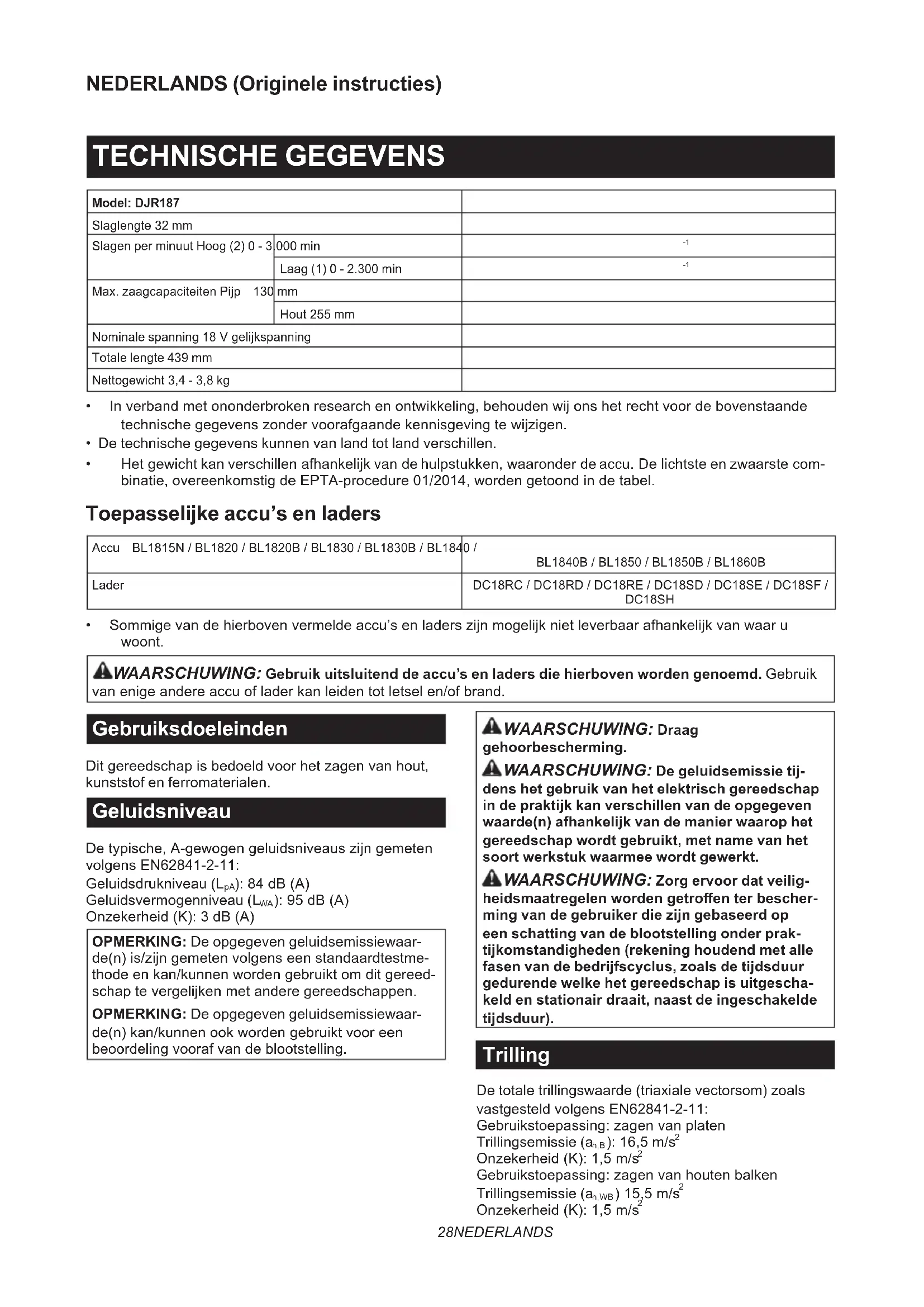 - Sommigevandehierbovenvermeldeaccu’senladerszijnmogelijknietleverbaarafhankelijkvanwaaru woont. WAARSCHUWING: Gebruik uitsluitend de accu’s en laders die hierboven worden genoemd.Gebruik vanenigeandereaccuofladerkanleidentotletselen/ofbrand. Gebruiksdoeleinden Ditgereedschapisbedoeldvoorhetzagenvanhout, kunststof en ferromaterialen. Geluidsniveau Detypische,A-gewogengeluidsniveauszijngemeten volgensEN62841-2-11: Geluidsdrukniveau (L