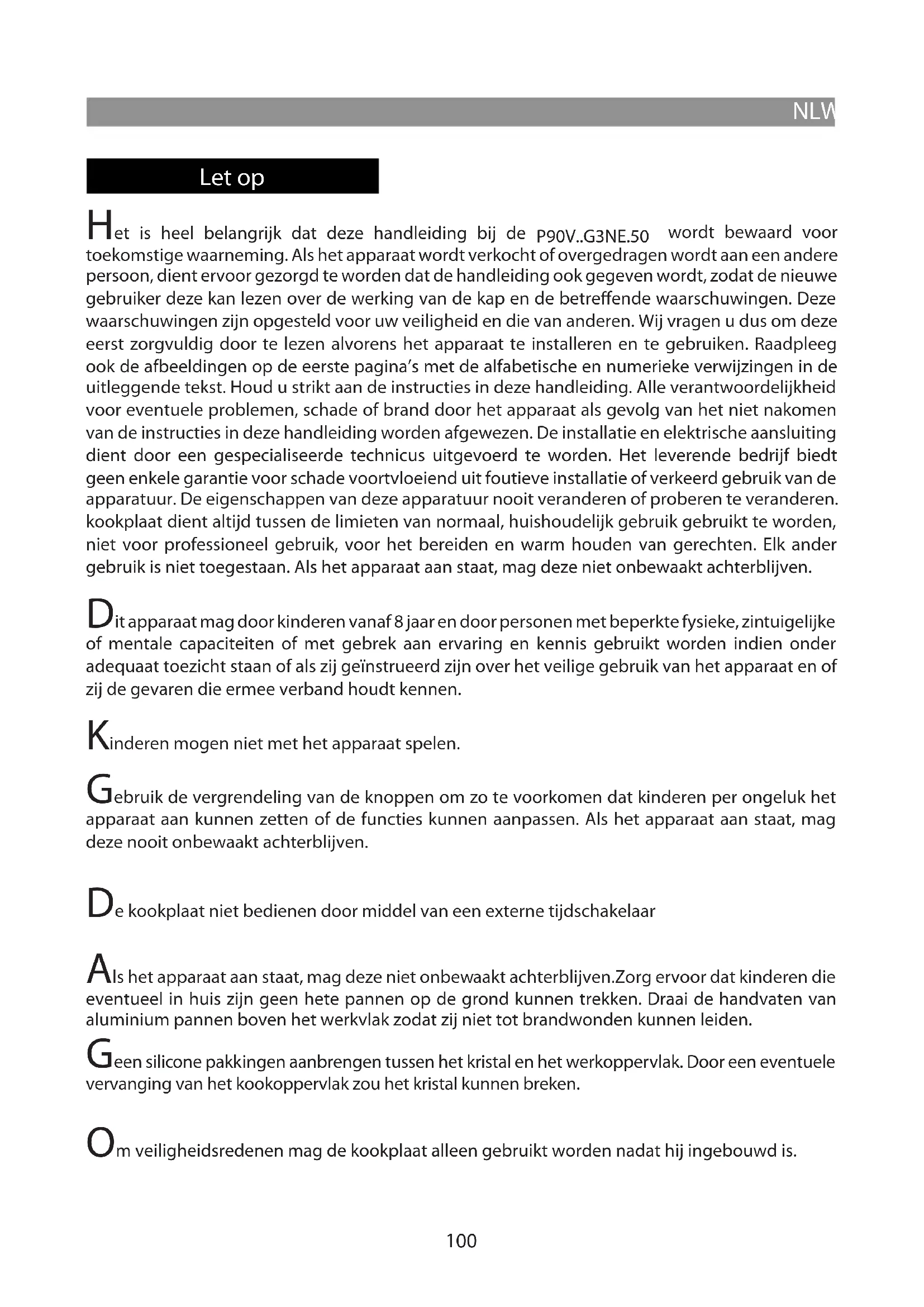 NLWAARSCHUWINGEN Het is heel belangrijk dat deze handleiding bij de P90V..G3NE.50 wordt bewaard voor toekomstige waarneming. Als het apparaat wordt verkocht of overgedragen wordt aan een andere persoon, dient ervoor gezorgd te worden dat de handleiding ook gegeven wordt, zodat de nieuwe gebruiker deze kan lezen over de werking van de kap en de betreende waarschuwingen. Deze waarschuwingen zijn opgesteld voor uw veiligheid en die van anderen. Wij vragen u dus om deze eerst zorgvuldig door te lezen alvorens het apparaat te installeren en te gebruiken. Raadpleeg ook de afbeeldingen op de eerste pagina’s met de alfabetische en numerieke verwijzingen in de uitleggende tekst. Houd u strikt aan de instructies in deze handleiding. Alle verantwoordelijkheid voor eventuele problemen, schade of brand door het apparaat als gevolg van het niet nakomen van de instructies in deze handleiding worden afgewezen. De installatie en elektrische aansluiting dient door een gespecialiseerde technicus uitgevoerd te worden. Het leverende bedrijf biedt geen enkele garantie voor schade voortvloeiend uit foutieve installatie of verkeerd gebruik van de apparatuur. De eigenschappen van deze apparatuur nooit veranderen of proberen te veranderen. kookplaat dient altijd tussen de limieten van normaal, huishoudelijk gebruik gebruikt te worden, niet voor professioneel gebruik, voor het bereiden en warm houden van gerechten. Elk ander gebruik is niet toegestaan. Als het apparaat aan staat, mag deze niet onbewaakt achterblijven. Dit apparaat mag door kinderen vanaf 8 jaar en door personen met beperkte fysieke, zintuigelijke of mentale capaciteiten of met gebrek aan ervaring en kennis gebruikt worden indien onder adequaat toezicht staan of als zij geïnstrueerd zijn over het veilige gebruik van het apparaat en of zij de gevaren die ermee verband houdt kennen. Kinderen mogen niet met het apparaat spelen. Gebruik de vergrendeling van de knoppen om zo te voorkomen dat kinderen per ongeluk het apparaat aan kunnen zetten of de functies kunnen aanpassen. Als het apparaat aan staat, mag deze nooit onbewaakt achterblijven. De kookplaat niet bedienen door middel van een externe tijdschakelaar Als het apparaat aan staat, mag deze niet onbewaakt achterblijven.Zorg ervoor dat kinderen die eventueel in huis zijn geen hete pannen op de grond kunnen trekken. Draai de handvaten van aluminium pannen boven het werkvlak zodat zij niet tot brandwonden kunnen leiden. Geen silicone pakkingen aanbrengen tussen het kristal en het werkoppervlak. Door een eventuele vervanging van het kookoppervlak zou het kristal kunnen breken. Om veiligheidsredenen mag de kookplaat alleen gebruikt worden nadat hij ingebouwd is. Let opFUNZIONAMENTO