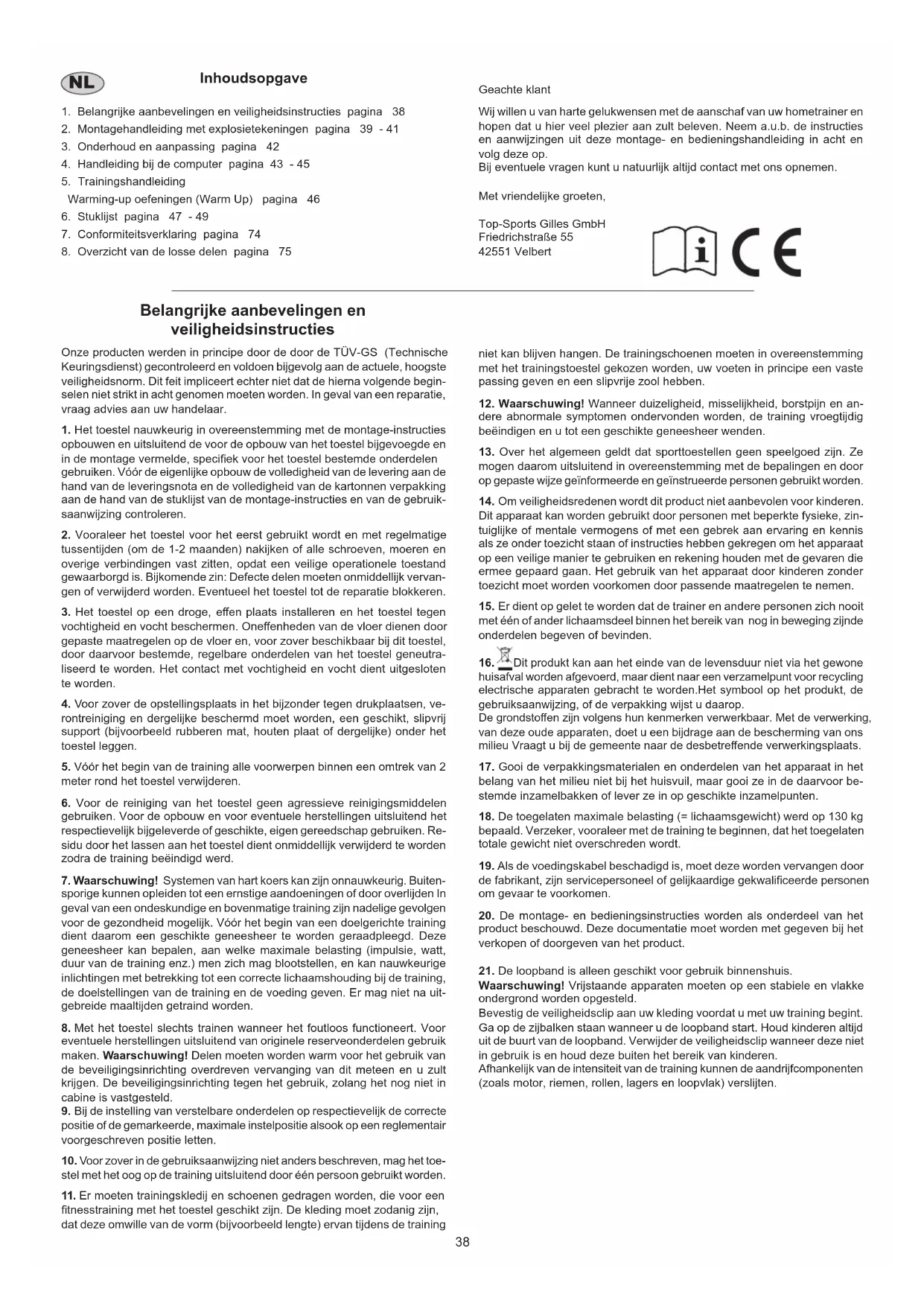 De sleutel tot een succesvol programma is een regelmage training. U kunt het beste een vaste jd en plaats per trainingsdag vaststellen en u ook geestelijk op de training voorbereiden. Train alleen met een goed humeur en houd uw doel voor ogen. Met een connue training zult u zien dat u per dag vooruitgang boekt, dat u zich verder ontwikkelt en dat u uw persoonlijke trainingsdoel beetje bij beetje nadert. Algemene trainingsinstructies47 Nederlands Controleer na het openen van de verpakking a.u.b. aan de hand van de montage staps of alle onderdelen aanwezig zijn. Wanneer dit het geval is, kunt u met de montage beginnen. Wanneer een bepaald onderdeel niet in orde is of ontbreekt, of wanneer u in de toekomst een reserveronderdeel nodig heeft, kunt u zich wenden tot: Top-Sports Gilles GmbH Friedrichstraße 55 42551 Velbert Telefon: +49 (0)20 51 / 60 67-0 Telefax: +49 (0)20 51 / 60 67-44 e-mail: info@christopeit-sport.com www.christopeit-sport.com Deze loopband is alleen bedoeld voor thuissporten en is niet geschikt voor commercieel of commercieel gebruik. Thuissportgebruiksklasse H / C (thuisgebruik, lage nauwkeurigheid) 0 5 10 15 20 25 30 35 40 50 60 70 80 90 100 mm Afbeel- dings-nr. Beschrijving Afmetingen