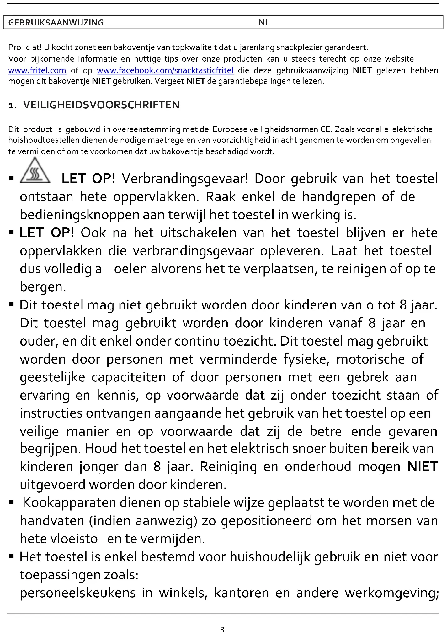 GEBRUIKSAANWIJZING NL Proficiat! U kocht zonet een bakoventje van topkwaliteit dat u jarenlang snackplezier garandeert. Voor bijkomende informatie en nuttige tips over onze producten kan u steeds terecht op onze website www.fritel.com of op www.facebook.com/snacktasticfritel die deze gebruiksaanwijzing NIET gelezen hebben mogen dit bakoventje NIET gebruiken. Vergeet NIET de garantiebepalingen te lezen.