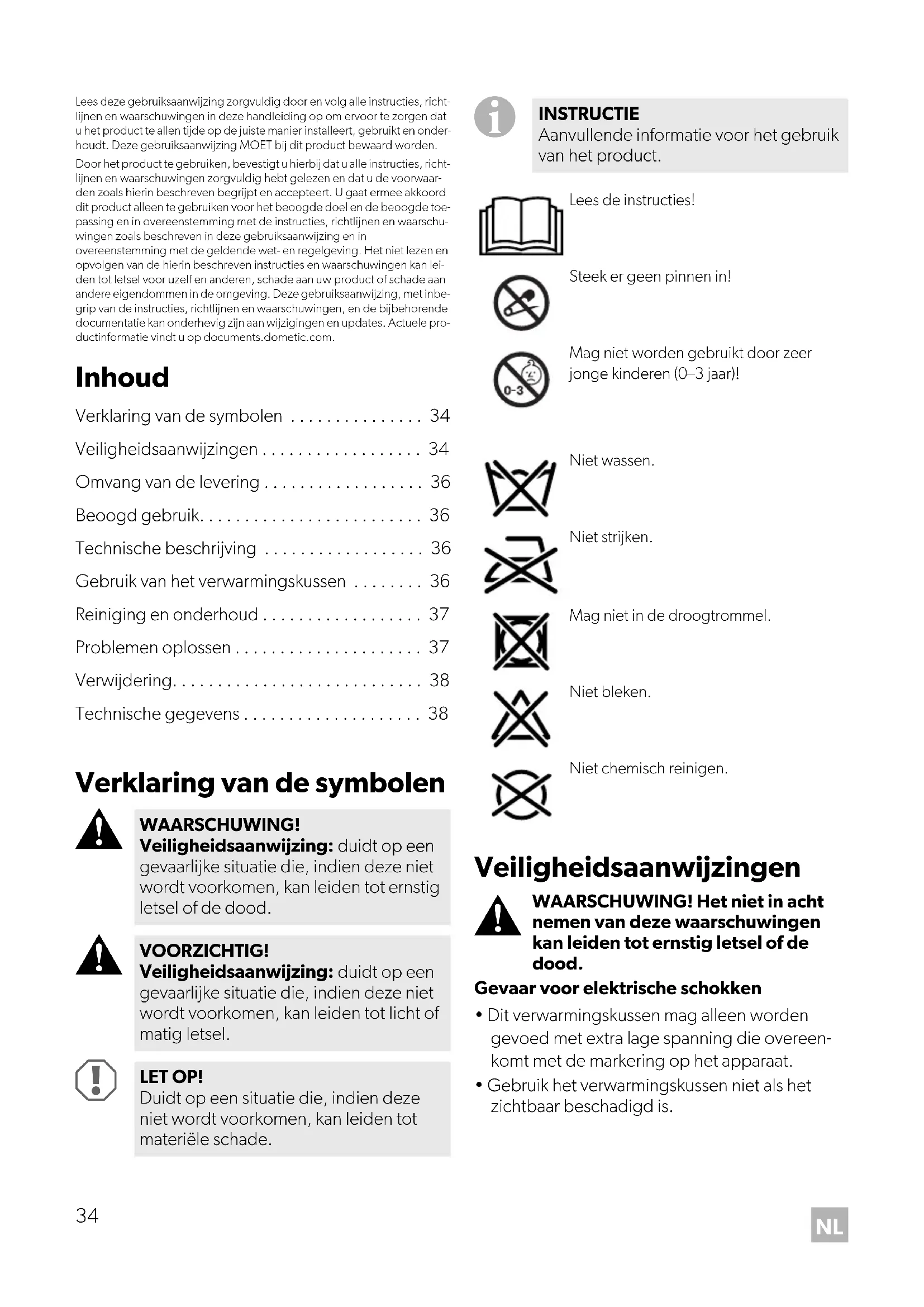 - Gebruik het verwarmingskussen niet als het zichtbaar beschadigd is. WAARSCHUWING! Veiligheidsaanwijzing: duidt op een gevaarlijke situatie die, indien deze niet wordt voorkomen, kan leiden tot ernstig letsel of de dood. VOORZICHTIG! Veiligheidsaanwijzing: duidt op een gevaarlijke situatie die, indien deze niet wordt voorkomen, kan leiden tot licht of matig letsel. LET OP! Duidt op een situatie die, indien deze niet wordt voorkomen, kan leiden tot materiële schade. INSTRUCTIE Aanvullende informatie voor het gebruik van het product. Lees de instructies!Steek er geen pinnen in!Mag niet worden gebruikt door zeer jonge kinderen (0–3 jaar)!Niet wassen.Niet strijken.Mag niet in de droogtrommel.Niet bleken.Niet chemisch reinigen.35