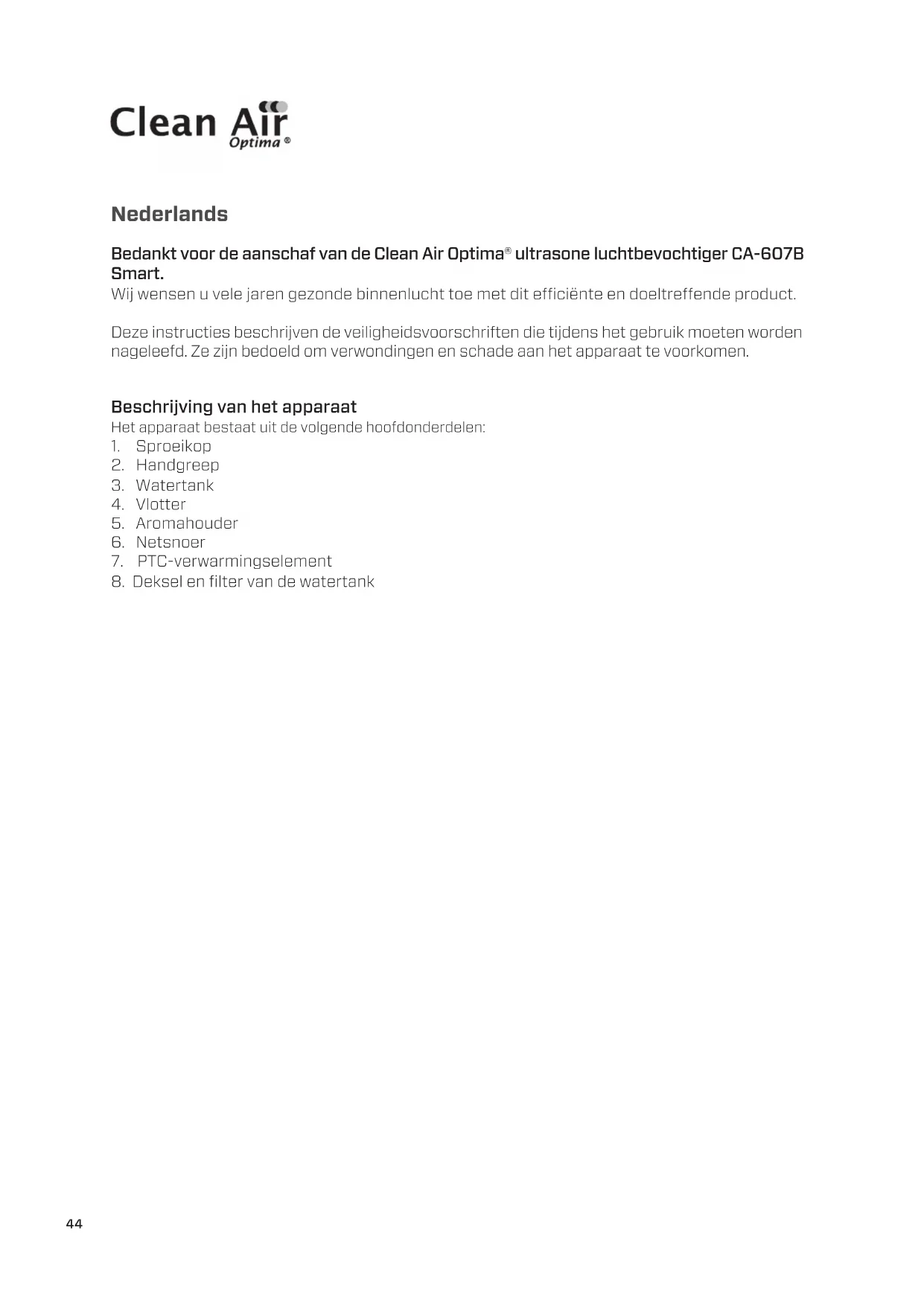 CA-607B Smart / Display44 Nederlands Bedankt voor de aanschaf van de Clean Air Optima® ultrasone luchtbevochtiger CA-607B Smart. Wij wensen u vele jaren gezonde binnenlucht toe met dit eciënte en doeltreende product. Deze instructies beschrijven de veiligheidsvoorschriften die tijdens het gebruik moeten worden nageleefd. Ze zijn bedoeld om verwondingen en schade aan het apparaat te voorkomen. Beschrijving van het apparaat Het apparaat bestaat uit de volgende hoofdonderdelen: