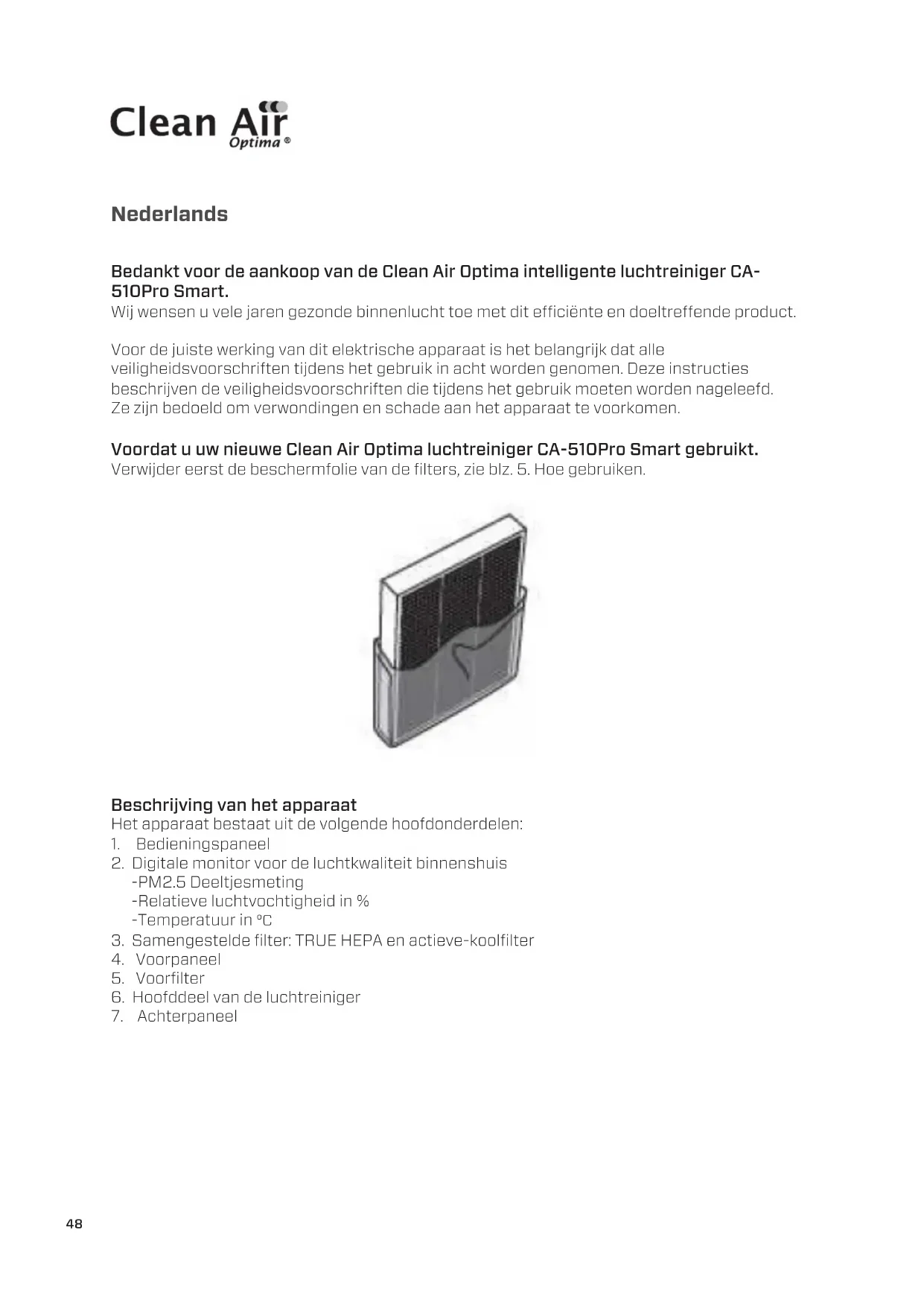 endeomstandigheden waarin de problemen zich voordeden. De Clean Air Optima intelligente luchtreiniger CA-510Pro Smart ondergaat strenge testprocedures voordat het apparaat de fabriek verlaat. Indien het product binnen de 2 jaar na aankoopdatum wegens fabricagefouten niet volgens de specificaties functioneert, heeft de koper recht op gratis herstelling of vervanging van onderdelen op voorlegging van deze garantie (opvoorwaarde dat de storing of beschadiging van het apparaat en/of onderdelen onder normale bedrijfsomstandigheden heeft plaatsgevonden). Wat wordt gedekt: Alle onderdelen met materiaal- of fabricagefouten. Hoe lang: gedurende twee jaar vanaf de aankoopdatum. Wat zullen we doen: Defecte onderdelen repareren of vervangen. Uitsluitingen: Gewone vervangfilters. Overige voorwaarden De bepalingen van deze garantie vervangen elke andere schriftelijke of mondelinge, uitdrukkelijke of impliciete garantie, met inbegrip van elke garantie van verkoopbaarheid ofgeschiktheid voor een bepaald doel. De maximale aansprakelijkheid van de fabrikant bedraagt niet meer dan de aankoopprijs die u daadwerkelijk voor het product heeft betaald. De fabrikant is in geen geval aansprakelijk voor bijzondere schade, incidentele schade, gevolgschade of indirecte schade. Deze garantie dekt geen defecten die het gevolg zijn vanonjuist of onredelijk gebruik of onderhoud, foutieve montage, ongeval, natuurrampen, onjuiste verpakking of ongeoorloofde manipulatie, veranderingen of wijzigingen zoals uitsluitend door ons bepaald. Deze garantie vervalt als het etiket met het serienummer isverwijderd of beschadigd.63 Bedankt om dit te lezen! Deel uw feedback over de Clean Air Optima intelligente luchtreiniger CA-510Pro Smart op: www.cleanairoptima.com Ga voor veelgestelde vragen over de CA-510Pro Smart naar: www.cleanairoptima.com en zoek naar de CA-510Pro Smart. Download de pdf-gebruiksaanwijzing op: www.cleanairoptima.com/info/manuals Bekijk alle Clean Air Optima- productvideo's op: www.youtube.com Clean Air Optima International B.V. | David Ricardostraat 9-7 / 9-9 | 7559 SH Hengelo (ov) Nederland | Telefoon: +31 (0) 74 - 2670145 Clean Air Optima Germany GmbH | Enschedestraße 14 | 48529 Nordhorn | Duitsland Telefoon: +49 (0) 5921 879-121 E-mail: info@cleanairoptima.com Internet: www.cleanairoptima.com64 Français Merci d'avoir acheté le purificateur d’air Clean Air Optima Intelligent Air Purifier CA-510Pro Smart. Grâce à cet appareil ecace, vous bénéficierez d'un air intérieur sain durant de nombreuses années. Assurez-vous que toutes les précautions de sécurité sont respectées lors de l'utilisation de cet appareil électrique, et ce, afin de garantir le bon fonctionnement de celui-ci. Cesinstructions décrivent les consignes de sécurité à respecter lors du fonctionnement del'appareil. Elles sont destinées à prévenir les blessures et à éviter d'endommager l'appareil. Avant d'utiliser votre nouveau purificateur d’air Clean Air Optima Intelligent AirPurifier CA-510Pro Smart. Retirez tout d'abord la garniture d'étanchéité des filtres, voir à la page5. Mode d’emploi. Description de l'appareil Les principaux composants de l'appareil sont les suivants: