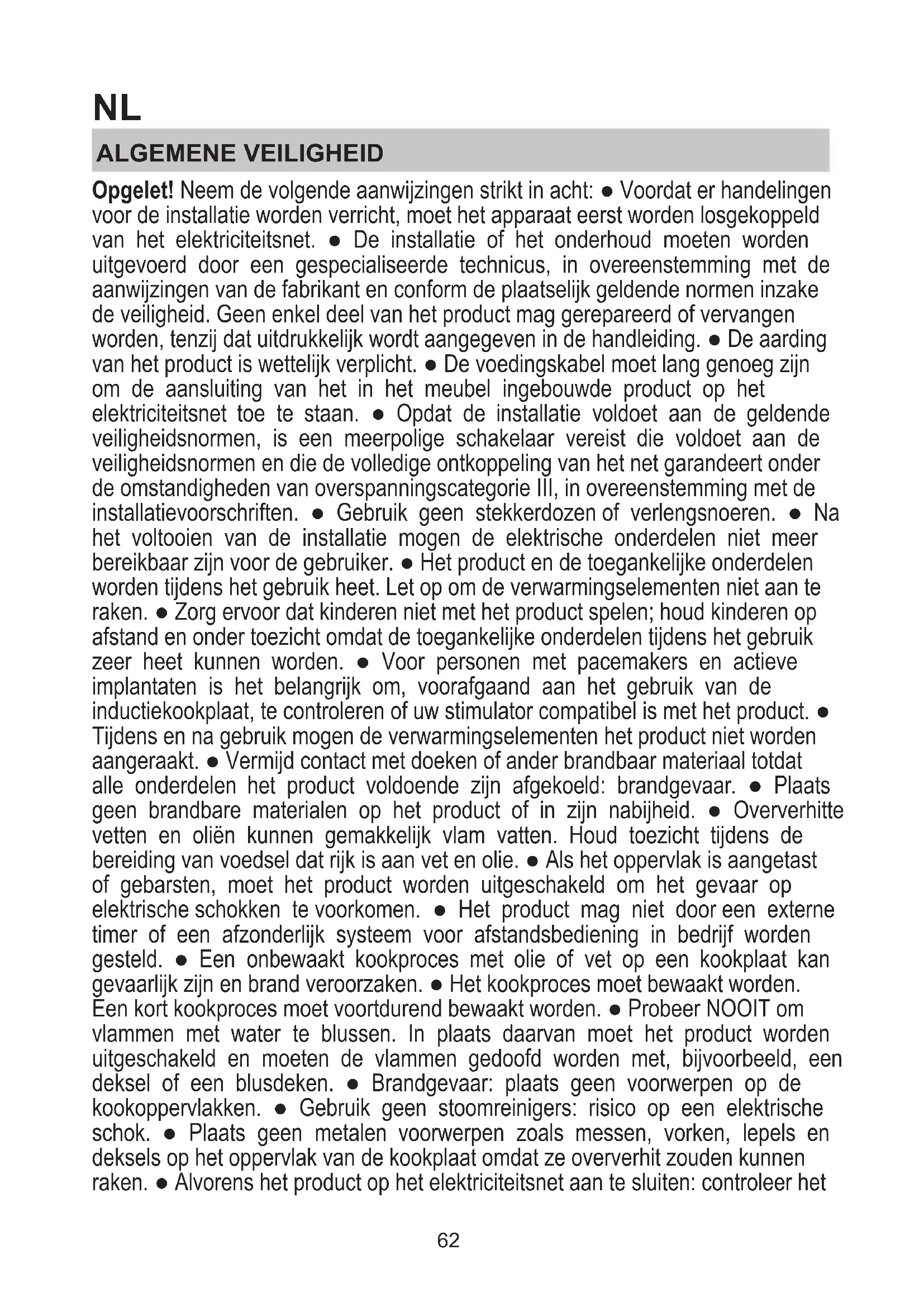 61NL ALGEMENE VEILIGHEID Opgelet! Neem de volgende aanwijzingen strikt in acht: ● Voordat er handelingen voor de installatie worden verricht, moet het apparaat eerst worden losgekoppeld van het elektriciteitsnet. ● De installatie of het onderhoud moeten worden uitgevoerd door een gespecialiseerde technicus, in overeenstemming met de aanwijzingen van de fabrikant en conform de plaatselijk geldende normen inzake de veiligheid. Geen enkel deel van het product mag gerepareerd of vervangen worden, tenzij dat uitdrukkelijk wordt aangegeven in de handleiding. ● De aarding van het product is wettelijk verplicht. ● De voedingskabel moet lang genoeg zijn om de aansluiting van het in het meubel ingebouwde product op het elektriciteitsnet toe te staan. ● Opdat de installatie voldoet aan de geldende veiligheidsnormen, is een meerpolige schakelaar vereist die voldoet aan de veiligheidsnormen en die de volledige ontkoppeling van het net garandeert onder de omstandigheden van overspanningscategorie III, in overeenstemming met de installatievoorschriften. ● Gebruik geen stekkerdozen of verlengsnoeren. ● Na het voltooien van de installatie mogen de elektrische onderdelen niet meer bereikbaar zijn voor de gebruiker. ● Het product en de toegankelijke onderdelen worden tijdens het gebruik heet. Let op om de verwarmingselementen niet aan te raken. ● Zorg ervoor dat kinderen niet met het product spelen; houd kinderen op afstand en onder toezicht omdat de toegankelijke onderdelen tijdens het gebruik zeer heet kunnen worden. ● Voor personen met pacemakers en actieve implantaten is het belangrijk om, voorafgaand aan het gebruik van de inductiekookplaat, te controleren of uw stimulator compatibel is met het product. ● Tijdens en na gebruik mogen de verwarmingselementen het product niet worden aangeraakt. ● Vermijd contact met doeken of ander brandbaar materiaal totdat alle onderdelen het product voldoende zijn afgekoeld: brandgevaar. ● Plaats geen brandbare materialen op het product of in zijn nabijheid. ● Oververhitte vetten en oliën kunnen gemakkelijk vlam vatten. Houd toezicht tijdens de bereiding van voedsel dat rijk is aan vet en olie. ● Als het oppervlak is aangetast of gebarsten, moet het product worden uitgeschakeld om het gevaar op elektrische schokken te voorkomen. ● Het product mag niet door een externe timer of een afzonderlijk systeem voor afstandsbediening in bedrijf worden gesteld. ● Een onbewaakt kookproces met olie of vet op een kookplaat kan gevaarlijk zijn en brand veroorzaken. ● Het kookproces moet bewaakt worden. Een kort kookproces moet voortdurend bewaakt worden. ● Probeer NOOIT om vlammen met water te blussen. In plaats daarvan moet het product worden uitgeschakeld en moeten de vlammen gedoofd worden met, bijvoorbeeld, een deksel of een blusdeken. ● Brandgevaar: plaats geen voorwerpen op de kookoppervlakken. ● Gebruik geen stoomreinigers: risico op een elektrische schok. ● Plaats geen metalen voorwerpen zoals messen, vorken, lepels en deksels op het oppervlak van de kookplaat omdat ze oververhit zouden kunnen raken. ● Alvorens het product op het elektriciteitsnet aan te sluiten: controleer het 62typeplaatje (op de onderkant van het product) om er zeker van te zijn dat de spanning en het vermogen overeenkomen met die van het elektriciteitsnet en controleer of het stopcontact geschikt is. Neem in geval van twijfel contact op met een gekwalificeerde elektricien. Belangrijk: ● Schakel de kookplaat na gebruik uit door middel van het bedieningspaneel en vertrouw daarbij niet op de pan-detector. ● Om het morsen van vloeistoffen te voorkomen moet, voor het koken of verwarmen van vloeistoffen, de warmtetoevoer beperkt worden. ● Laat de verwarmingselementen niet ingeschakeld met lege pannen of potten, of zonder pannen. ● Na de beëindiging van het kookproces moet de betreffende kookzone worden uitgeschakeld. ● Gebruik bij het koken nooit vellen aluminiumfolie en plaats met aluminium verpakte producten nooit rechtstreeks op het product. Aluminium zou kunnen smelten en uw product onherstelbaar beschadigen. ● Warm nooit een blikje met voedingsmiddelen op zonder het eerst te openen: het zou kunnen ontploffen! Deze waarschuwing geldt ook voor alle andere soorten kookplaten. ● Het gebruik van een hoog vermogen, zoals de functie Booster, is niet geschikt voor het verwarmen van bepaalde vloeistoffen, zoals bijvoorbeeld bakolie. De overmatige hitte zou gevaarlijk kunnen zijn. In dit geval raden wij het gebruik van een lager vermogen aan. ● De pannen moeten rechtstreeks op de kookplaat en in het midden van de kookzones worden geplaatst. Plaats in geen geval andere voorwerpen tussen de pan en de kookplaat. ● In geval van hoge temperaturen, vermindert het product automatisch het vermogensniveau van de kookzones. ● Voordat er werkzaamheden voor reiniging of onderhoud worden uitgevoerd, moet het product worden losgekoppeld van het elektriciteitsnet door de stekker te verwijderen of de hoofdschakelaar van de woning uit te schakelen. ● Maak tijdens alle handelingen voor installatie en onderhoud altijd gebruik van werkhandschoenen. ● De product mag gebruikt worden door kinderen vanaf 8 jaar oud en door personen met verminderde lichamelijke, zintuiglijke of geestelijke vermogens, of met gebrek aan ervaring of de nodige kennis, mits deze onder toezicht staan of nadat ze aanwijzingen hebben ontvangen over het veilige gebruik van het product en ze de bij het gebruik betrokken gevaren begrepen hebben. ● Kinderen moeten onder toezicht staan om ervoor te zorgen dat ze niet met het product spelen. ● De reiniging en het onderhoud mogen niet worden uitgevoerd door kinderen die niet onder toezicht staan. ● Als het product gelijktijdig wordt gebruikt met andere apparaten die gas of andere brandstoffen verbranden, moet de ruimte beschikken over een voldoende ventilatie. ● Het product moet zowel aan de binnen- als de buitenkant regelmatig worden gereini