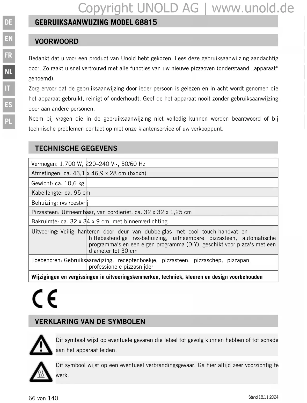 Dit symbool wijst op eventuele gevaren die letsel tot gevolg kunnen hebben of tot schade aan het apparaat leiden. Dit symbool wijst op een eventueel verbrandingsgevaar. Ga hier altijd zeer voorzichtig te werk. Copyright UNOLD AG | www.unold.deStand 18.11.2024 67 von 140