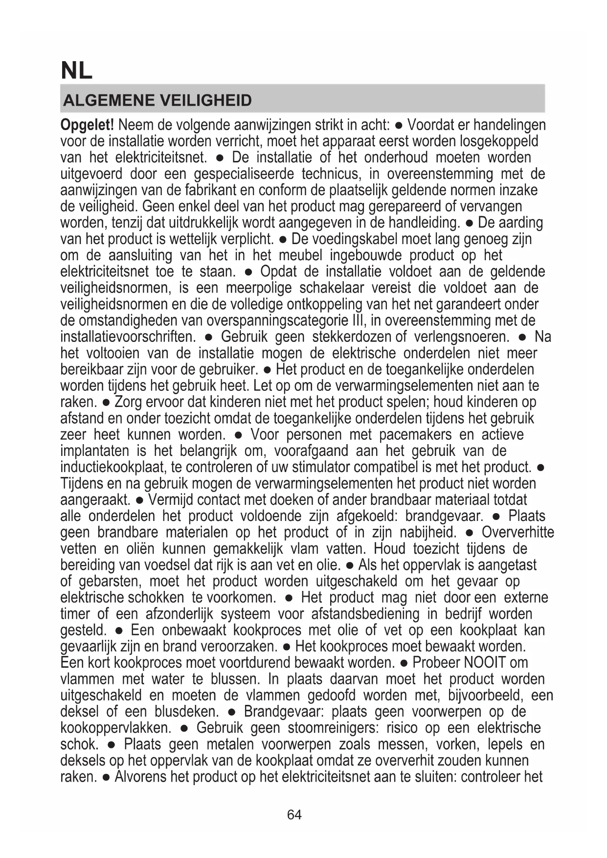 63NL ALGEMENE VEILIGHEID Opgelet! Neem de volgende aanwijzingen strikt in acht: ● Voordat er handelingen voor de installatie worden verricht, moet het apparaat eerst worden losgekoppeld van het elektriciteitsnet. ● De installatie of het onderhoud moeten worden uitgevoerd door een gespecialiseerde technicus, in overeenstemming met de aanwijzingen van de fabrikant en conform de plaatselijk geldende normen inzake de veiligheid. Geen enkel deel van het product mag gerepareerd of vervangen worden, tenzij dat uitdrukkelijk wordt aangegeven in de handleiding. ● De aarding van het product is wettelijk verplicht. ● De voedingskabel moet lang genoeg zijn om de aansluiting van het in het meubel ingebouwde product op het elektriciteitsnet toe te staan. ● Opdat de installatie voldoet aan de geldende veiligheidsnormen, is een meerpolige schakelaar vereist die voldoet aan de veiligheidsnormen en die de volledige ontkoppeling van het net garandeert onder de omstandigheden van overspanningscategorie III, in overeenstemming met de installatievoorschriften. ● Gebruik geen stekkerdozen of verlengsnoeren. ● Na het voltooien van de installatie mogen de elektrische onderdelen niet meer bereikbaar zijn voor de gebruiker. ● Het product en de toegankelijke onderdelen worden tijdens het gebruik heet. Let op om de verwarmingselementen niet aan te raken. ● Zorg ervoor dat kinderen niet met het product spelen; houd kinderen op afstand en onder toezicht omdat de toegankelijke onderdelen tijdens het gebruik zeer heet kunnen worden. ● Voor personen met pacemakers en actieve implantaten is het belangrijk om, voorafgaand aan het gebruik van de inductiekookplaat, te controleren of uw stimulator compatibel is met het product. ● Tijdens en na gebruik mogen de verwarmingselementen het product niet worden aangeraakt. ● Vermijd contact met doeken of ander brandbaar materiaal totdat alle onderdelen het product voldoende zijn afgekoeld: brandgevaar. ● Plaats geen brandbare materialen op het product of in zijn nabijheid. ● Oververhitte vetten en oliën kunnen gemakkelijk vlam vatten. Houd toezicht tijdens de bereiding van voedsel dat rijk is aan vet en olie. ● Als het oppervlak is aangetast of gebarsten, moet het product worden uitgeschakeld om het gevaar op elektrische schokken te voorkomen. ● Het product mag niet door een externe timer of een afzonderlijk systeem voor afstandsbediening in bedrijf worden gesteld. ● Een onbewaakt kookproces met olie of vet op een kookplaat kan gevaarlijk zijn en brand veroorzaken. ● Het kookproces moet bewaakt worden. Een kort kookproces moet voortdurend bewaakt worden. ● Probeer NOOIT om vlammen met water te blussen. In plaats daarvan moet het product worden uitgeschakeld en moeten de vlammen gedoofd worden met, bijvoorbeeld, een deksel of een blusdeken. ● Brandgevaar: plaats geen voorwerpen op de kookoppervlakken. ● Gebruik geen stoomreinigers: risico op een elektrische schok. ● Plaats geen metalen voorwerpen zoals messen, vorken, lepels en deksels op het oppervlak van de kookplaat omdat ze oververhit zouden kunnen raken. ● Alvorens het product op het elektriciteitsnet aan te sluiten: controleer het 64typeplaatje (op de onderkant van het product) om er zeker van te zijn dat de spanning en het vermogen overeenkomen met die van het elektriciteitsnet en controleer of het stopcontact geschikt is. Neem in geval van twijfel contact op met een gekwalificeerde elektricien. Belangrijk: ● Schakel de kookplaat na gebruik uit door middel van het bedieningspaneel en vertrouw daarbij niet op de pan-detector. ● Om het morsen van vloeistoffen te voorkomen moet, voor het koken of verwarmen van vloeistoffen, de warmtetoevoer beperkt worden. ● Laat de verwarmingselementen niet ingeschakeld met lege pannen of potten, of zonder pannen. ● Na de beëindiging van het kookproces moet de betreffende kookzone worden uitgeschakeld. ● Gebruik bij het koken nooit vellen aluminiumfolie en plaats met aluminium verpakte producten nooit rechtstreeks op het product. Aluminium zou kunnen smelten en uw product onherstelbaar beschadigen. ● Warm nooit een blikje met voedingsmiddelen op zonder het eerst te openen: het zou kunnen ontploffen! Deze waarschuwing geldt ook voor alle andere soorten kookplaten. ● Het gebruik van een hoog vermogen, zoals de functie Booster, is niet geschikt voor het verwarmen van bepaalde vloeistoffen, zoals bijvoorbeeld bakolie. De overmatige hitte zou gevaarlijk kunnen zijn. In dit geval raden wij het gebruik van een lager vermogen aan. ● De pannen moeten rechtstreeks op de kookplaat en in het midden van de kookzones worden geplaatst. Plaats in geen geval andere voorwerpen tussen de pan en de kookplaat. ● In geval van hoge temperaturen, vermindert het product automatisch het vermogensniveau van de kookzones. ● Voordat er werkzaamheden voor reiniging of onderhoud worden uitgevoerd, moet het product worden losgekoppeld van het elektriciteitsnet door de stekker te verwijderen of de hoofdschakelaar van de woning uit te schakelen. ● Maak tijdens alle handelingen voor installatie en onderhoud altijd gebruik van werkhandschoenen. ● De product mag gebruikt worden door kinderen vanaf 8 jaar oud en door personen met verminderde lichamelijke, zintuiglijke of geestelijke vermogens, of met gebrek aan ervaring of de nodige kennis, mits deze onder toezicht staan of nadat ze aanwijzingen hebben ontvangen over het veilige gebruik van het product en ze de bij het gebruik betrokken gevaren begrepen hebben. ● Kinderen moeten onder toezicht staan om ervoor te zorgen dat ze niet met het product spelen. ● De reiniging en het onderhoud mogen niet worden uitgevoerd door kinderen die niet onder toezicht staan. ● Als het product gelijktijdig wordt gebruikt met andere apparaten die gas of andere brandstoffen verbranden, moet de ruimte beschikken over een voldoende ventilatie. ● Het product moet zowel aan de binnen- als de buitenkant regelmatig worden gereini