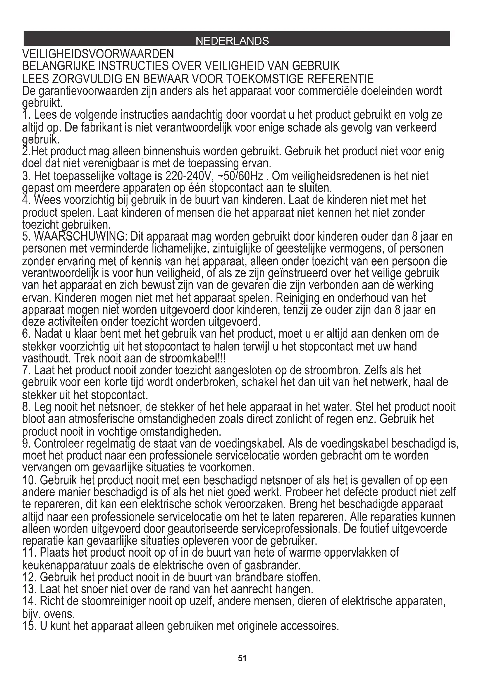 14. Richt de stoomreiniger nooit op uzelf, andere mensen, dieren of elektrische apparaten,