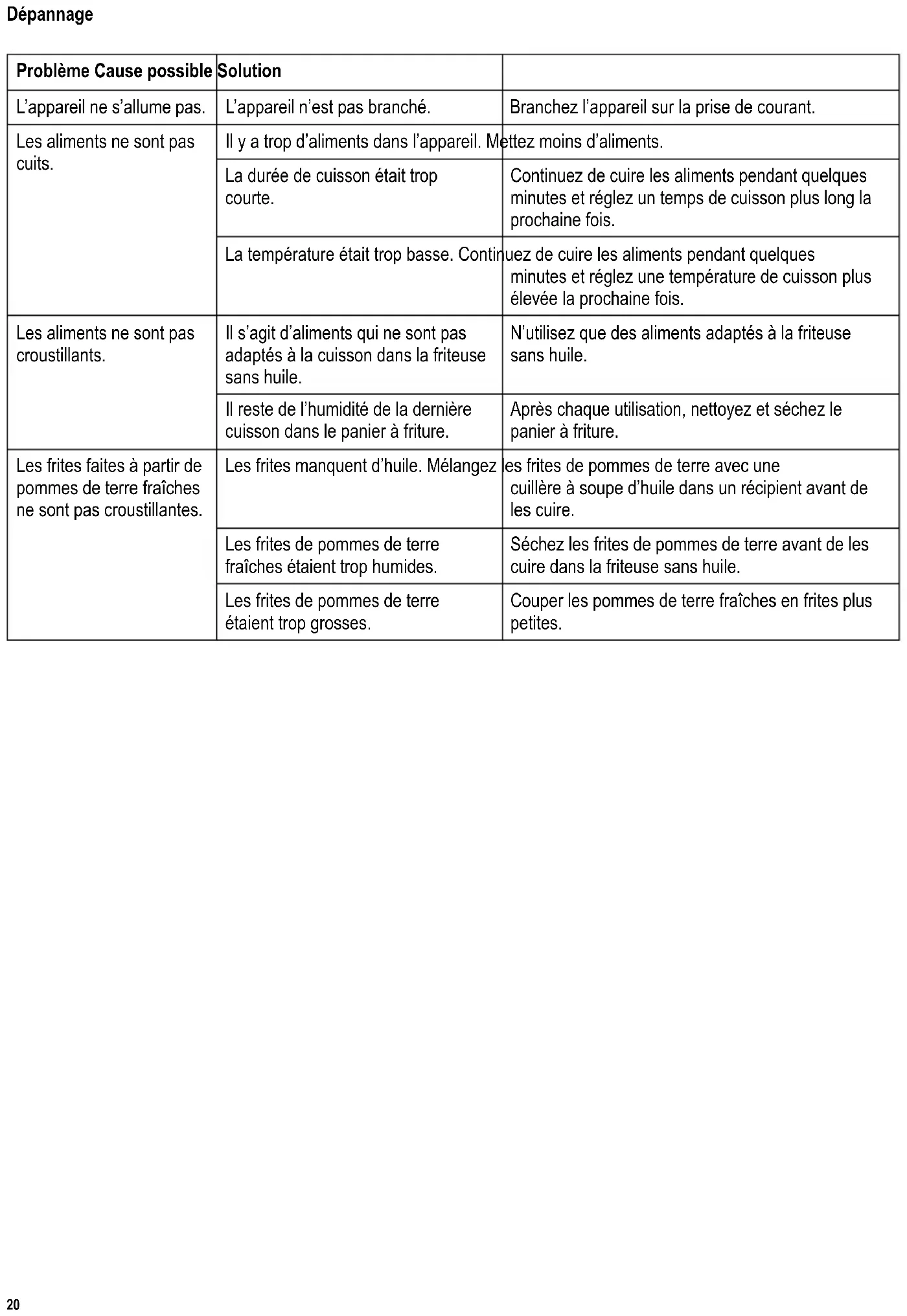 Gebruikmaken van de automatische programma’s, stap 4-9.25 142 x 208 mm Handige tips voor hetelucht frituren ∙ U kunt uw voedsel bereiden met behulp van de automatische basis instellingen, of de instellingen naar eigen wens regelen. ∙ Let er op dat de kooktijden die vermeld staan slechts tijden bij benadering zijn. Afhankelijk van het soort voedsel, moeten de kooktijden en temperaturen misschien aangepast worden. ∙ Bij grotere hoeveelheden, neemt de benodigde kooktijd toe. Wij raden aan het voedsel regelmatig om te keren. Tip! Bij de bereiding van een diepvriespizza moet de pizza na de helft van de tijd voor een gelijkmatig garen gedraaid worden. ∙ Als het voedsel te donker wordt, probeer dan eerst de temperatuur te verlagen voordat de kooktijden verkort worden. ∙ Voor voedzaam, en gezond frituren raden wij een temperatuurinstelling aan van niet meer dan 170 °C voor zetmeel houdend voedsel, m.a.w. eten met hogere dan gemiddelde zetmeelinhoud. Een verlaagde frituurtemperatuur, gecombineerd met een gelijkmatig verminderde hoeveelheid voedsel, zal op zijn beurt de vorming van voor de gezondheid schadelijke substanties tot een minimum beperken. Onderhoud en schoonmaken ∙ Trek voor het reinigen de stekker uit het stopcontact en laat de airfryer goed afkoelen. ∙ Waarschuwing: Om elektrische schokken te voorkomen, maak de buitenkant van de frituurpan of het snoer nooit schoon met vloeistoffen en dompel geen van beide ooit onderwater. ∙ Gebruik geen agressieve of schurende reinigingsmiddelen om krassen op de behuizing en de antiaanbaklaag van de frituurkorf en de druppelplaat te voorkomen. ∙ Reinig alle uitneembare inzetstukken in een sopje en droog ze grondig af, of reinig ze in de vaatwasser. ∙ Veeg de behuizing en de gaarruimte af met een vochtige doek. De deur wegnemen ∙ Voor een gemakkelijker reinigen kan de deur van het apparaat afgenomen worden. ∙ Open daartoe de deur. ∙ Schuif de schuiver aan het scharnier van de deur (OPEN) naar links, en neem de deur naar boven af. ∙ Veeg de deur vochtig af. Niet in water onderdompelen! ∙ De droge deur terugplaatsen. ∙ Het apparaat kan niet zonder deur worden ingeschakeld. Afval weggooien Instrumenten gemerkt met dit symbool moeten apart weggegooid worden van het huishoudelijke afval, daar deze waardevolle materialen bevatten welke men kan recyclen. Juist wegdoen zal het milieu en de menselijke gezondheid beschermen. De plaatselijke autoriteit of handelaar kan daar informatie over geven.26 142 x 208 mm Het verhelpen van storingen Probleem Mogelijke oorzaak Oplossing Het apparaat kan niet ingeschakeld worden. De stekker zit niet in het stopcontact. Steek de stekker in het stopcontact. Het voedsel is niet gaar. Er is teveel voedsel ingebracht. Breng minder voedsel in. De bereidingsduur was te kort. Het voedsel enkele minuten nagaren, en de volgende maal een langere looptijd instellen. De temperatuur was te laag. De voeding enkele minuten nagaren, en de volgende keer een hogere temperatuur instellen. De voeding is niet knapperig geworden. Er werd voeding gebruikt, die niet geschikt is voor bereiding in een airfryer. Gebruik enkel levensmiddelen, geschikt voor bereiding in een airfryer. In de frituurkorf bleef vocht achter van de vorige bereiding. De frituurkorf na elk gebruik reinigen en afdrogen. Frieten van verse aardappelen zijn niet knapperig. Aan de frieten ontbreekt olie. De gesneden frieten voor de bereiding in een kom samen met een eetlepel olie mengen. De gesneden aardappelen waren te vochtig. De gesneden aardappelen voor het bereiden in de airfryer drogen. De gesneden aardappelen waren te groot. De aardappelen in kleinere stukken snijden.27 142 x 208 mm Freidora por aire caliente Estimado Cliente, Antes de utilizar el aparato, lea atentamente estas instrucciones y conserve este manual para cualquier consulta posterior. El aparato sólo debe ser usado por personas que se han familiarizado con estas instrucciones. Conexión a la red eléctrica Debe conectar este aparato solamente a una toma de tierra instalada según las normas en vigor. Asegúrese de que la tensión de la red coincide con la tensión indicada en la placa de características. Este producto cumple con las directivas obligatorias que acompañan el etiquetado de la CEE. Elementos componentes