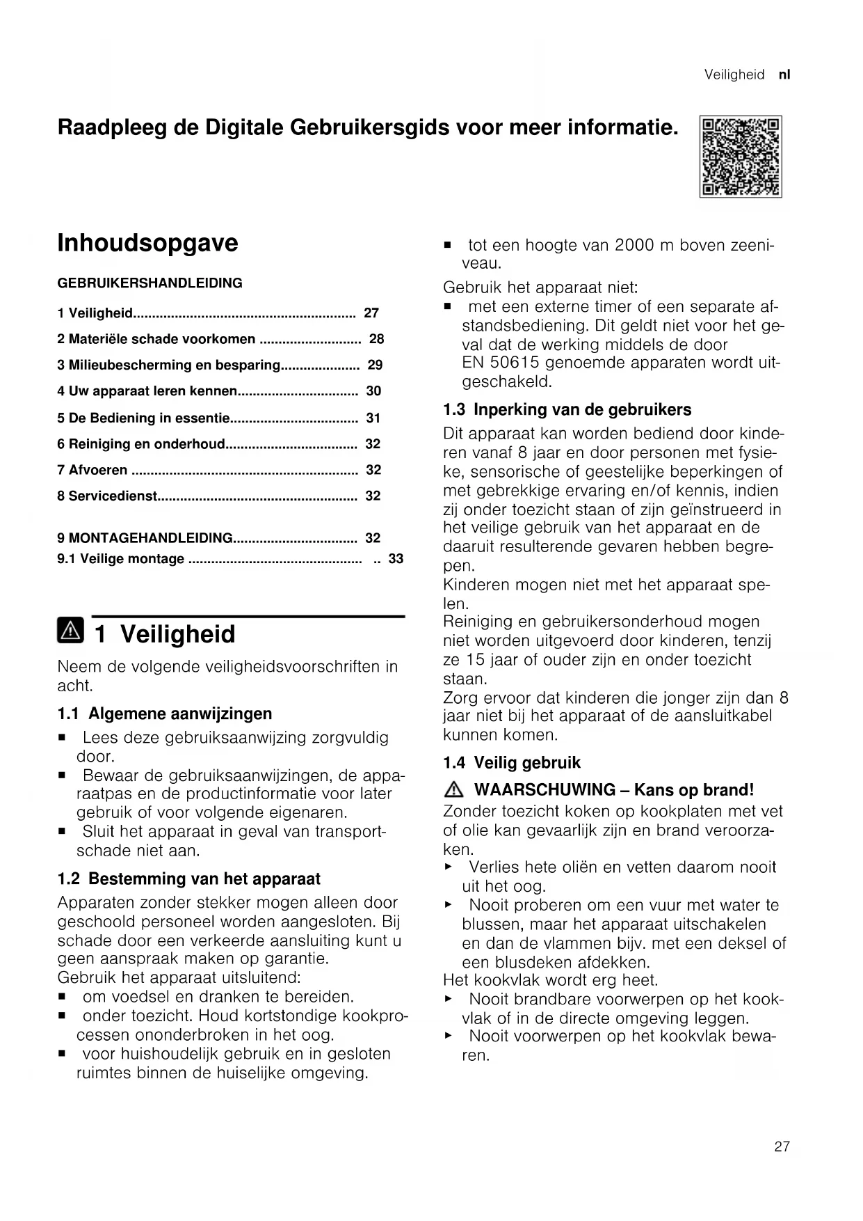 1 Veiligheid Neem de volgende veiligheidsvoorschriften in acht. 1.1 Algemene aanwijzingen ¡ Lees deze gebruiksaanwijzing zorgvuldig door. ¡ Bewaar de gebruiksaanwijzingen, de appa- raatpas en de productinformatie voor later gebruik of voor volgende eigenaren. ¡ Sluit het apparaat in geval van transport- schade niet aan. 1.2 Bestemming van het apparaat Apparaten zonder stekker mogen alleen door geschoold personeel worden aangesloten. Bij schade door een verkeerde aansluiting kunt u geen aanspraak maken op garantie. Gebruik het apparaat uitsluitend: ¡ om voedsel en dranken te bereiden. ¡ onder toezicht. Houd kortstondige kookpro- cessen ononderbroken in het oog. ¡ voor huishoudelijk gebruik en in gesloten ruimtes binnen de huiselijke omgeving. ¡ tot een hoogte van 2000m boven zeeni- veau. Gebruik het apparaat niet: ¡ met een externe timer of een separate af- standsbediening. Dit geldt niet voor het ge- val dat de werking middels de door EN50615 genoemde apparaten wordt uit- geschakeld. 1.3 Inperking van de gebruikers Dit apparaat kan worden bediend door kinde- ren vanaf 8 jaar en door personen met fysie- ke, sensorische of geestelijke beperkingen of met gebrekkige ervaring en/of kennis, indien zij onder toezicht staan of zijn geïnstrueerd in het veilige gebruik van het apparaat en de daaruit resulterende gevaren hebben begre- pen. Kinderen mogen niet met het apparaat spe- len. Reiniging en gebruikersonderhoud mogen niet worden uitgevoerd door kinderen, tenzij ze 15jaar of ouder zijn en onder toezicht staan. Zorg ervoor dat kinderen die jonger zijn dan 8 jaar niet bij het apparaat of de aansluitkabel kunnen komen. 1.4 Veilig gebruik WAARSCHUWING‒Kans op brand! Zonder toezicht koken op kookplaten met vet of olie kan gevaarlijk zijn en brand veroorza- ken. ▶ Verlies hete oliën en vetten daarom nooit uit het oog. ▶ Nooit proberen om een vuur met water te blussen, maar het apparaat uitschakelen en dan de vlammen bijv. met een deksel of een blusdeken afdekken. Het kookvlak wordt erg heet. ▶ Nooit brandbare voorwerpen op het kook- vlak of in de directe omgeving leggen. ▶ Nooit voorwerpen op het kookvlak bewa- ren.nl Materiële schade voorkomen